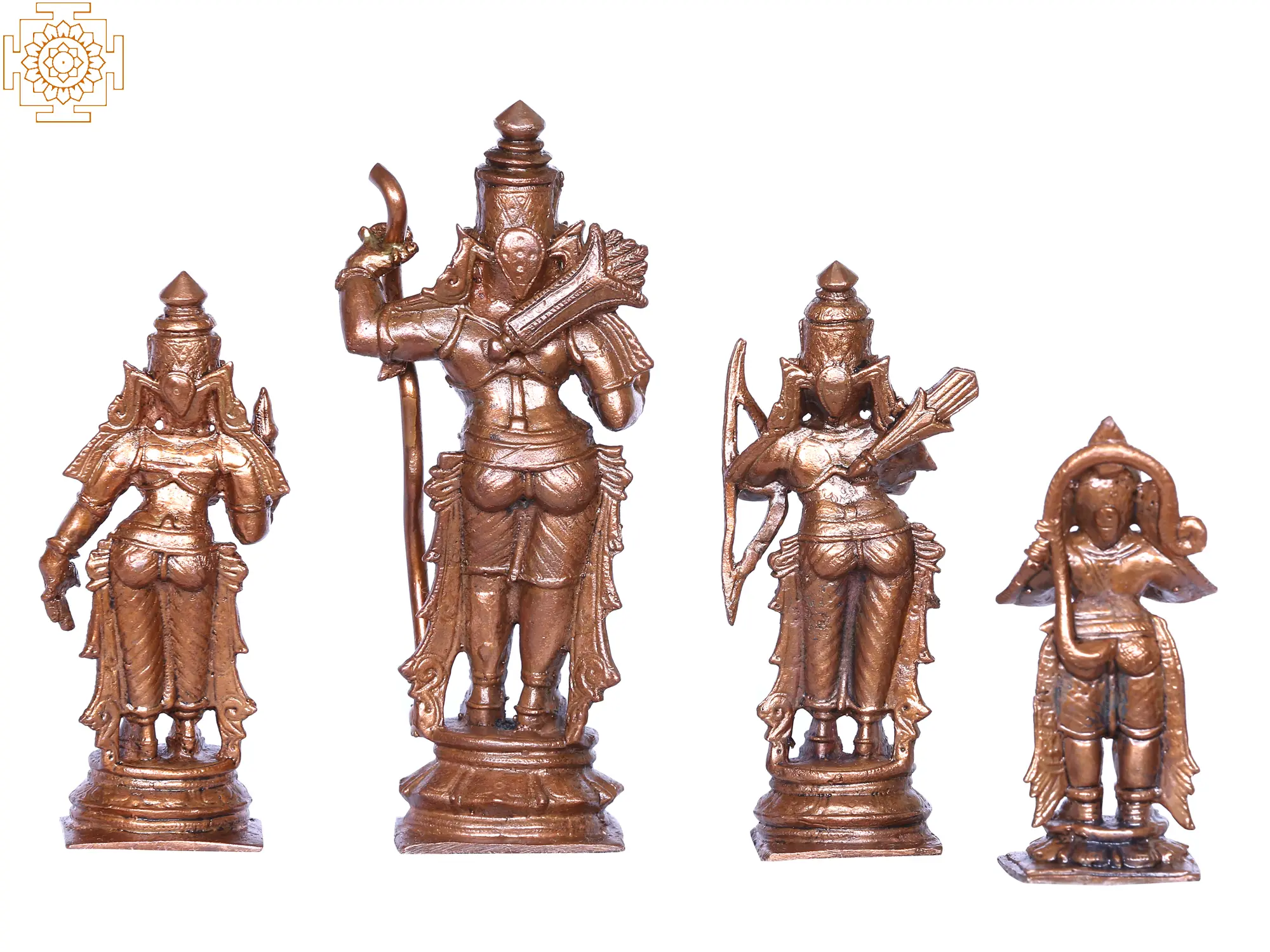 This Bronze Set of Ramdarbar Statues is a remarkable ensemble capturing the divine essence of Lord Rama, Sita, Lakshmana, and Hanuman. Meticulously crafted in bronze, this set radiates the artistic brilliance of Indian craftsmanship. Lord Rama stands as the epitome of virtue and righteousness, accompanied by his consort Sita, devoted brother Lakshmana, and the steadfast devotee Hanuman. The statues intricately detail their divine attire, expressions, and iconic attributes, reflecting the sacred narrative of the Ramayana.