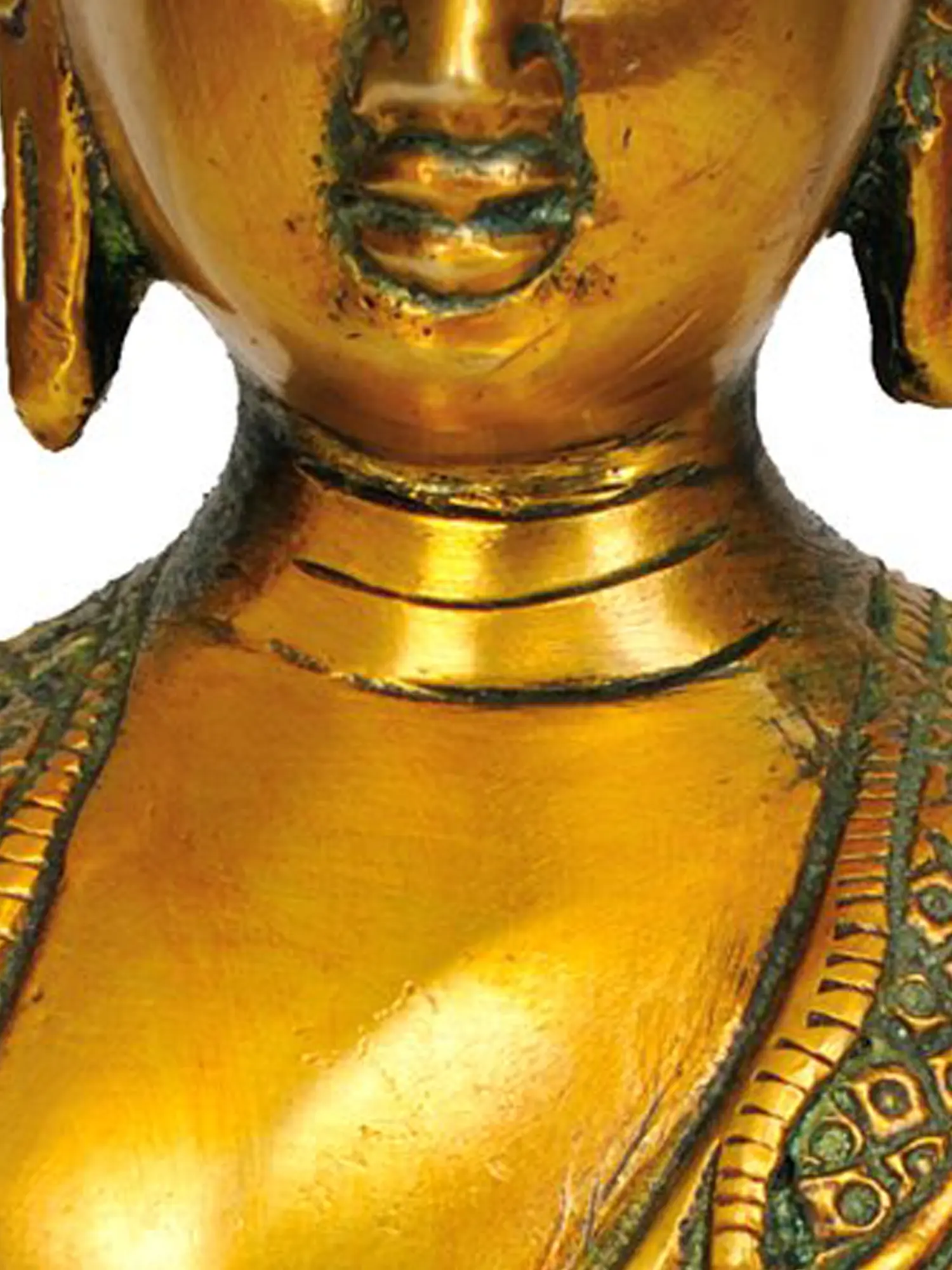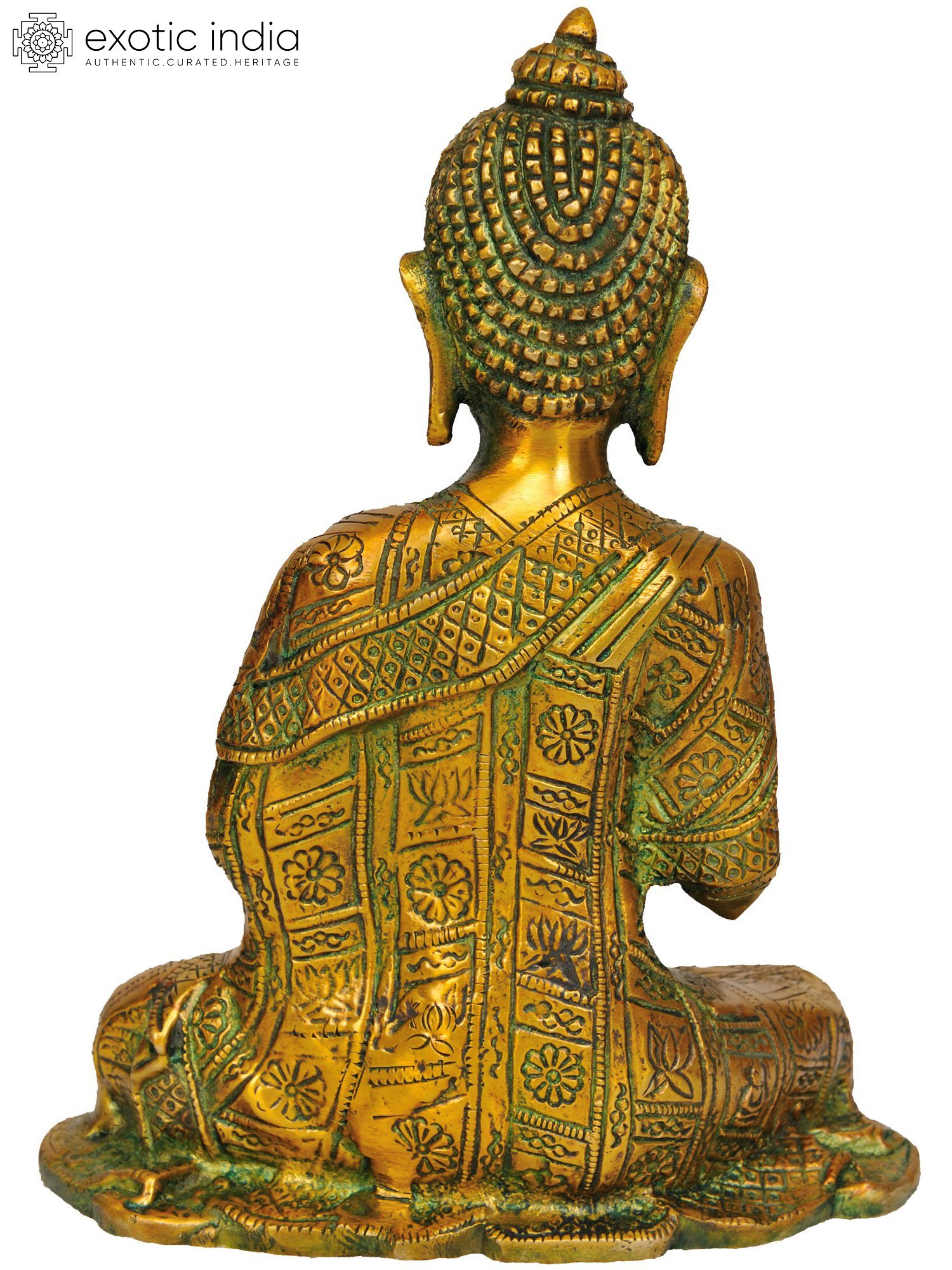 This exquisite brass statue captures the serene presence of the Buddha, radiating an aura of peace and profound wisdom. Seated in the traditional Padmasana (lotus pose), the figure embodies the ultimate state of enlightenment, a beacon of hope and a reminder of the path to inner tranquility. The intricate detailing of the robes, adorned with delicate patterns, speaks to the artisan's skill and dedication, transforming mere metal into a sacred object of contemplation. The golden sheen of the brass further enhances the divine aura, symbolizing purity and auspiciousness.