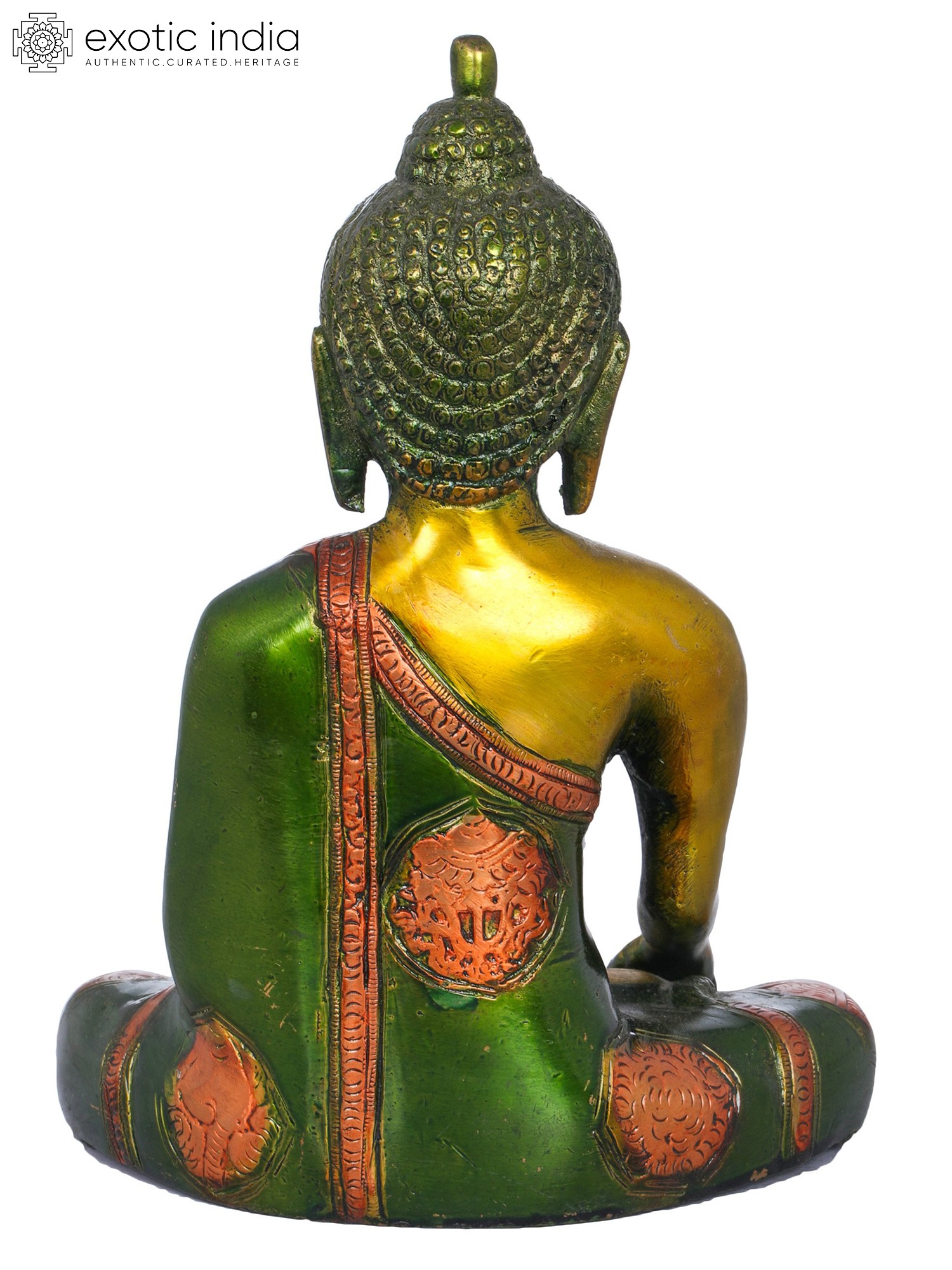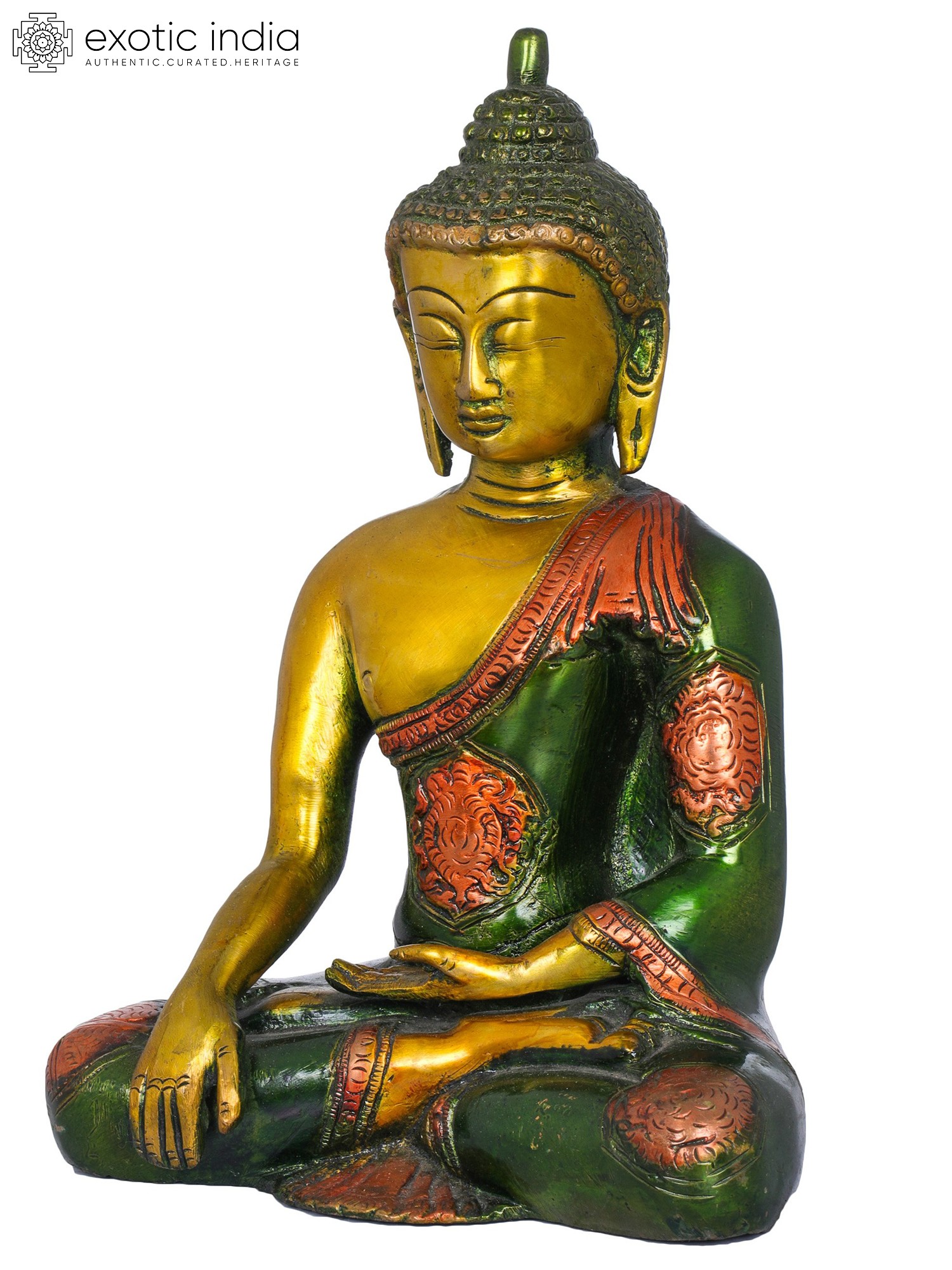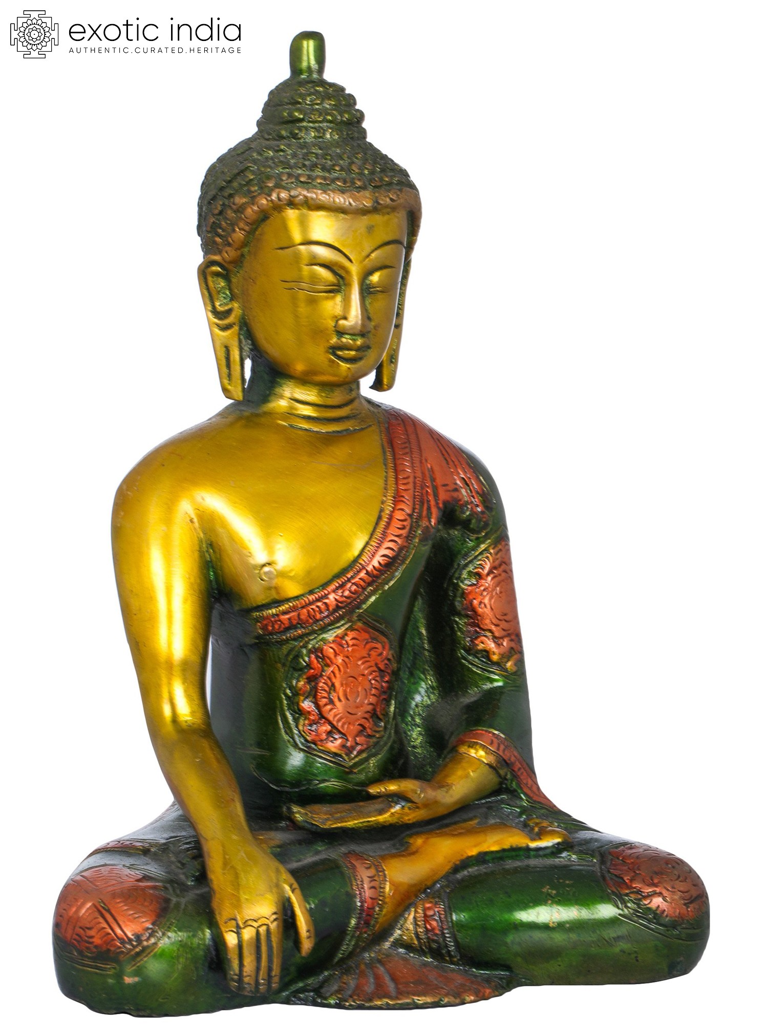 Crafted with meticulous attention to detail by skilled artisans in India, this statue embodies the rich artistic heritage of the subcontinent. The gleaming brass not only lends a timeless elegance to the piece but also holds symbolic meaning in many cultures, often associated with purity, prosperity, and divine energy. The serene facial expression, with its closed eyes and gentle smile, conveys a deep sense of peace and wisdom. The intricate carving of the monastic robe, adorned with delicate patterns, speaks to the craftsmanship and dedication involved in its creation. The posture, seated in a meditative cross-legged position, further enhances the aura of tranquility and focus. ––––––––––––––––––