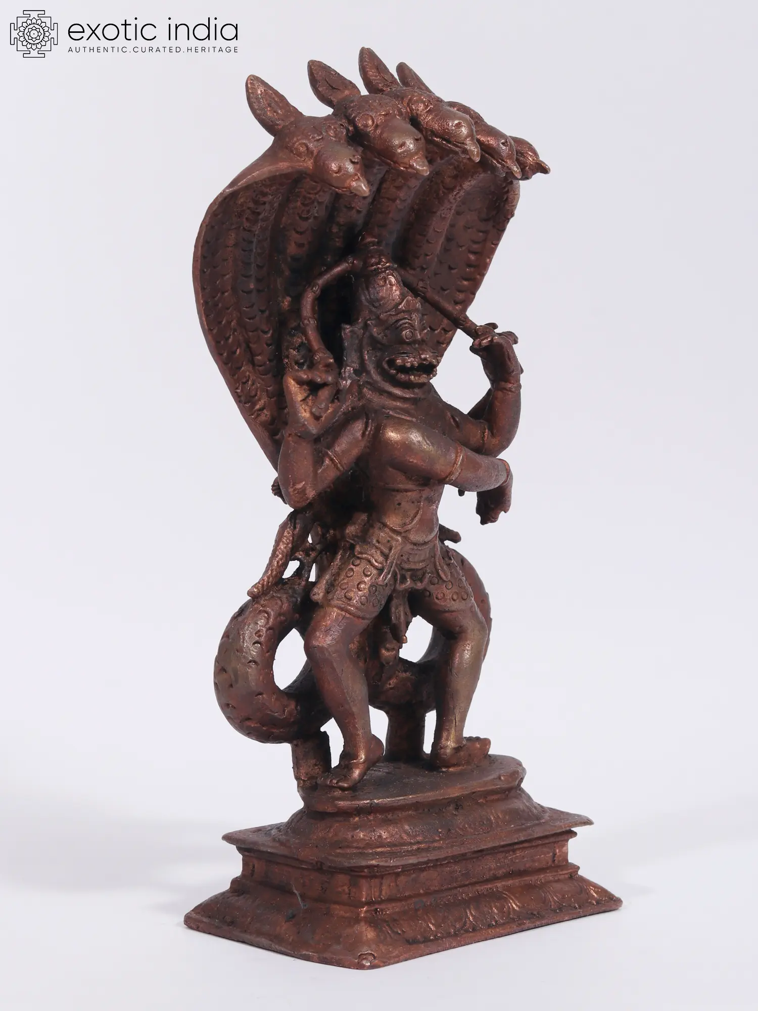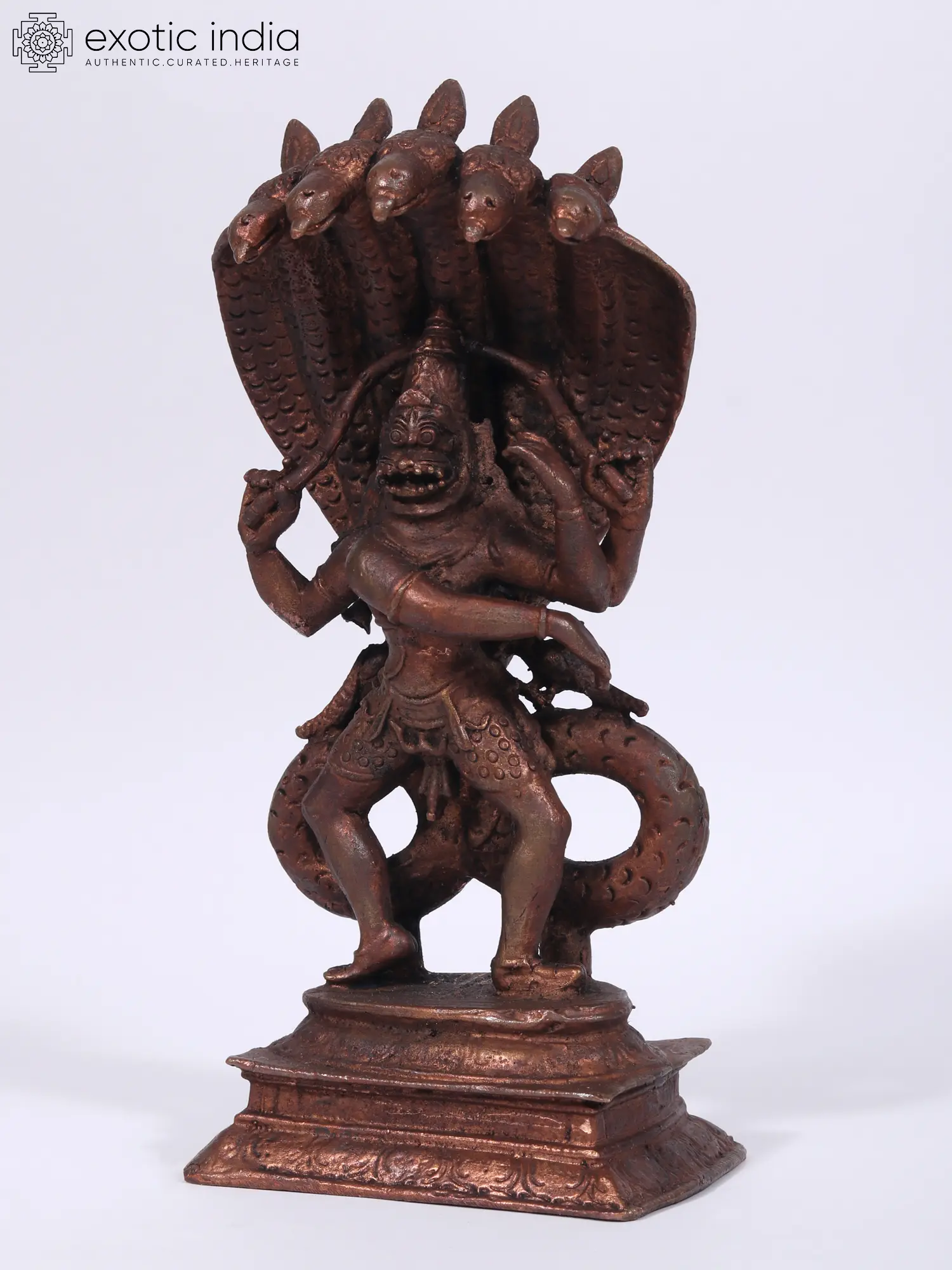 The depiction of Lord Narasimha, the Fourth Incarnation of Lord Vishnu, in this portrayal is awe-inspiring. Capturing the essence of his fierce form, Narasimha engages in a Tandava, a divine dance. The distinctive characteristics, including his iconic open mouth, Chaturbhuj form wielding a whip like object, probably the intestines of Hiranyakashyap which he took off while ripping off his stomach.