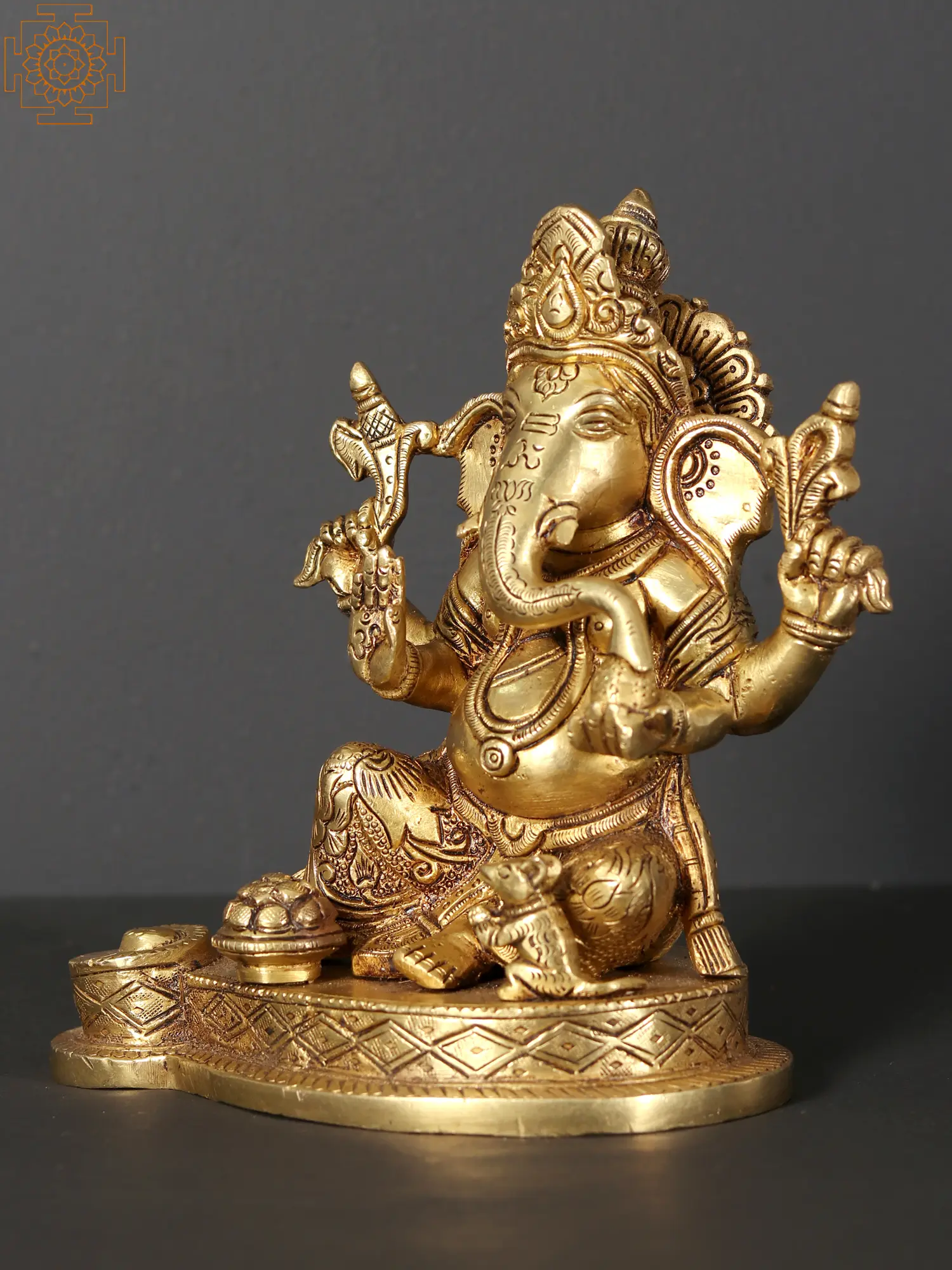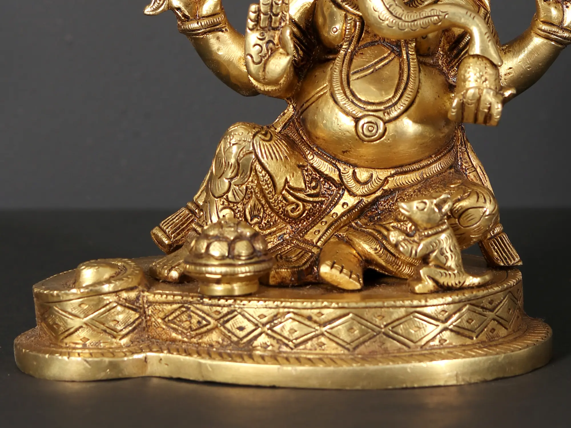 The Chaturbhuja Bhagawan Ganapati Brass Statue embodies profound symbolism. With four hands, Lord Ganesha is depicted in a powerful form. Two hands hold the conch, symbolizing the divine sound that removes obstacles, and the noose, representing the power to capture and bind negativity. One hand offers a blessing, bestowing grace and protection, while the other holds a modak, the sweet treat that signifies fulfilment and abundance. Seated on a mango pedestal, which represents prosperity and spiritual attainment, Lord Ganesha exudes a sense of stability and divine wisdom. The intricate carvings enhance the statue's beauty, and the mooshak, the mouse, gazes upon Lord Ganesha with reverence, representing the subjugation of desire and ego in the presence of the divine.