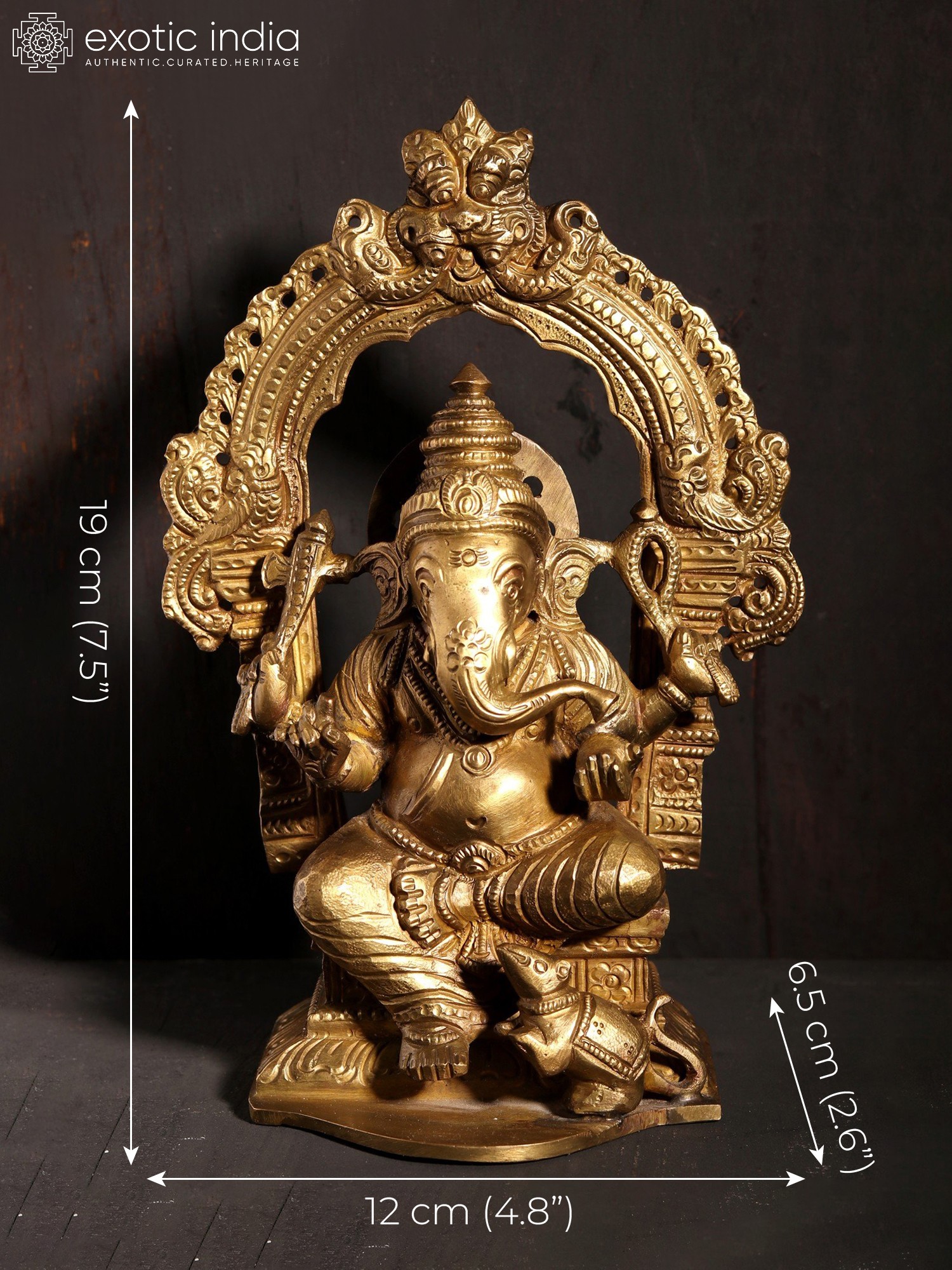 The Kirtimukha, often depicted as a fierce face, signifies protection and strength, enhancing the divine presence of Ganesha. The craftsmanship captures Ganesha’s gentle expression, detailed attributes such as his mouse vehicle (Mushaka), and the various symbolic items he holds in his hands, including a modak (sweet), an axe, a noose, a trunk, and a lotus.