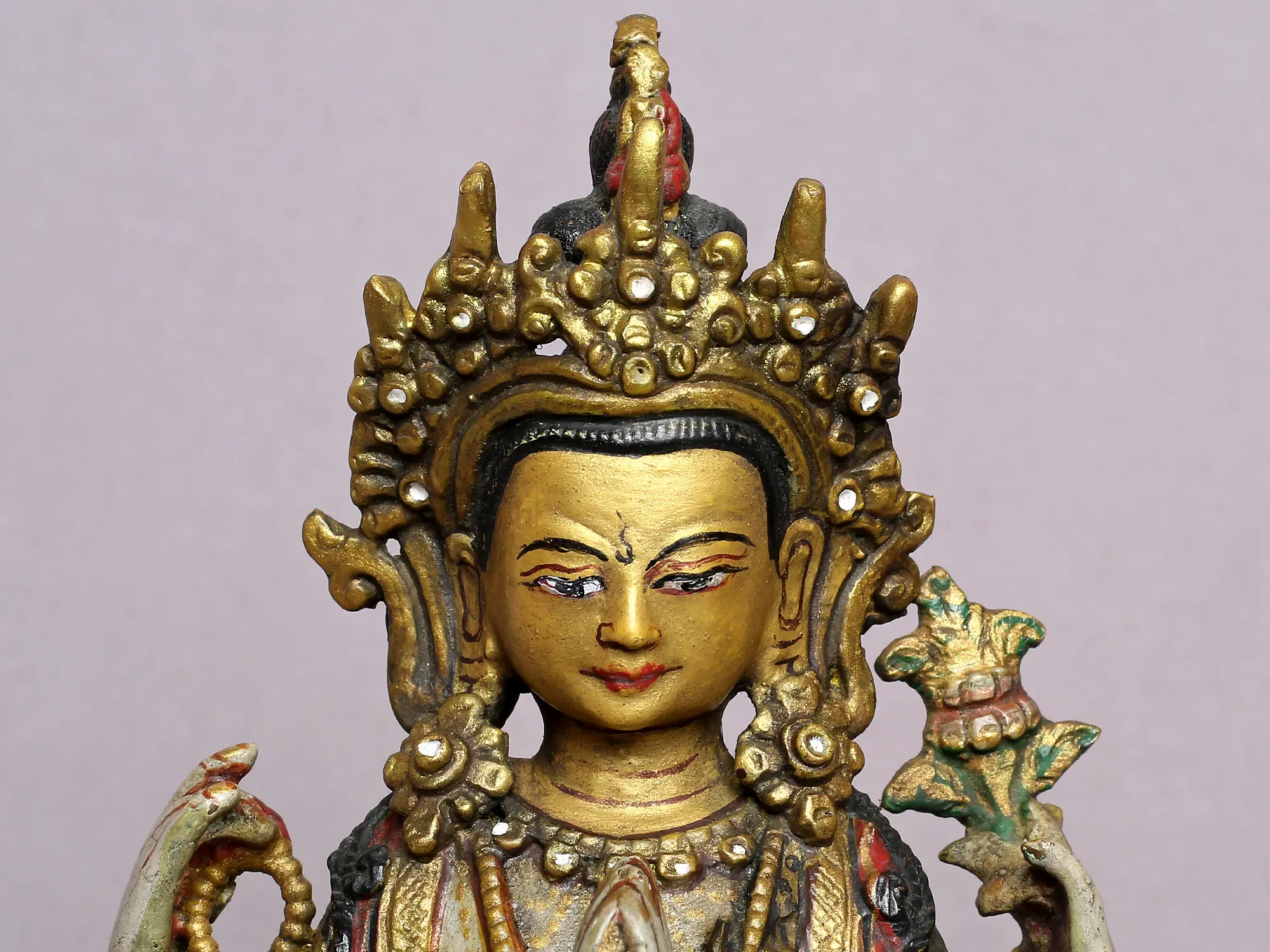 Nepalese statues and sculptures have a high copper content and therefore develop a slightly reddish patina on the surface as they age. However, the most unique feature of Nepalese copper statues is their decorative detailing. The pieces are heavily gilded and sometimes inlaid with semi-precious stones. This embellishment protects them from getting tarnished. The traditional lost-wax method for casting Nepalese copper statues remains the most practiced technique in Nepal for many centuries. This process involves many steps and requires skilled artists.