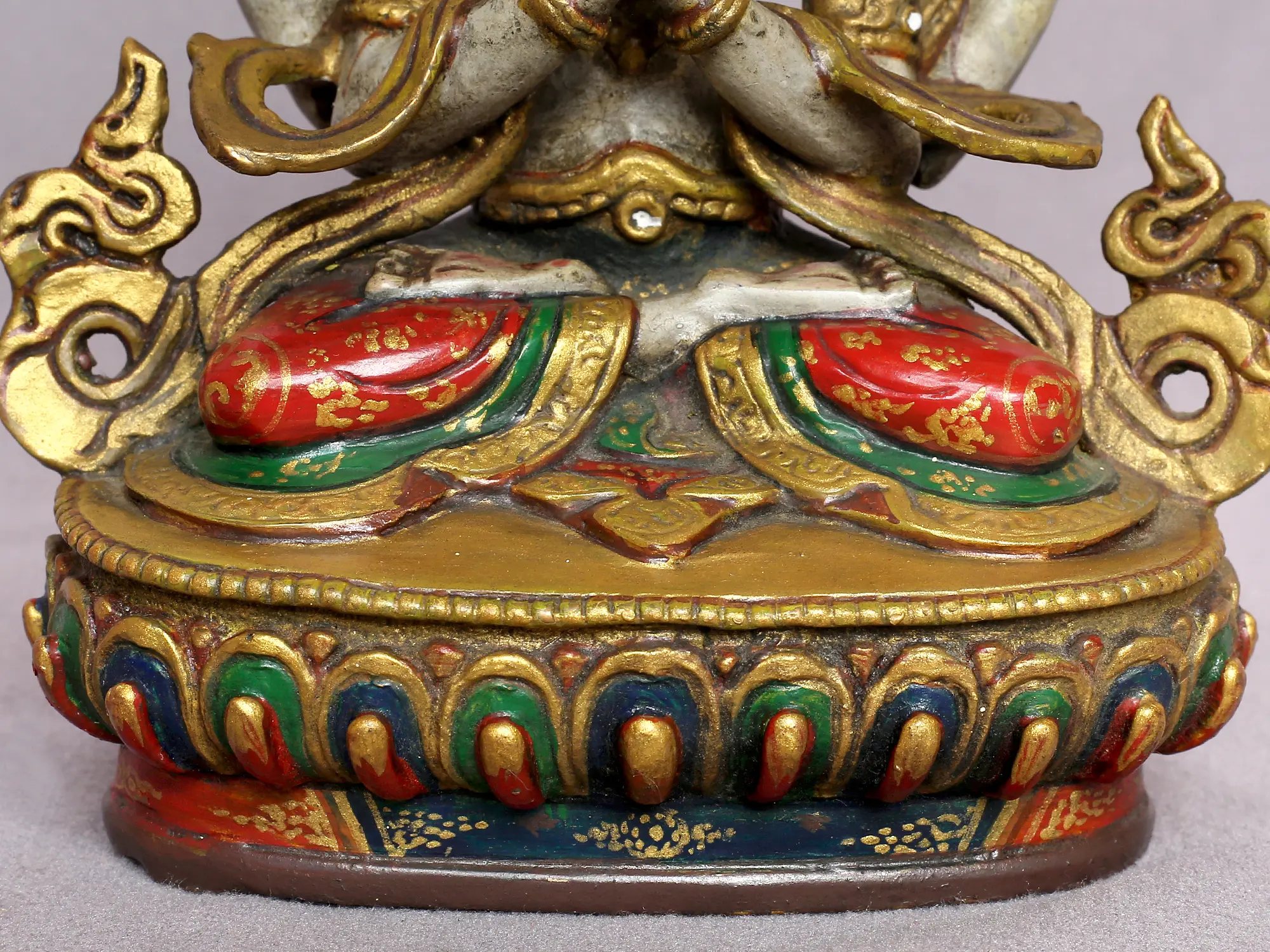 Crafted from durable copper and lavishly gilded with gold, this statue possesses a timeless beauty and spiritual aura. The gold gilding not only enhances its visual appeal, catching the light and imbuing it with a divine glow, but also symbolizes purity and transcendence. Each element of the sculpture is meticulously rendered, showcasing the deep understanding of iconography and aesthetic principles that have been passed down through generations of Nepalese artists. This piece serves as a powerful focal point for meditation, prayer, or as a sacred adornment in any spiritual space, inviting contemplation on the path of compassion and enlightenment.