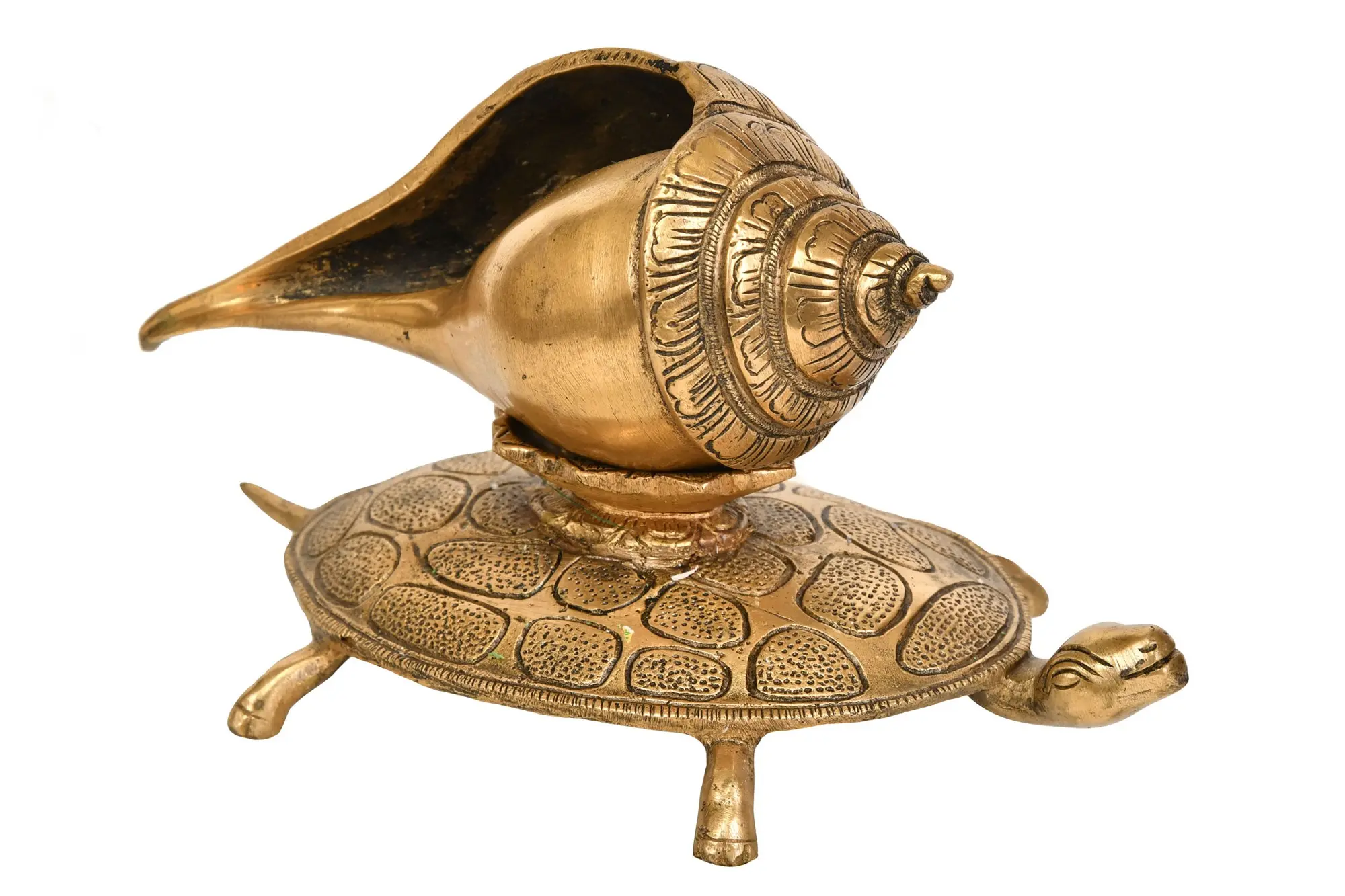 A Conch on Tortoise in Brass is a symbolic masterpiece, intricately crafted with a dark brass tint adorned with elaborate carvings. This exquisite piece embodies the profound relationship between two significant symbols in Hindu tradition. The conch, or "shankha," is a sacred emblem of Lord Vishnu, signifying the sound of creation and the divine presence. It is often used during religious ceremonies and rituals. The tortoise, known as "kurma," represents stability and support, as the mythical Kurma avatar of Lord Vishnu used a tortoise shell to support Mount Mandara during the churning of the cosmic ocean. Together, the conch and tortoise in this brass sculpture symbolize divine harmony, stability, and creation – a powerful representation of Hindu spirituality and tradition.