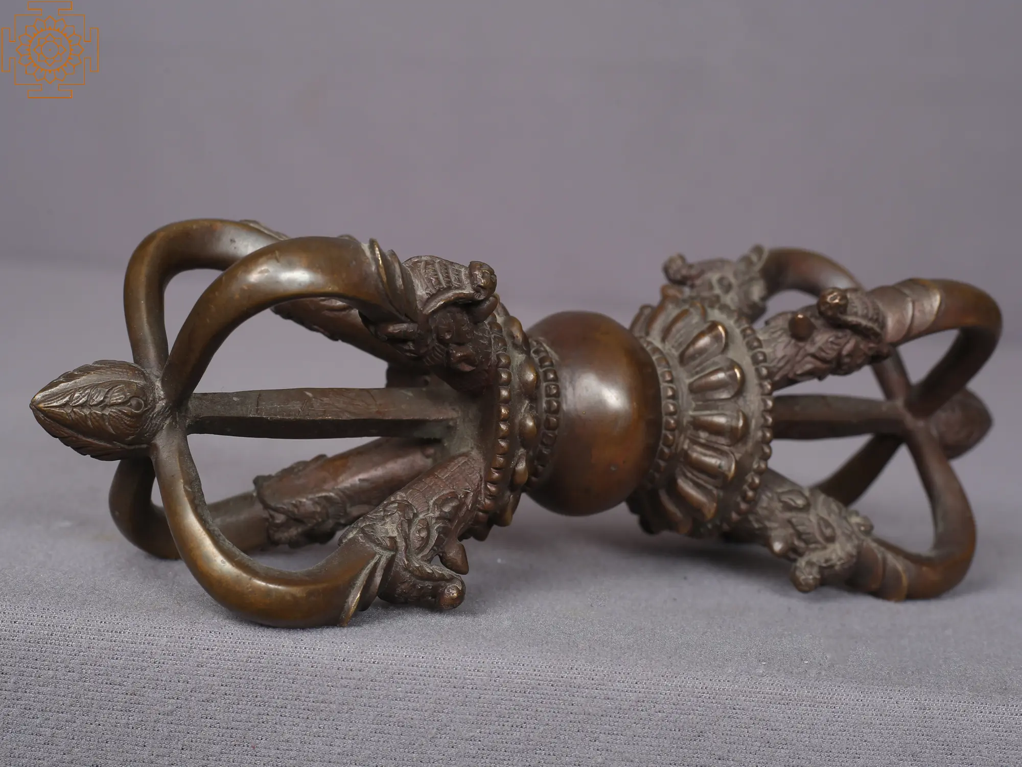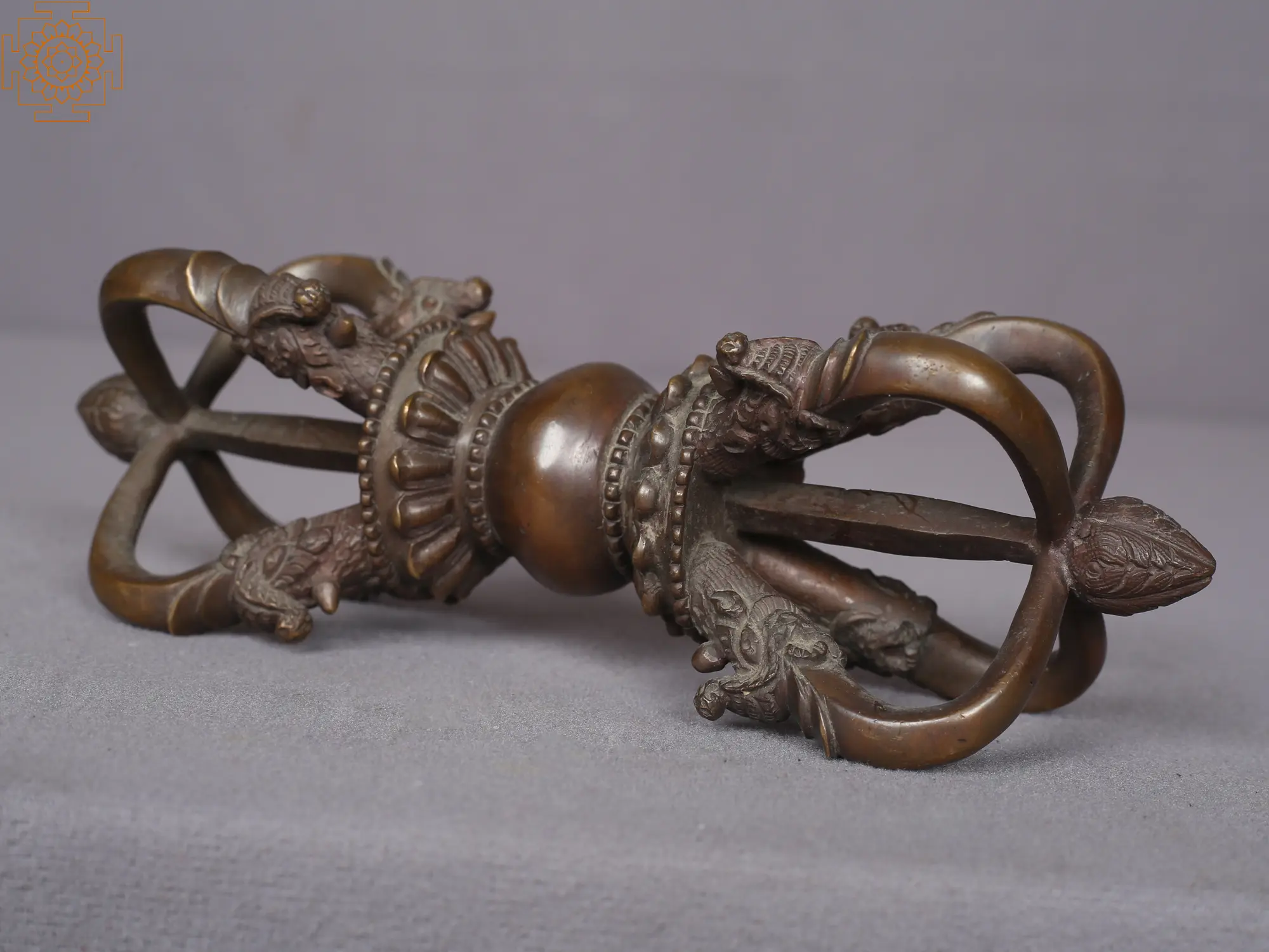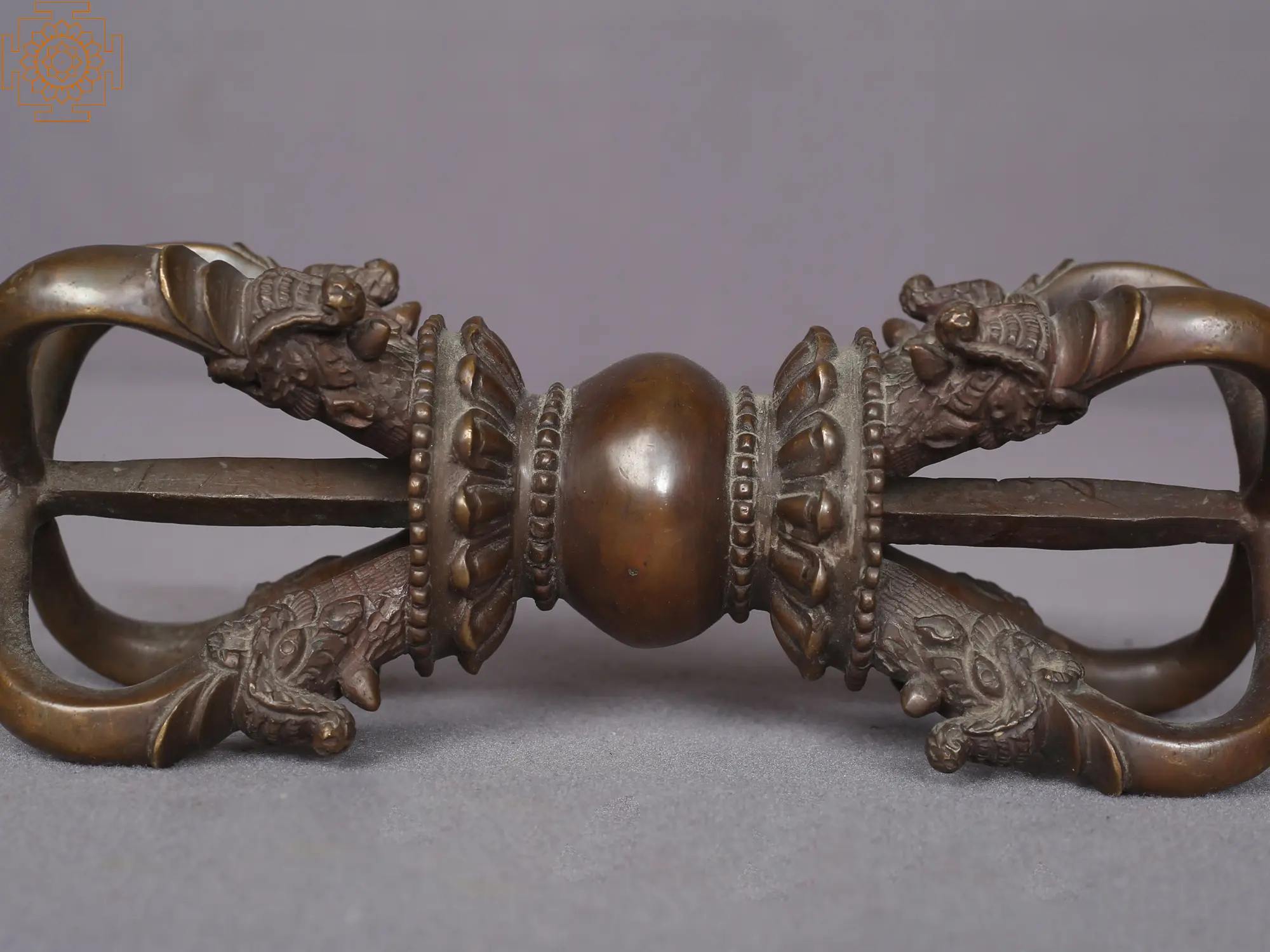 The vajra, meaning "thunderbolt" or "diamond" in Sanskrit, is a central symbol in Vajrayana Buddhism, representing the indestructible and unstoppable nature of enlightenment, compassion, and wisdom. It is often paired with the ghanta (bell), symbolizing the union of wisdom and compassion, the inseparable duality of reality. This particular piece, with its five prongs, signifies the five Dhyani Buddhas, who embody different aspects of enlightened consciousness, and also represents the five elements. The central sphere is thought to represent the primal essence from which all phenomena arise. The fearsome yet protective heads that emerge from the center are often depicted as Makaras or other mythical beasts, symbolizing the taming of negative forces and the subjugation of ignorance.
