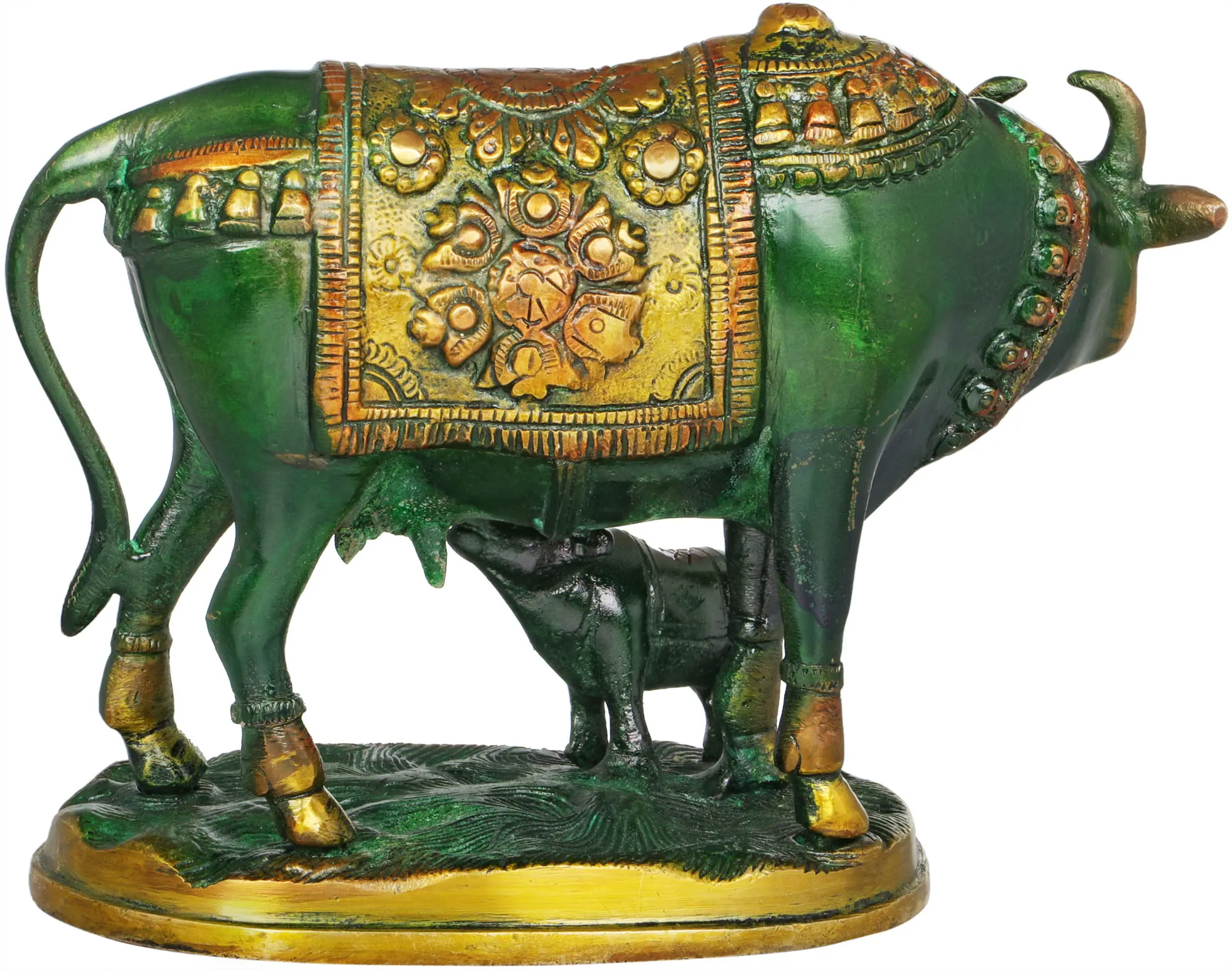 This lovely sculpture of a cow and calf perfectly embodies maternal love, tenderness, and fertility. This sculpture shows a cow feeding a calf while standing tall and robust. The calf stands for innocence, reliance, and tenderness, while the cow represents abundance, nourishment, and protection. The sculpture symbolises the bond between a mother and her offspring and exudes a sense of harmony. In many cultures, the cow is revered as a symbol of sanctity, divine favour, and abundant agriculture.