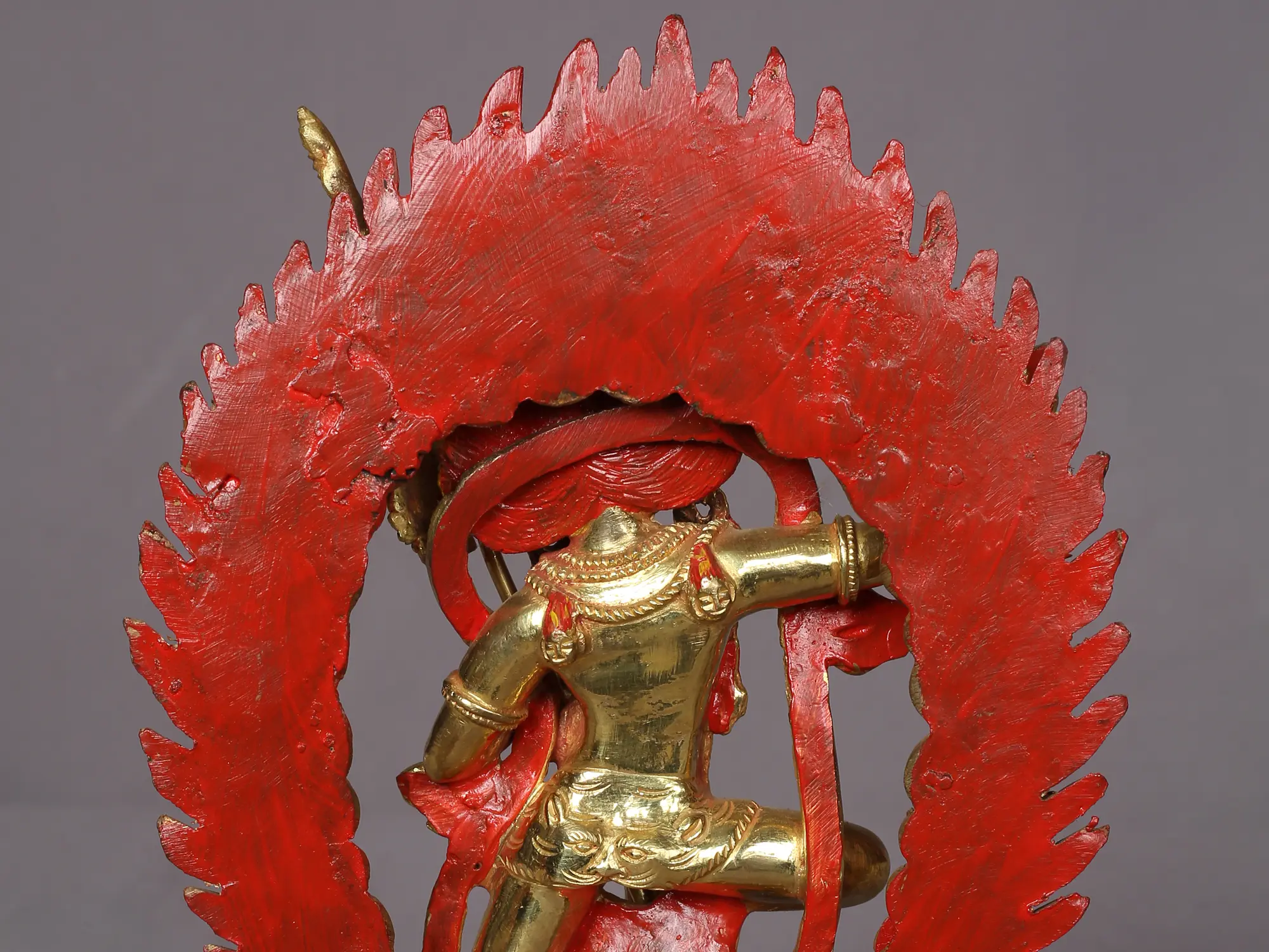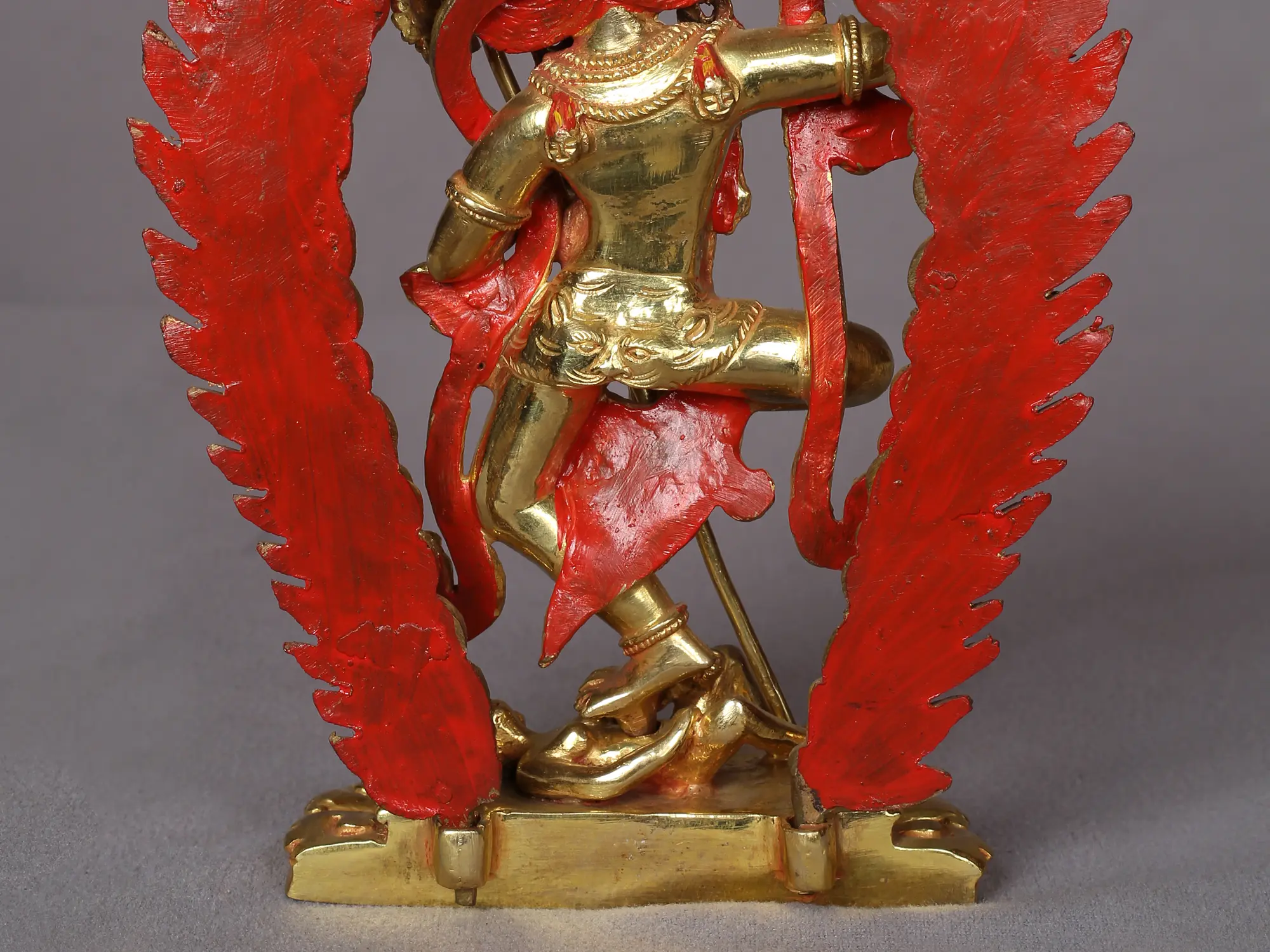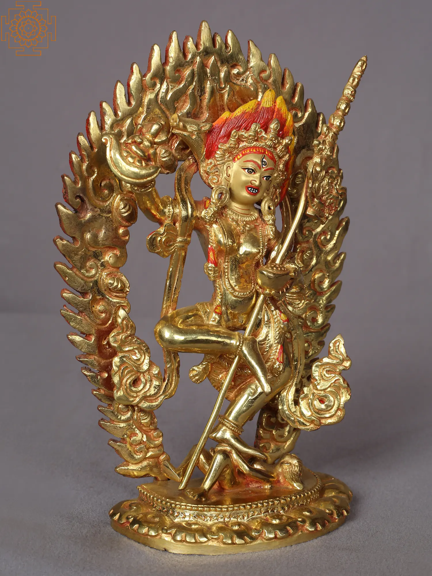 Vajrayogini, the embodiment of the energies of Vajrayana Buddhism and Tantra and the guiding light of yogis on the path of knowledge manifests in a powerful stance and a striking form, surrounded by roaring fires of enlightened consciousness. The Hindu goddesses Kali and Parvati are expanded into the Kirati (an ethnic group in Nepal) shaman female known as Vajrayogini, who protects the Valley and its inhabitants from any evil. The Vajrayogini is shown standing in a dynamic form of the dancing pose known as Aradhaparanyakasana, with her right leg abruptly elevated in the air. This handmade copper with a gold statue from Nepal is a potent tool for the sadhaka or initiate who envisions the powers of the Vajrayogini extending to her.