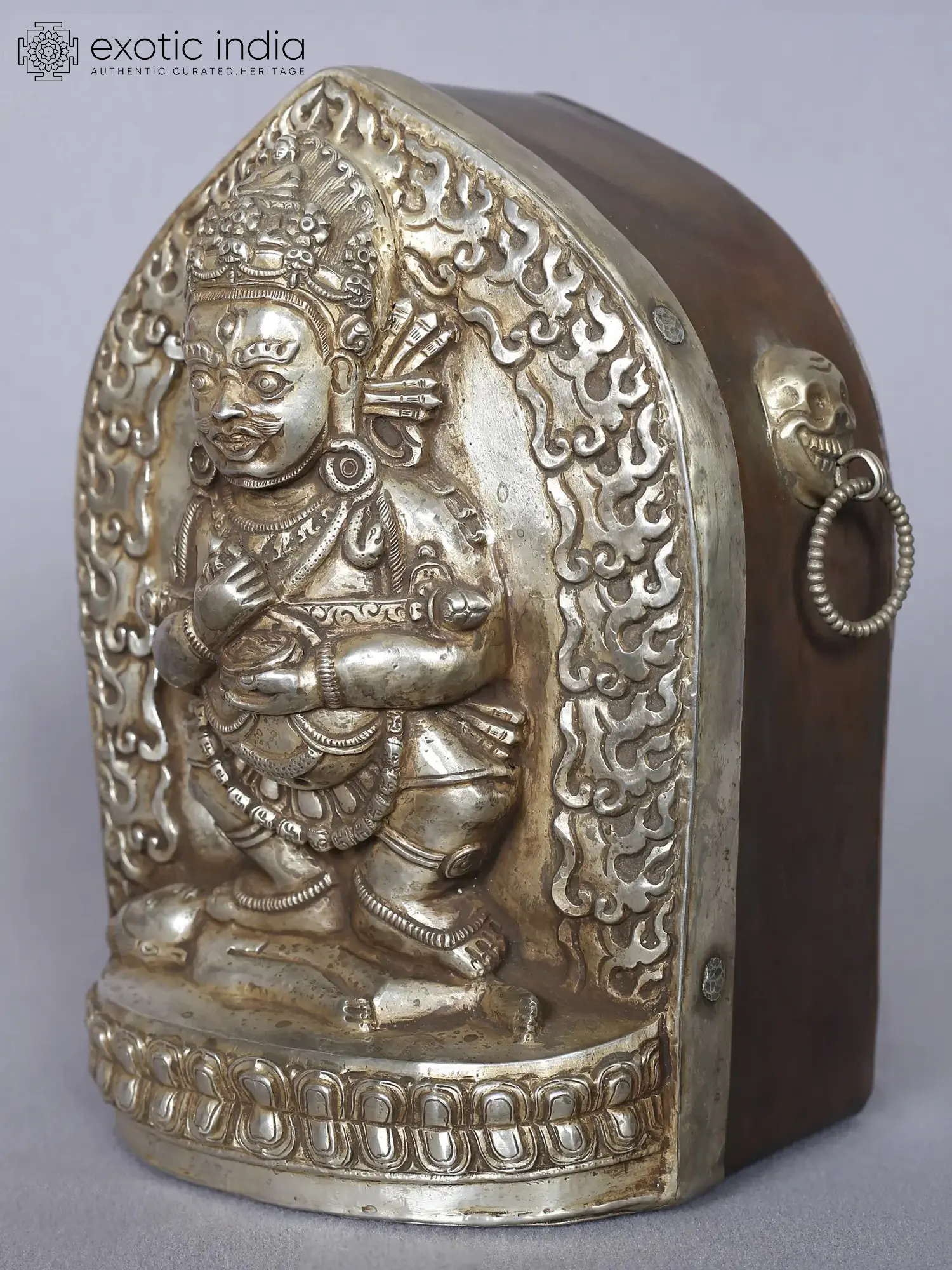 Safu Mahakala, a manifestation of Bodhisattva Avalokiteshvara, is a revered deity in both Hinduism and Buddhism. This stunning silver sculpture of Safu Mahakala showcases his wrathful form, symbolizing the protector of Buddhist teachings. Standing upon Buddha, he wields a curved knife in his right hand and holds a kapala (skull cup) filled with blood in his left hand. The deity's fierce appearance represents the eradication of ignorance and obstacles on the path to enlightenment. Popular in Nepal, Safu Mahakala is worshipped for his protective powers. Owning this exquisite sculpture brings forth divine blessings and spiritual strength.