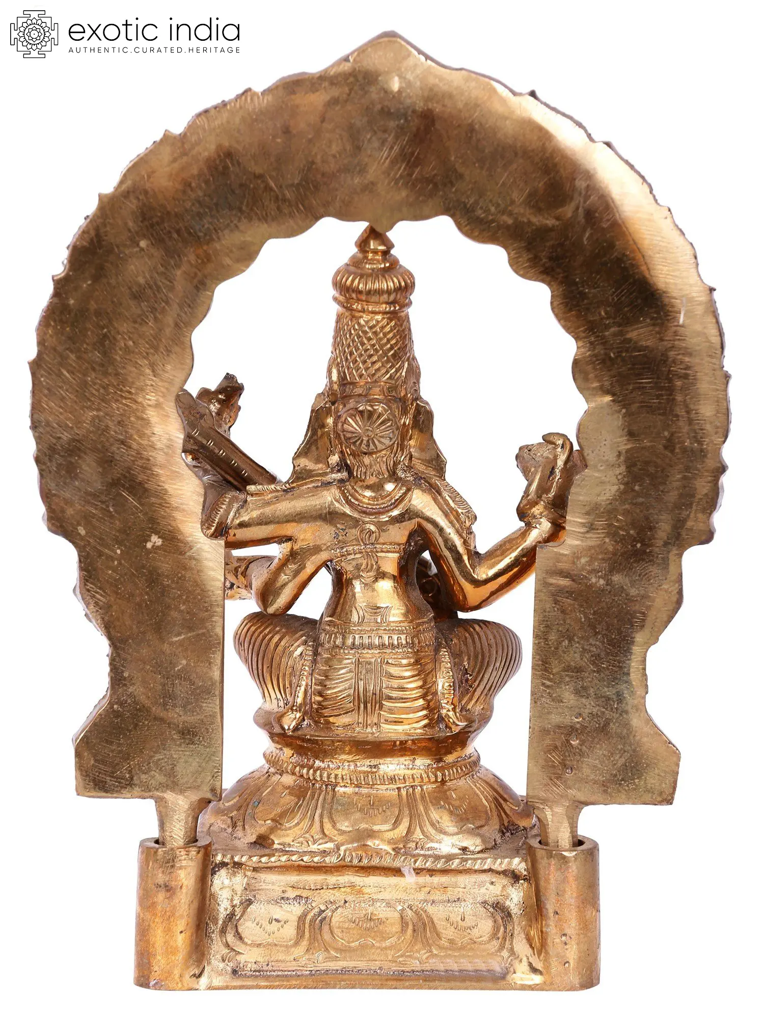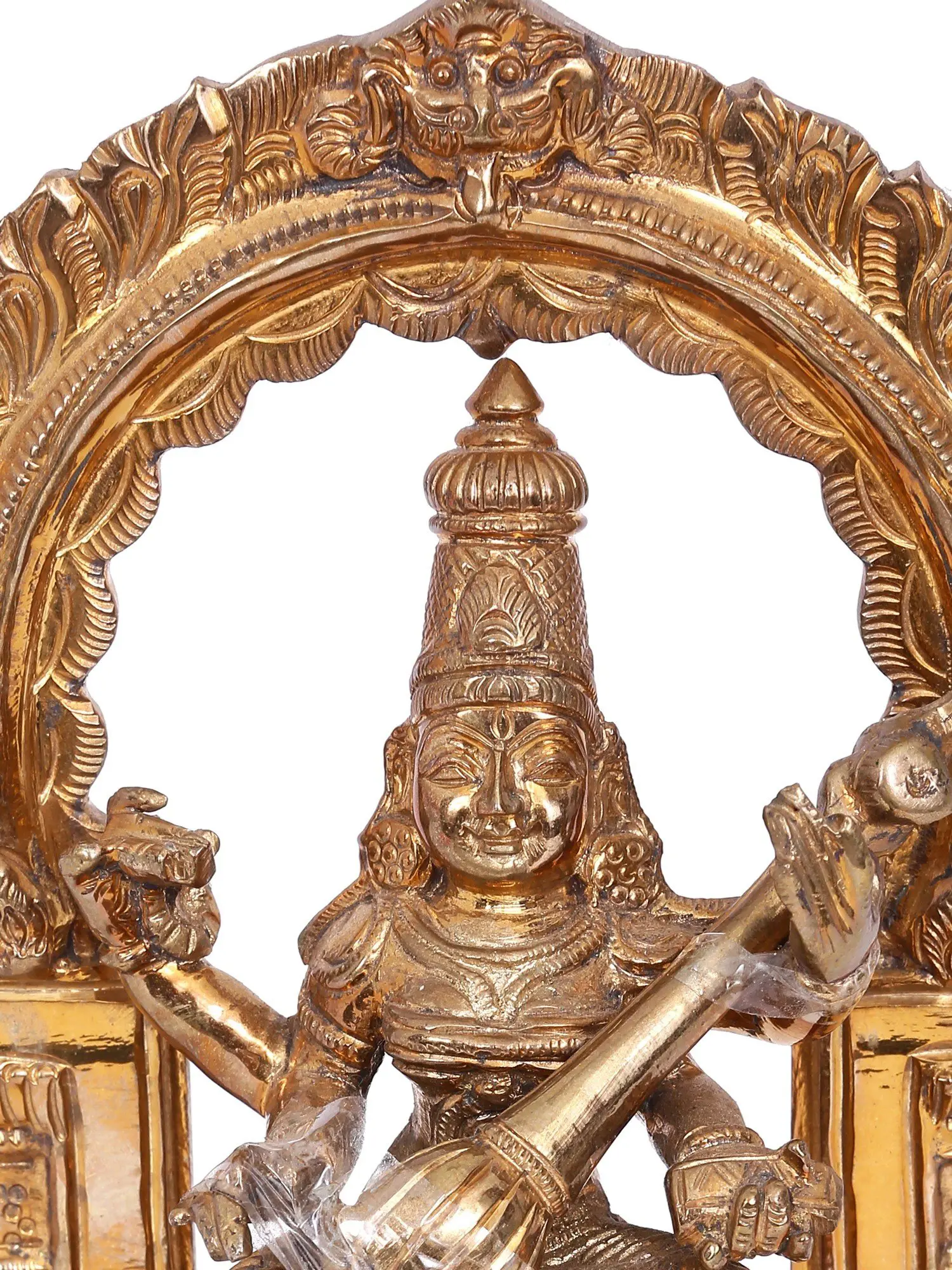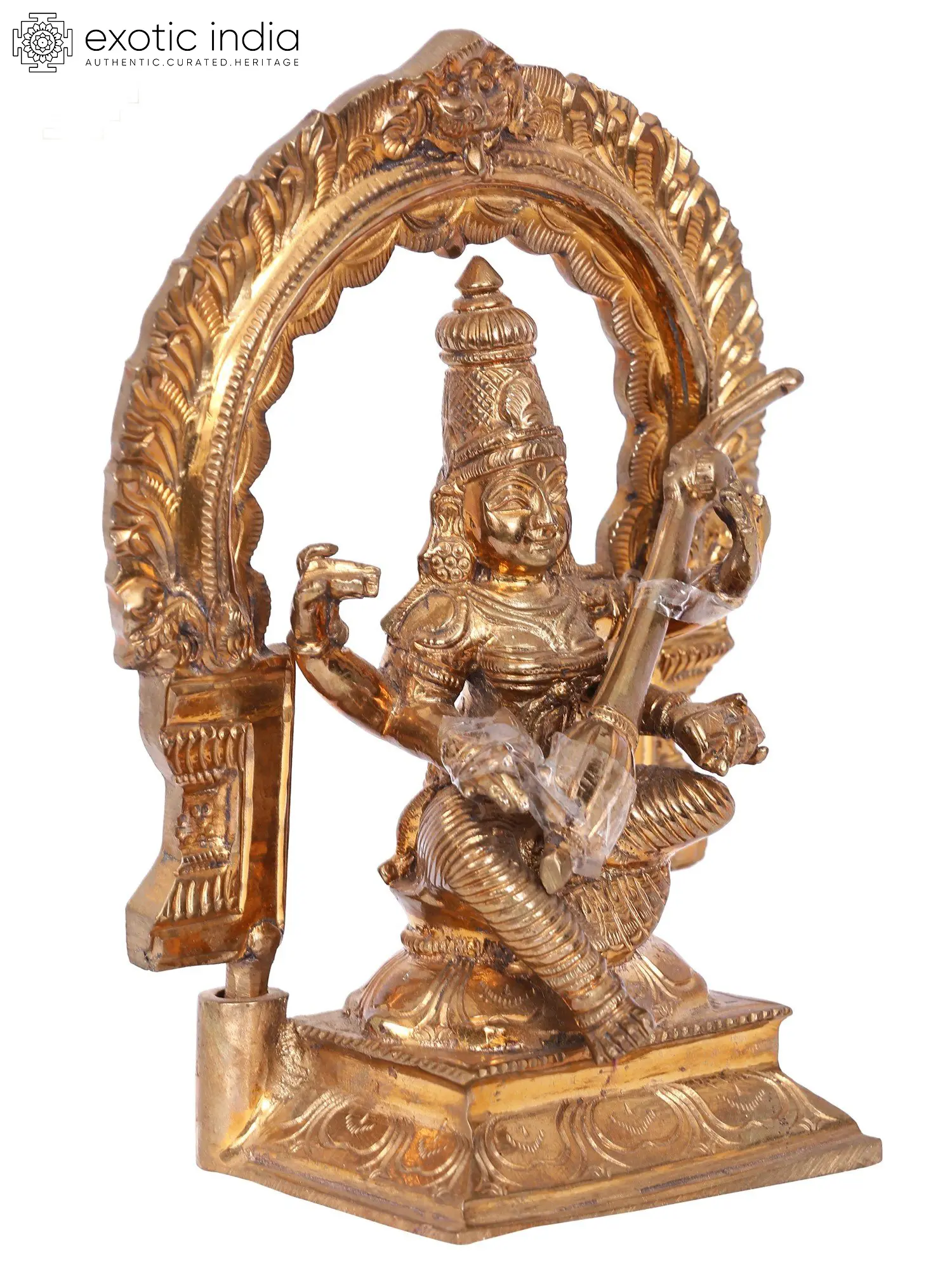 Chaturbhuja (four-armed) Veenavadini goddess Saraswati animates this small bronze icon with a divine smile and her heavenliness. Devi Saraswati sits on a beautiful throne, marked by a Kritimukha Prabhavali attached to her asana. Goddess Saraswati is adorned with a long Kiritamukuta, dehri or circular earrings, and precious ornaments along with a dhoti whose folds are perfectly delineated in the metal icon. Glistening marvelously, the statue carries the essence of the great goddess, who bestows supreme wisdom and creativity on all beings.