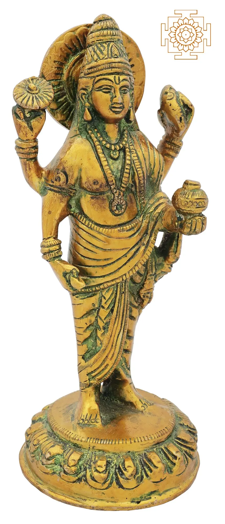 In Hinduism, Dhanvantari, also known as the “God of Ayurveda”, is the physician of Devas and regarded as an incarnation of Lord Vishnu. It is believed that Dhanvantari emerged from the ocean of milk and is often depicted with four hands, holding the Shankha (Conch shell), chakra (discus), Jalauka (leech), and a pot containing amrita, emphasising his role as the bestower of health and well-being. As the celestial healer, he represents the embodiment of knowledge and wisdom in the traditional system of medicine. The intricate details of this brass sculpture demonstrate Dhanvantari’s divine presence and mastery of healing arts. This sacred creation is a cherished symbol of well-being and healing, adding a touch of spirituality and cultural heritage to any sacred space or home altar.
