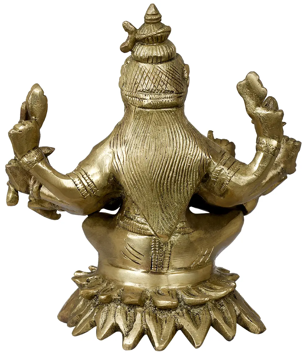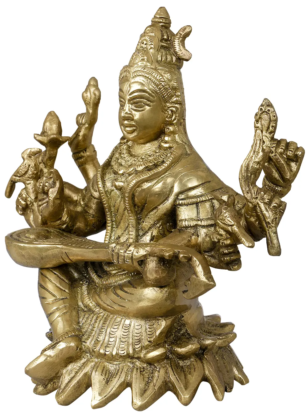 Eight-armed or Ashtabhuja Maa Saraswati is venerated amongst her devotees as Maha-Saraswati, the supreme manifestation of the creative energies of Maha-Shakti or the great goddess in Hinduism. In this small brass statue, Maha-Saraswati cradles her Veena in her primary hands, while holding various weapons in other hands, sitting on a gorgeously delineated lotus throne.