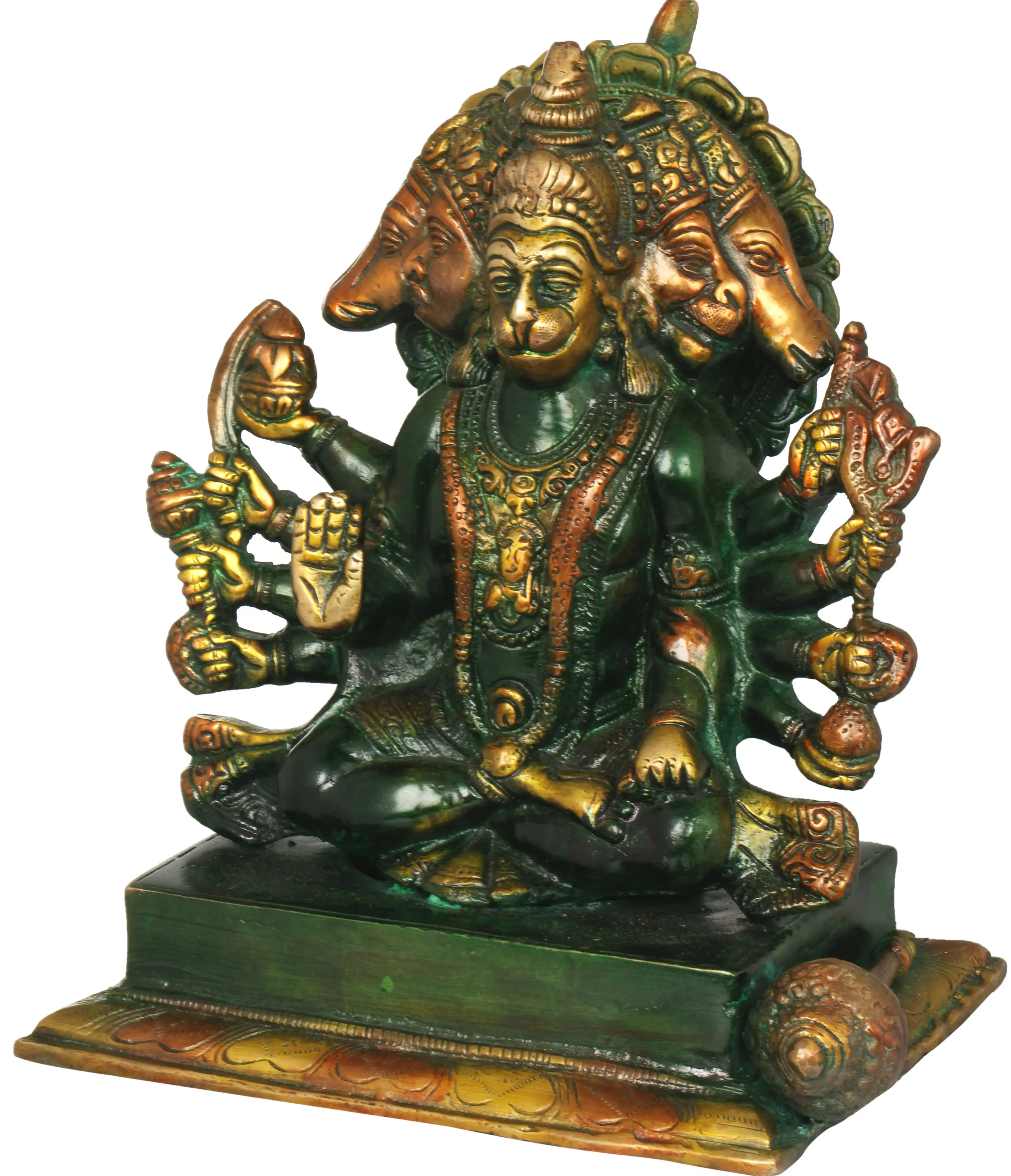 The brass sculpture of the Five-Headed Hanuman is a magnificent representation of devotion and strength. Hanuman, the mighty devotee of Lord Rama, is adorned with five heads, symbolizing his exceptional knowledge and unparalleled dedication. One head represents the supreme devotion to Lord Rama, while the other four embody his cosmic omnipresence. He holds a mace, symbolizing power, and a mountain with the life-saving herb, Sanjeevani, signifying his unwavering service. Hanuman's presence serves as a reminder that unwavering faith and devotion can overcome any obstacle in life.