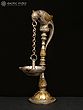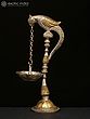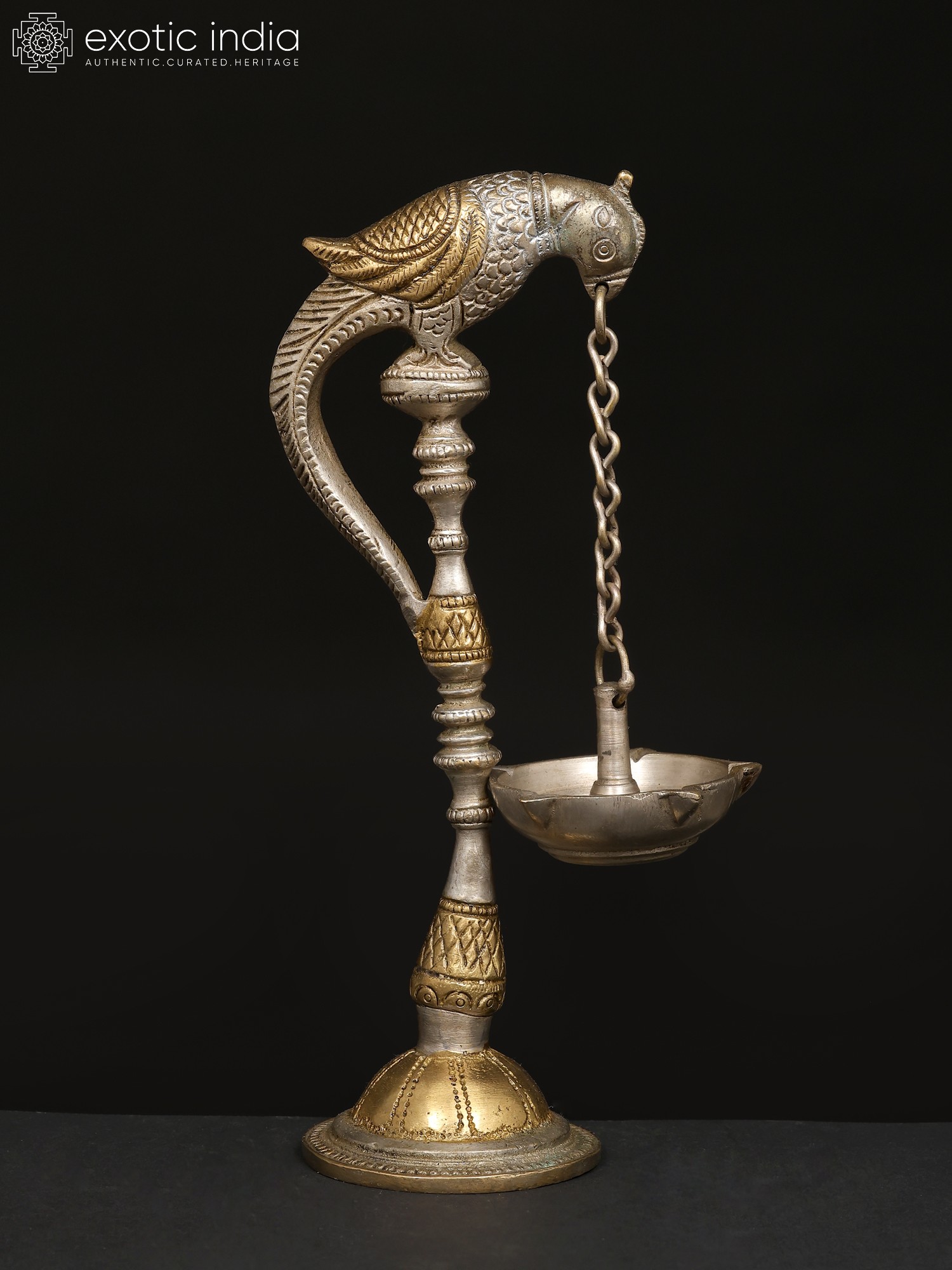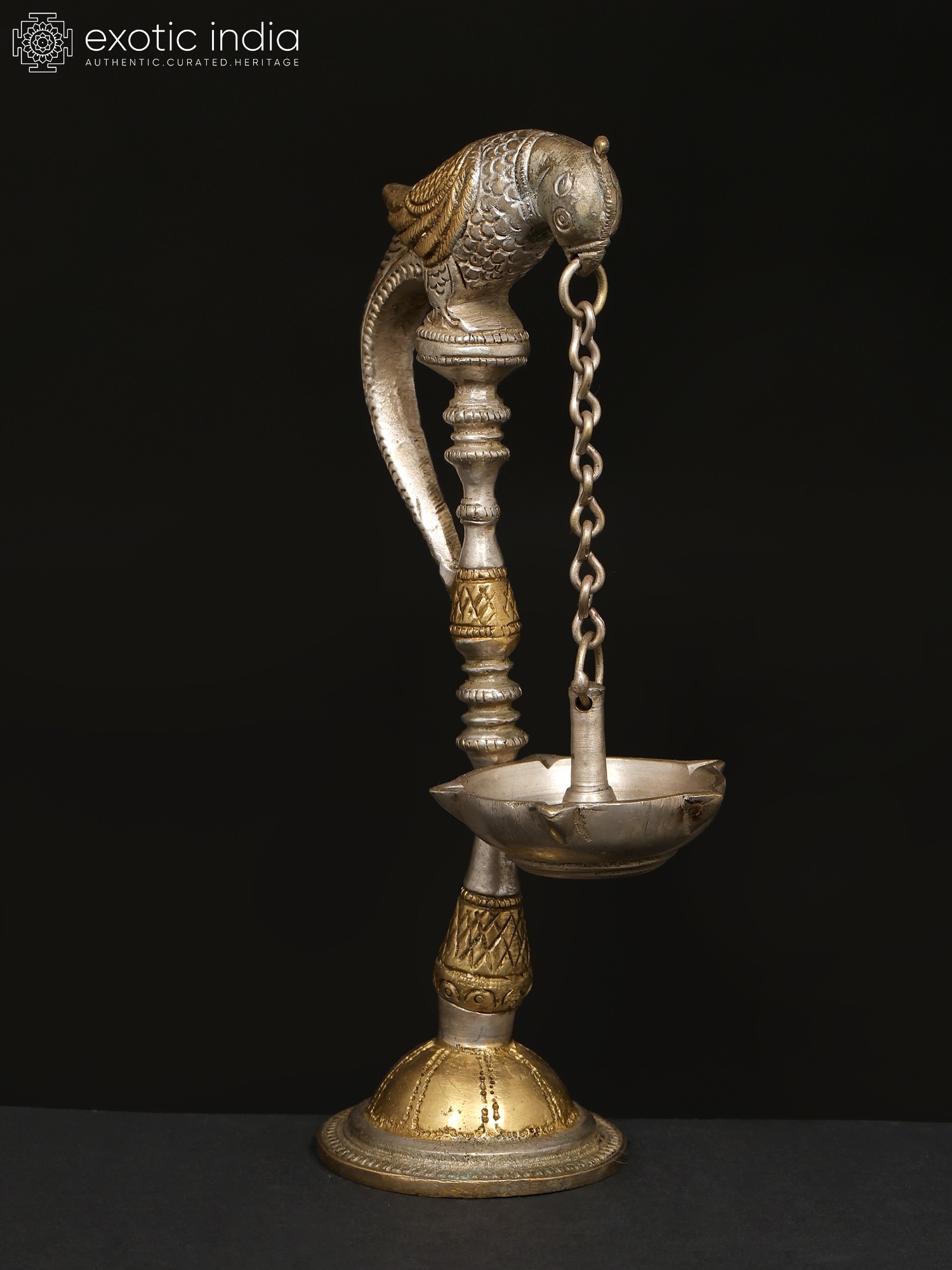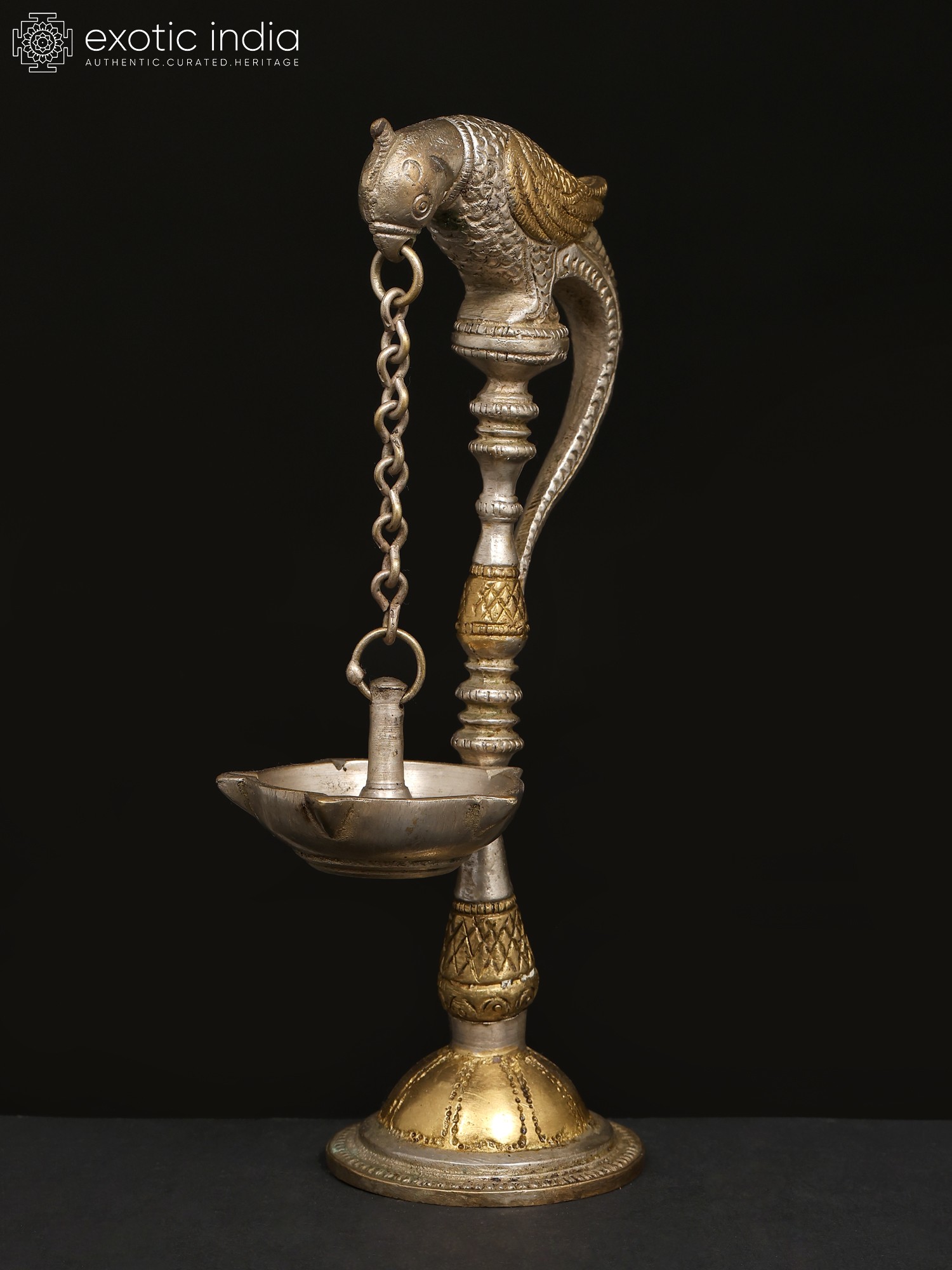 In Indian art, parrots are often revered for their association with love, beauty, and knowledge. They symbolize devotion and fidelity, making their presence in this lamp not only visually appealing but also imbued with cultural and spiritual significance, creating a captivating and sacred ambiance. This Five-Wick Parrot Hanging Lamp with Stand in Brass is a remarkable handmade creation. This unique lamp features a parrot perched atop, holding a hanging lamp in its beak, adding a whimsical touch to its design. Decorated in resplendent gold and silver hues, the lamp seamlessly blends elements of columnar and hanging lamps, resulting in a harmonious and eye-catching ensemble.