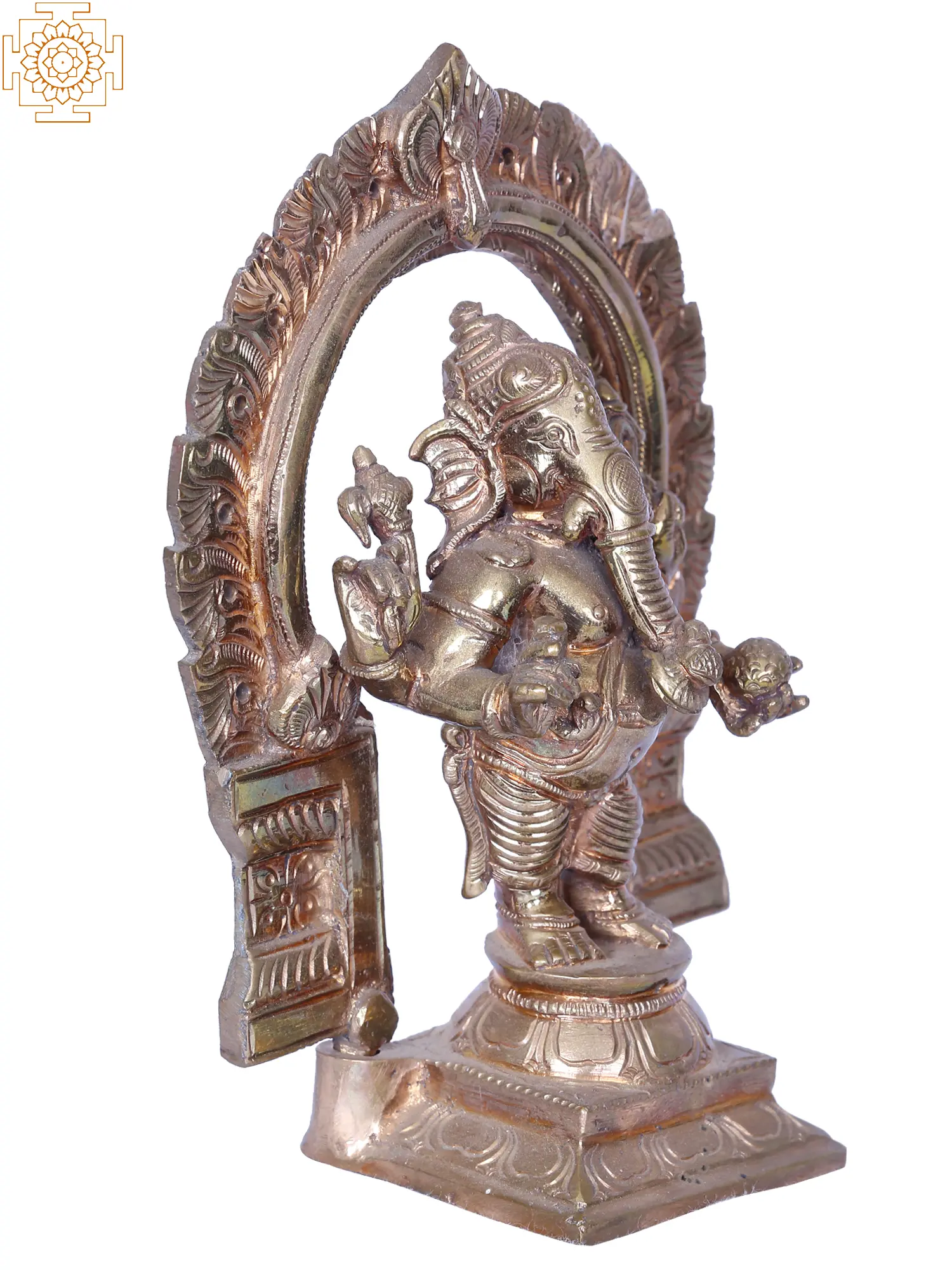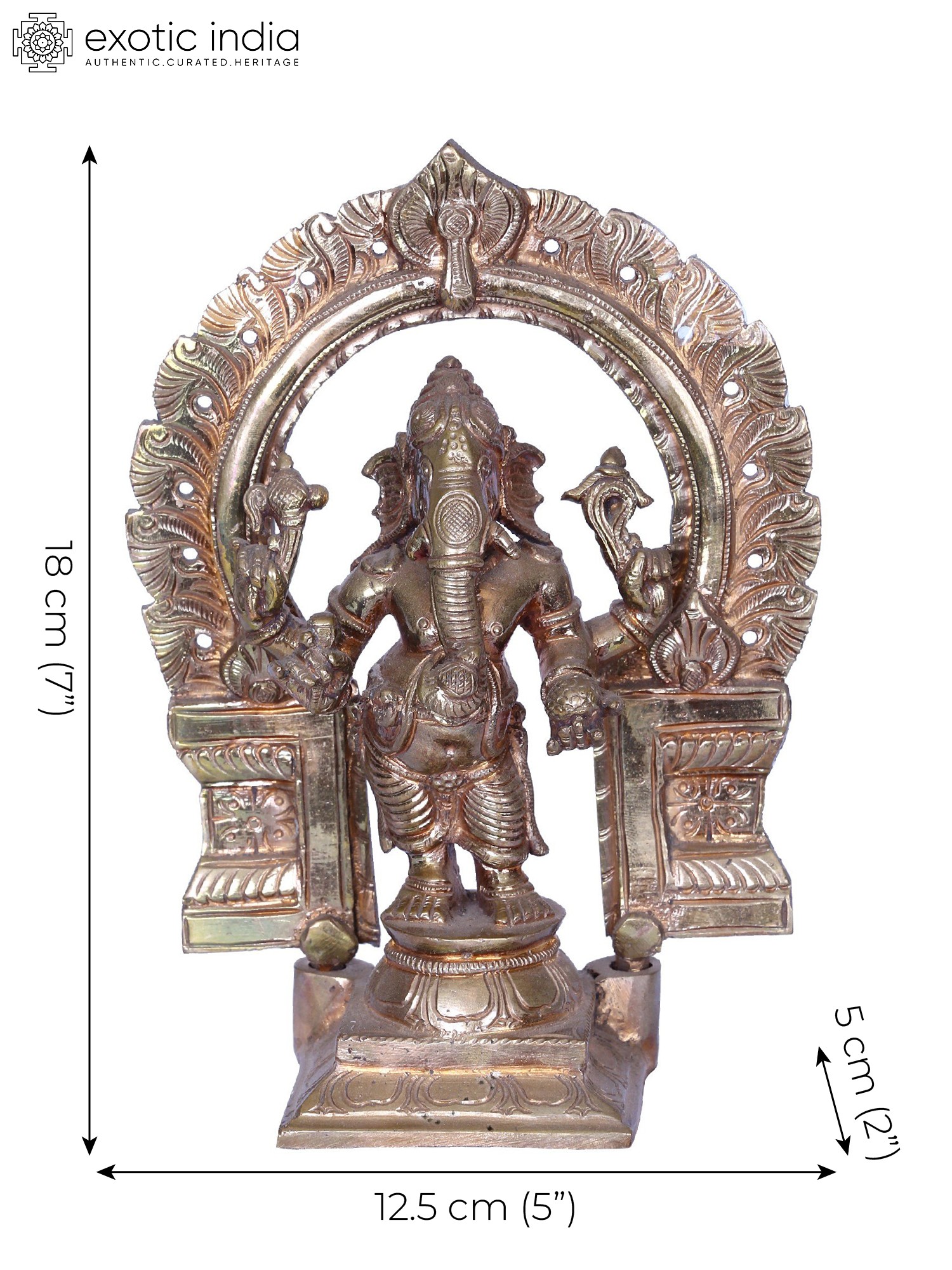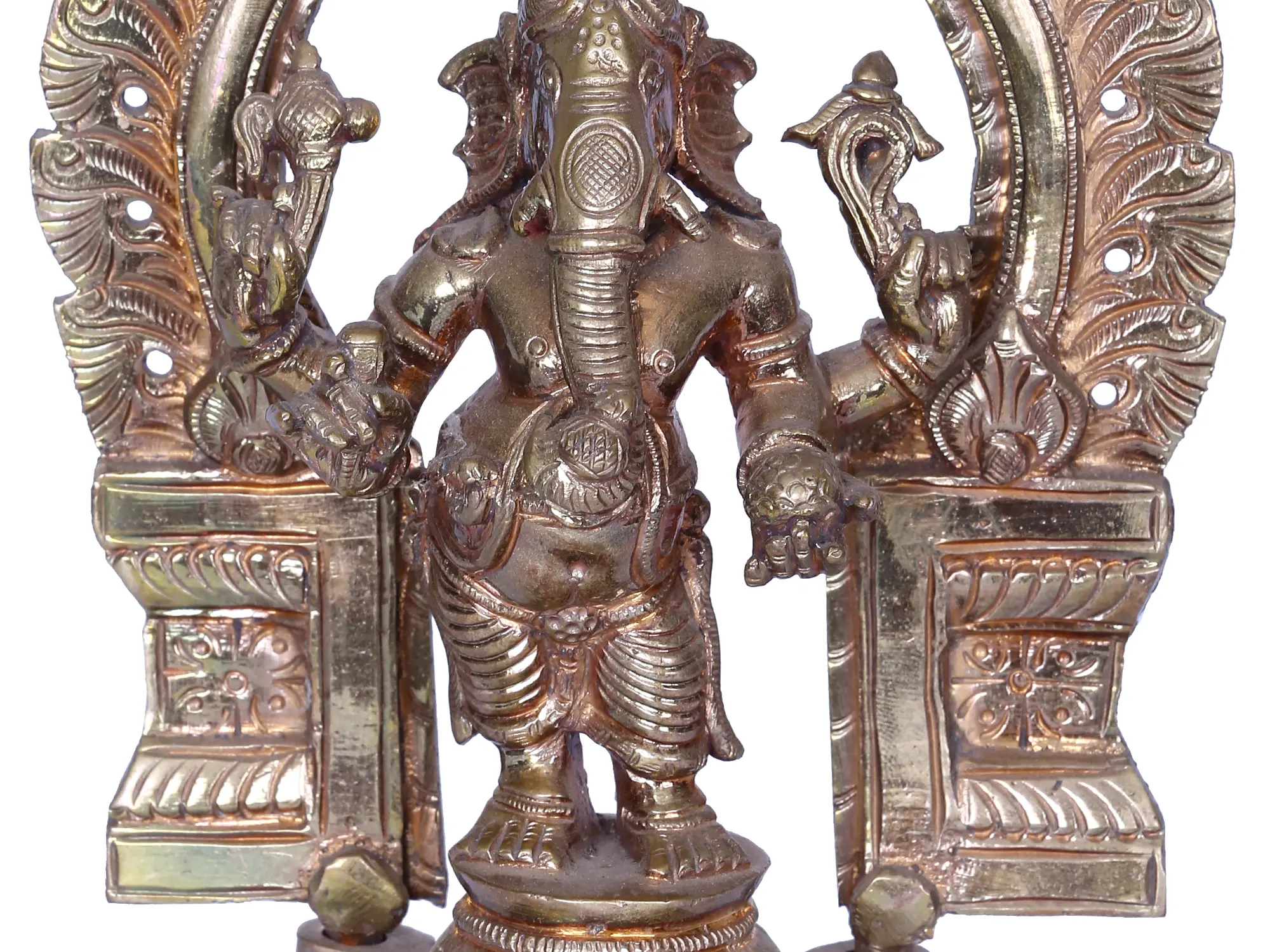 In the sanctum of creation, Lord Ganesha, the harbinger of Success and Good Fortune, majestically reigns upon a celestial throne, a symphony of divine elegance. His upper hands cradle a goad and a noose, tools of wisdom and restraint. A broken tusk and a Modak, delicacy of humility and sweetness, grace his benevolent hands. Draped in regal attire, his belly, a cosmic vessel of abundance, echoes the rhythm of prosperity. With a colossal trunk and ears attuned to cosmic whispers, Ganesha embodies cosmic harmony. Worshipping this divine form, crafted in bronze, unlocks the gates to wisdom, prosperity, and the art of navigating life's labyrinth. Crafted using the ancient “Madhuchista Vidhana (Lost-Wax) technique”, this artwork is a hymn to the cosmic dance, where Ganesha, the orchestrator, guides devotees through the eternal tapestry of existence.