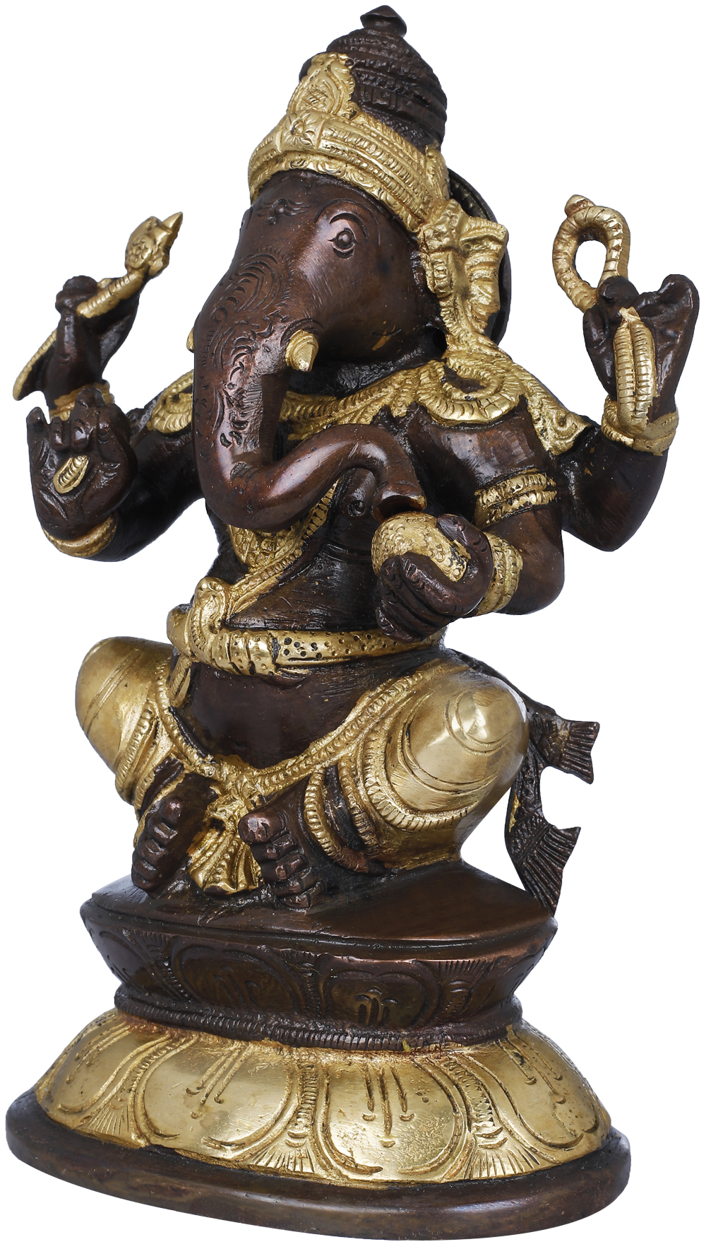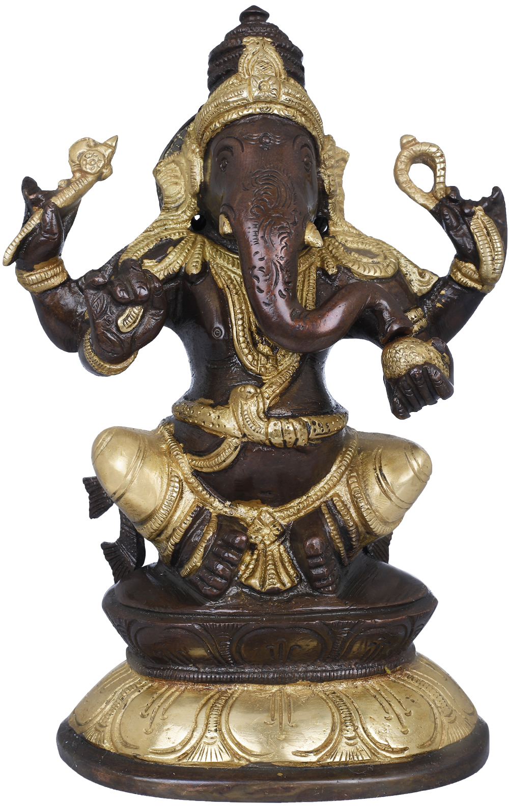 In this sculpture, Lord Ganesha sits gracefully on a double lotus pedestal, symbolizing purity and spiritual growth. Ganesha is revered as the Remover of Obstacles and the God of Beginnings. With his elephant head and a human body, Ganesha is known for his wisdom, intellect, and benevolence. He holds various symbolic attributes such as the broken tusk, which symbolizes sacrifice, and the Modaka, a sweet delicacy representing the reward of spiritual wisdom. Ganesha uses the noose to eliminate negative forces that hinder spiritual progress or success. The serpent wrapped around Ganesha’s belly represents the kundalini energy, signifying his ability to transform and transmute negative energies into positive ones. Adorn your sacred space with this brass creation, embracing Ganesha’s blessings of prosperity and success.