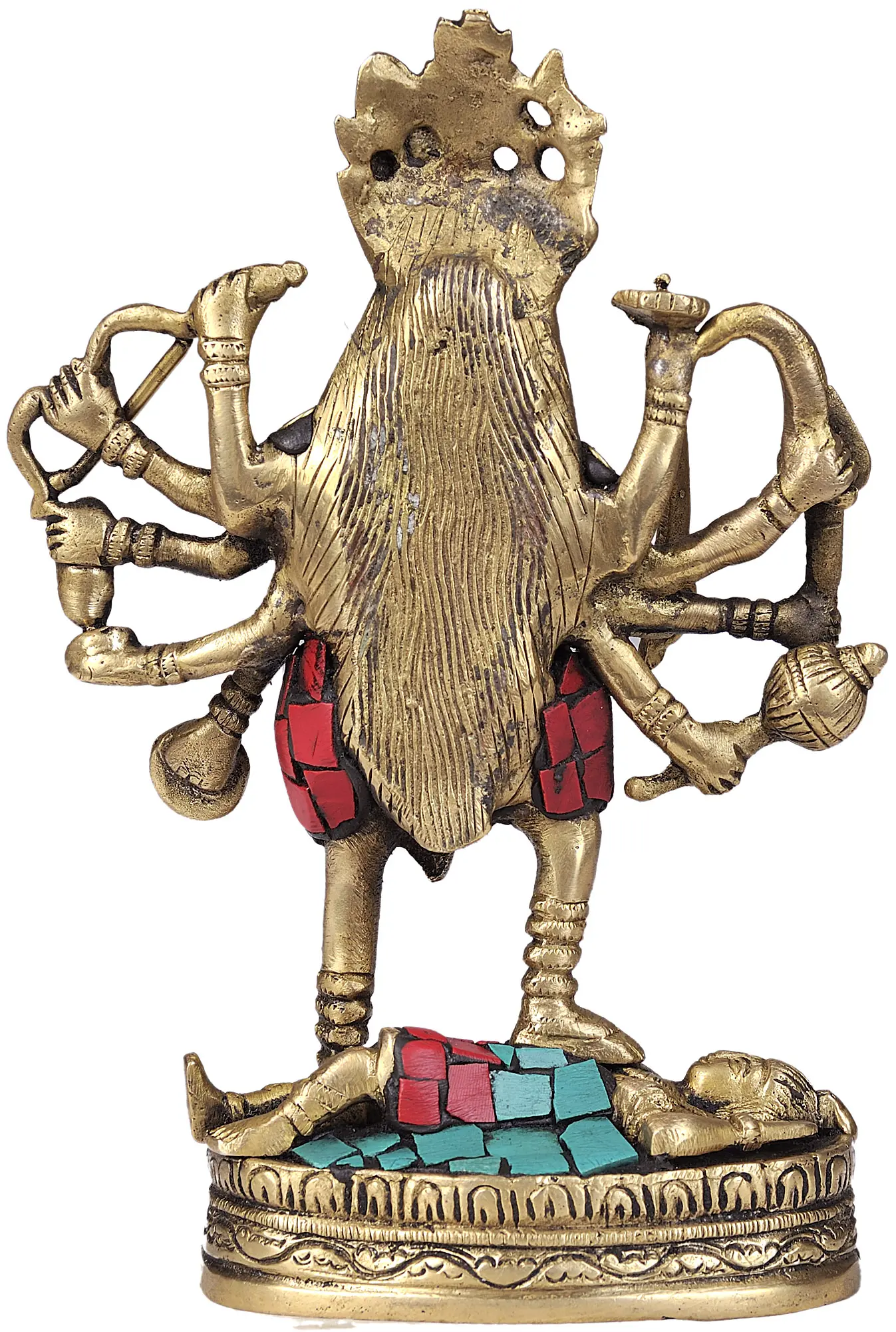 Every mother, or Maa, possesses the divinely endowed capacity to crush any adversity that befalls her children. This ferocious maternal protection is celebrated in Hindu-Tantra culture under the majestic guise of Maa Kali. When souls scream out for their mother to save them from the Kaliyuga fires, the great mother goddess responds with her fierce, combating roopa. The great Devi is overpowered by maternal compassion after hearing the heartbreaking evocations of her offspring who are in need, which reaches its absolute peak as unrestrained wrath towards the cause of their cries. In this handmade brass statue, this wrathful yet maternal aspect of Devi Kali has been presented, beautifully inlaid which rich hues, that add to her brilliance artistically.