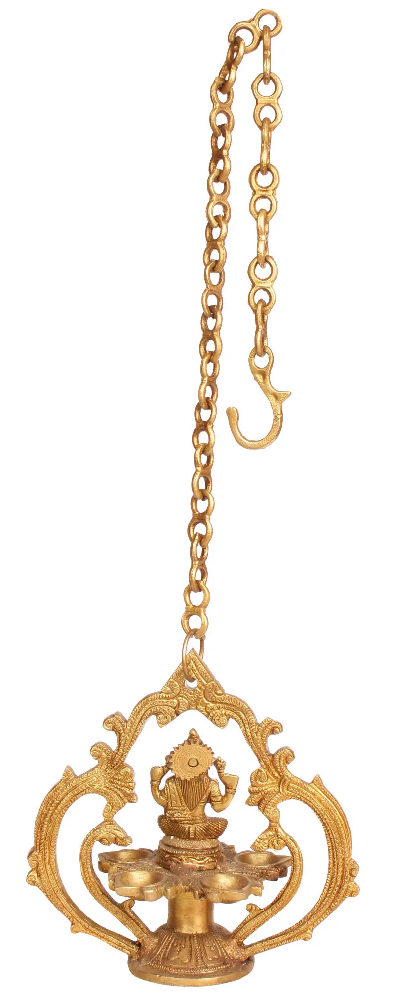 The hanging lamps illuminate the land's surface above. These lamps are often used to adorn temples and create a wonderful mood during Poorams. The Lakshmi hanging lamp made of brass is one of the most auspicious lamps used in ceremonies. The image of Goddess Lakshmi, the bestower of wealth and prosperity, is located in the center of the oil basin and is surrounded by peacock feathers that form an aureole. The five-wick light under the picture of the Goddess resembles a fully blossomed lotus, offering an illuminated throne for the Goddess of wealth.