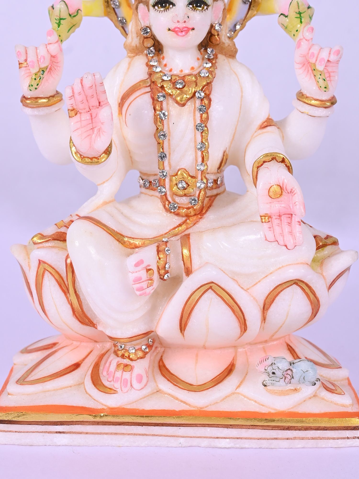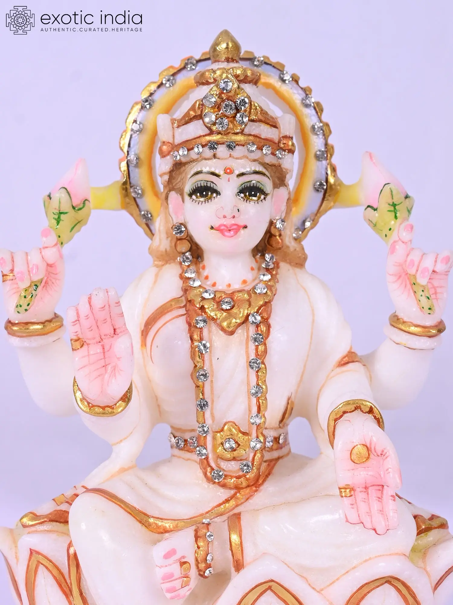 Sculpted seated on a lotus, symbolizing purity and spiritual enlightenment.