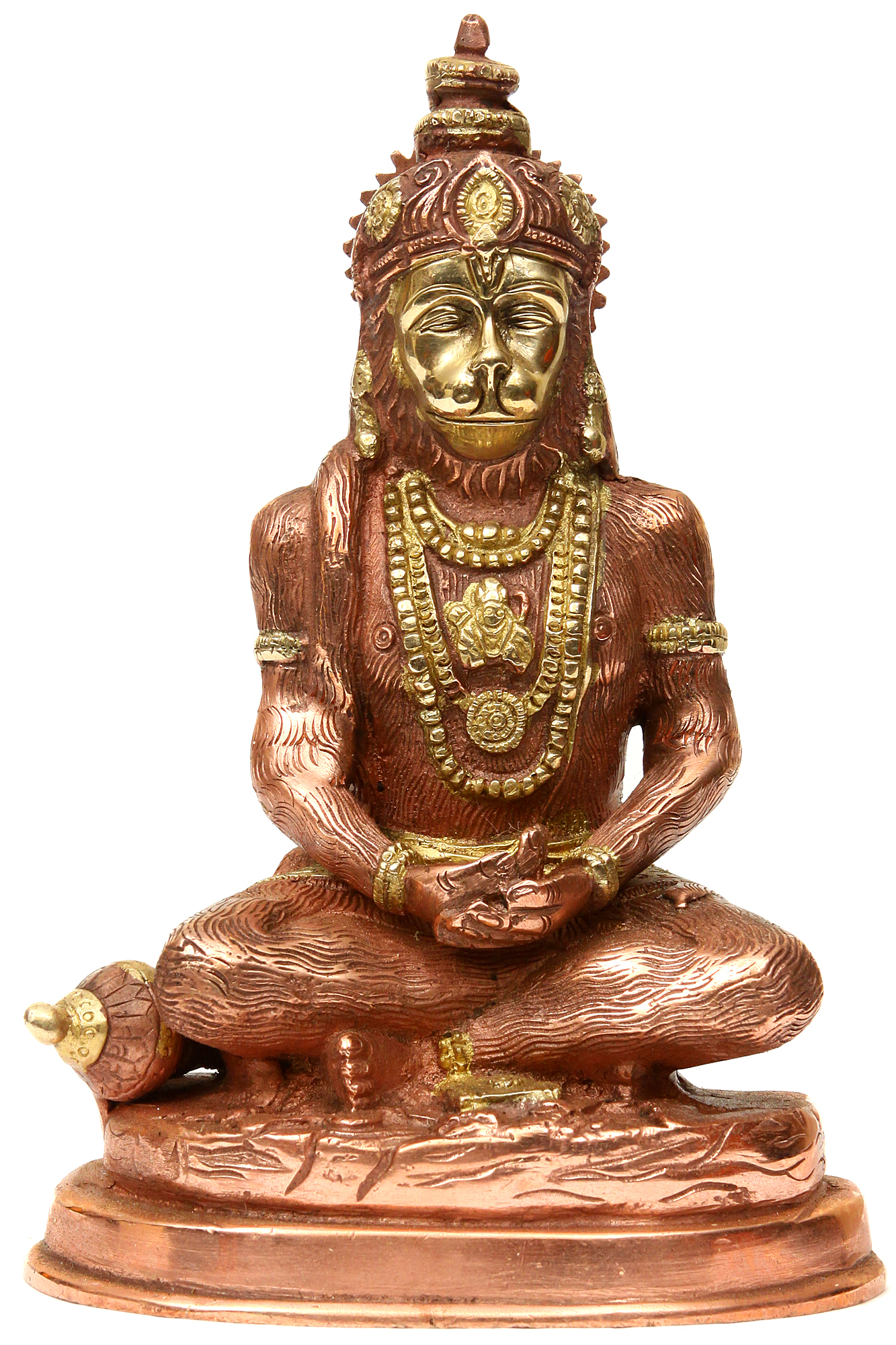 Wearing a short-patterned loin cloth, he is adorned with necklaces of pearls, elaborate earrings, and an intricate three-tiered crown. This figure epitomizes Hanuman's character at his very best - powerful, as his bulging muscles show, and humble, as exemplified in his calm, relaxed, and unpretentious meditative demeanour. Here is the monkey general adored by countless devotees for the impossible feat he performed - locating Sita by jumping across the ocean to Lanka, giving her a message from Rama, and returning to fight the final battle.