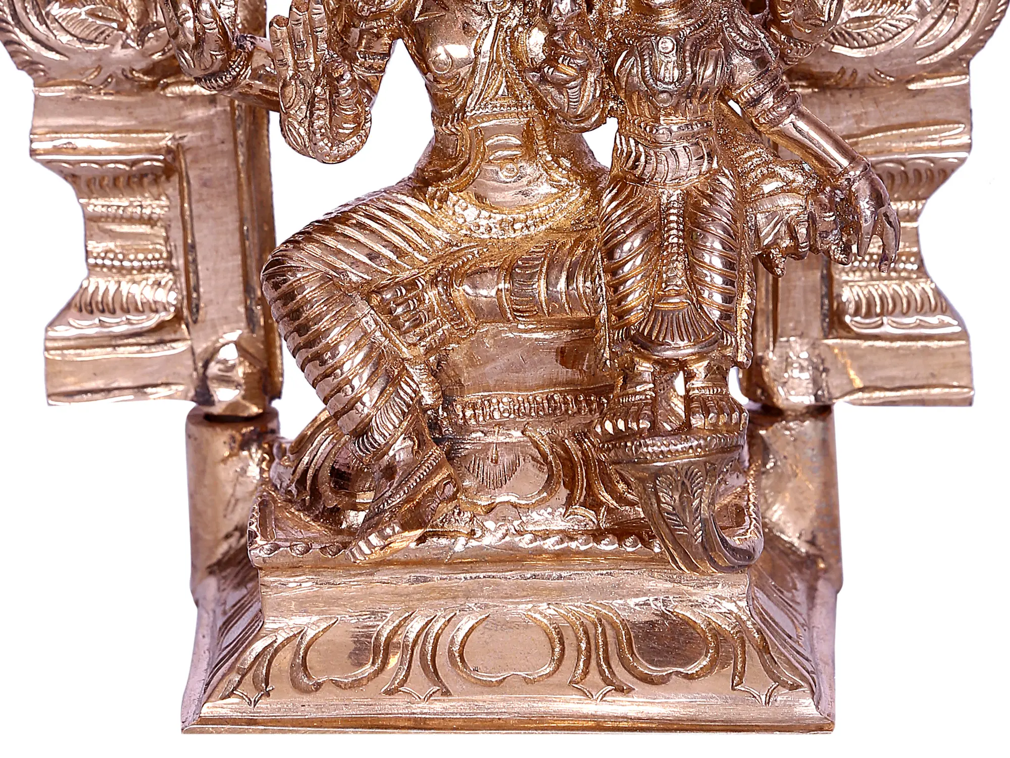 In this bronze statue, Bhagwan Hayagriva, the divine equine incarnation of Lord Vishnu, graces the Kirtimukha throne with majestic allure. Awe-inspiring, adorned in regal splendour, Hayagriva cradles the potent Sudarshan Chakra and resonant Shankha. His “Karanda Mukut” and resplendent jewels proclaim his divine sovereignty. A beacon of courage, his right-hand gestures “Abhaya Mudra”, dispelling fear. Beside him, Goddess Lakshmi, the One who destroys poverty, with a lotus countenance, radiates purity, clasping a lotus symbolising prosperity. Together, they embody the sacred union of intellect and abundance, beckoning seekers to unravel the boundless realms of enlightenment and opulence, where wisdom and material wealth intertwine in harmonious grandeur.