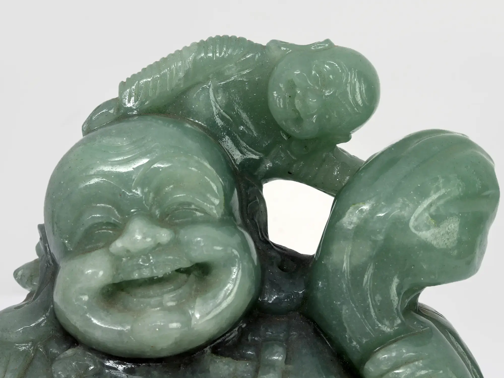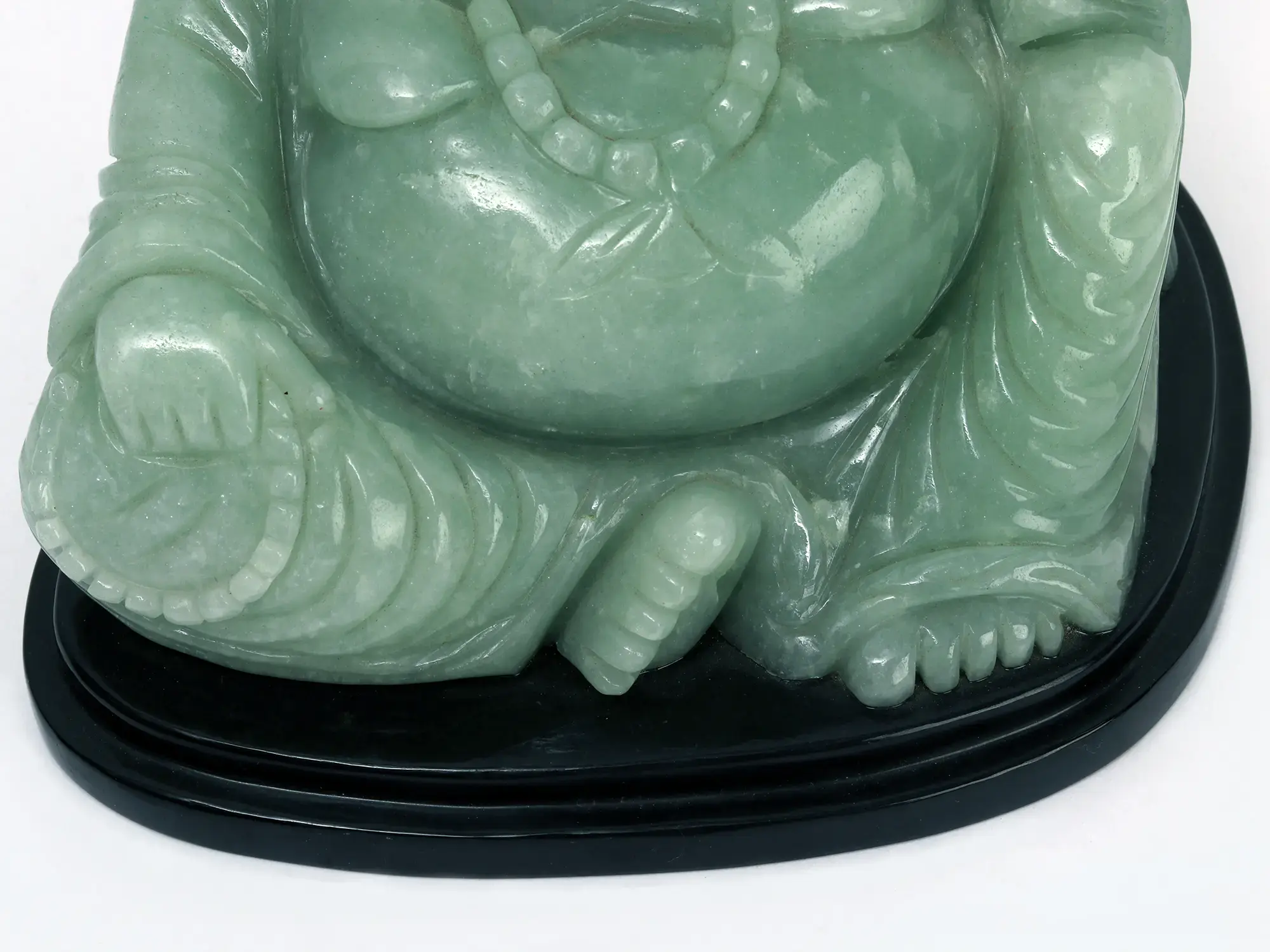 The Laughing Buddha or Budai sculpture that you see on this page is a piece of skilfully carved jade. It is the finest of the semi-precious stones and occupies pride of place in the tradition of Buddhist iconographical sculpture. The colloidal green colour is the identifying feature of jade.