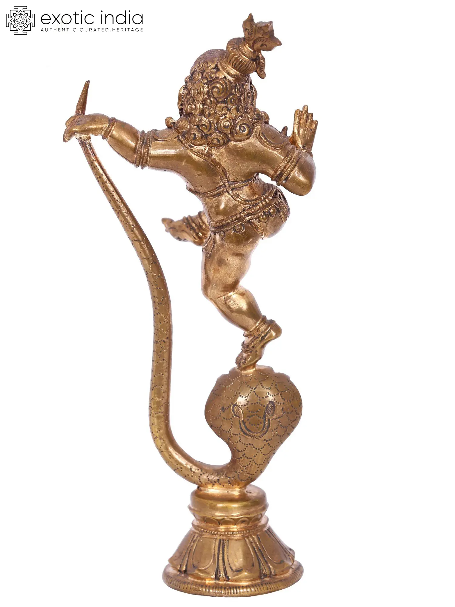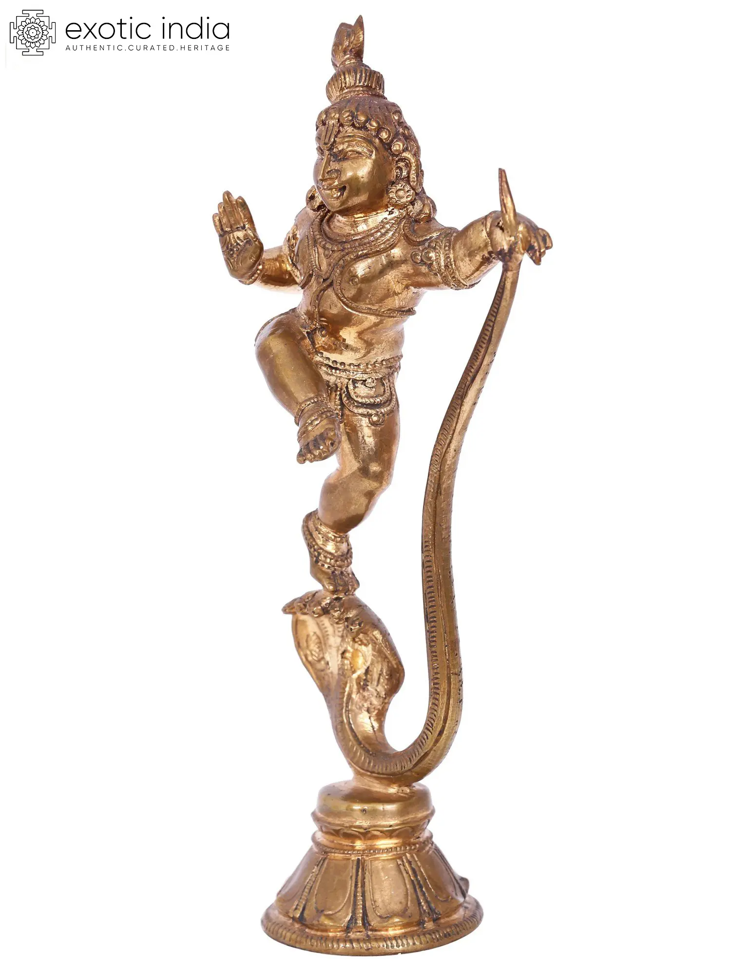 Immerse yourself in the divine tales with our Kalinga Krishna sculpture, a mesmerizing creation through Madhuchista Vidhanam in Swamimalai's Panchaloha Bronze. This piece beautifully portrays Lord Krishna subduing the serpent Kalinga. The legend goes that the Yamuna River in Vrindavan was home to a serpent known as Kalinga, who poisoned the whole river, making life extremely difficult for the locals and their animals. There, he sought refuge from Garuda, his foe. Kalinga sought to assassinate Lord Krishna when he dived into the river to collect a ball. Subsequently, Krishna grew to such a size as to subjugate Kalinga and began dancing on his hood.