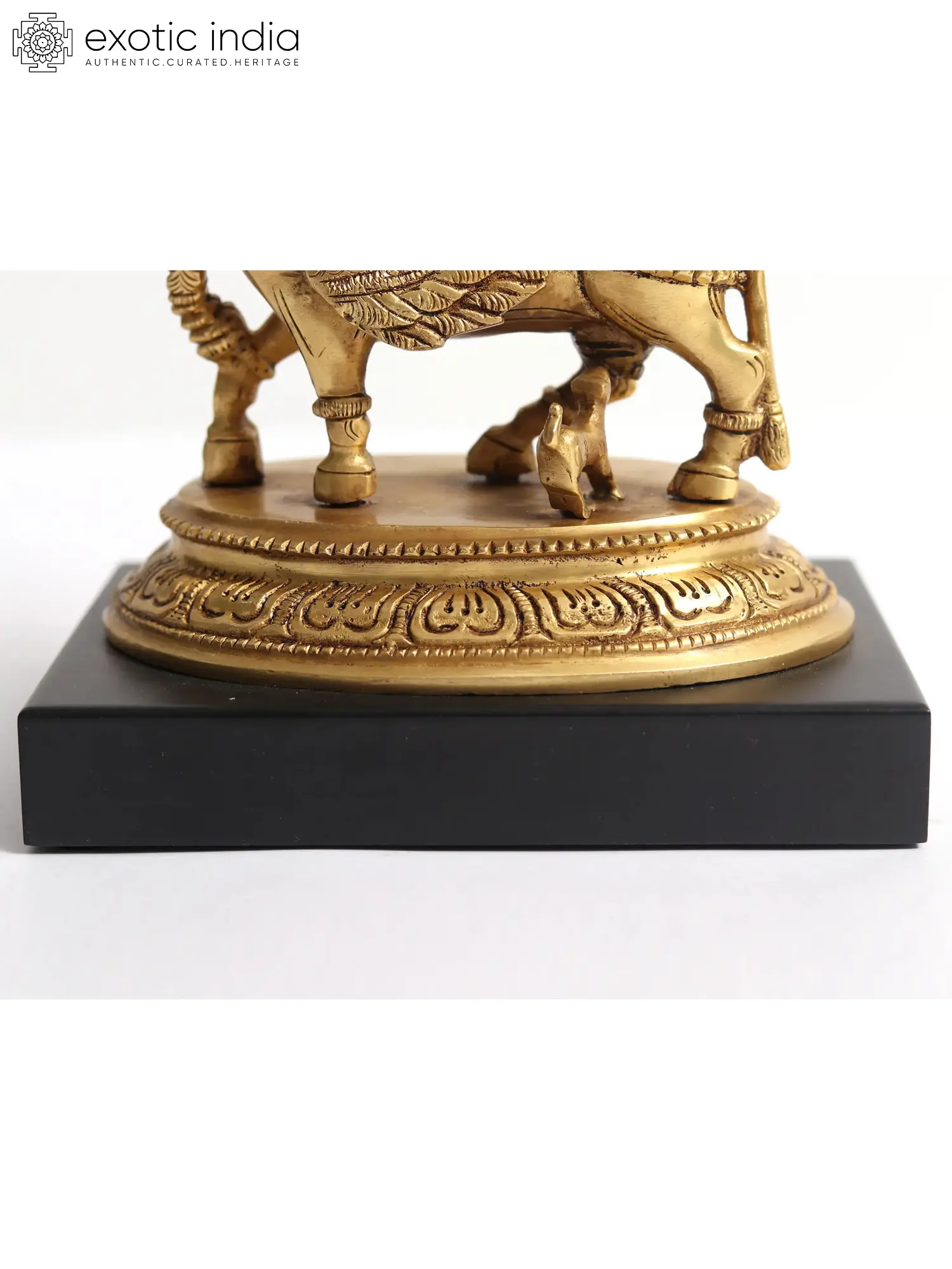This brass statue of Kamdhenu, standing on an elaborate pedestal, is the most exceedingly auspicious work of art. A small calf is shown drinking milk directly from the bottle. The image of Kamdhenu flapping her enormous wings and decorated with excellent jewellery is quite breath-taking. This portrayal solidifies Kamdhenu's status as a mythical creature. The Kamdhenu statue's ritualistic importance is overwhelming and has been passed down from ancient times. Keeping this statue at home offers the owner good fortune and wealth.