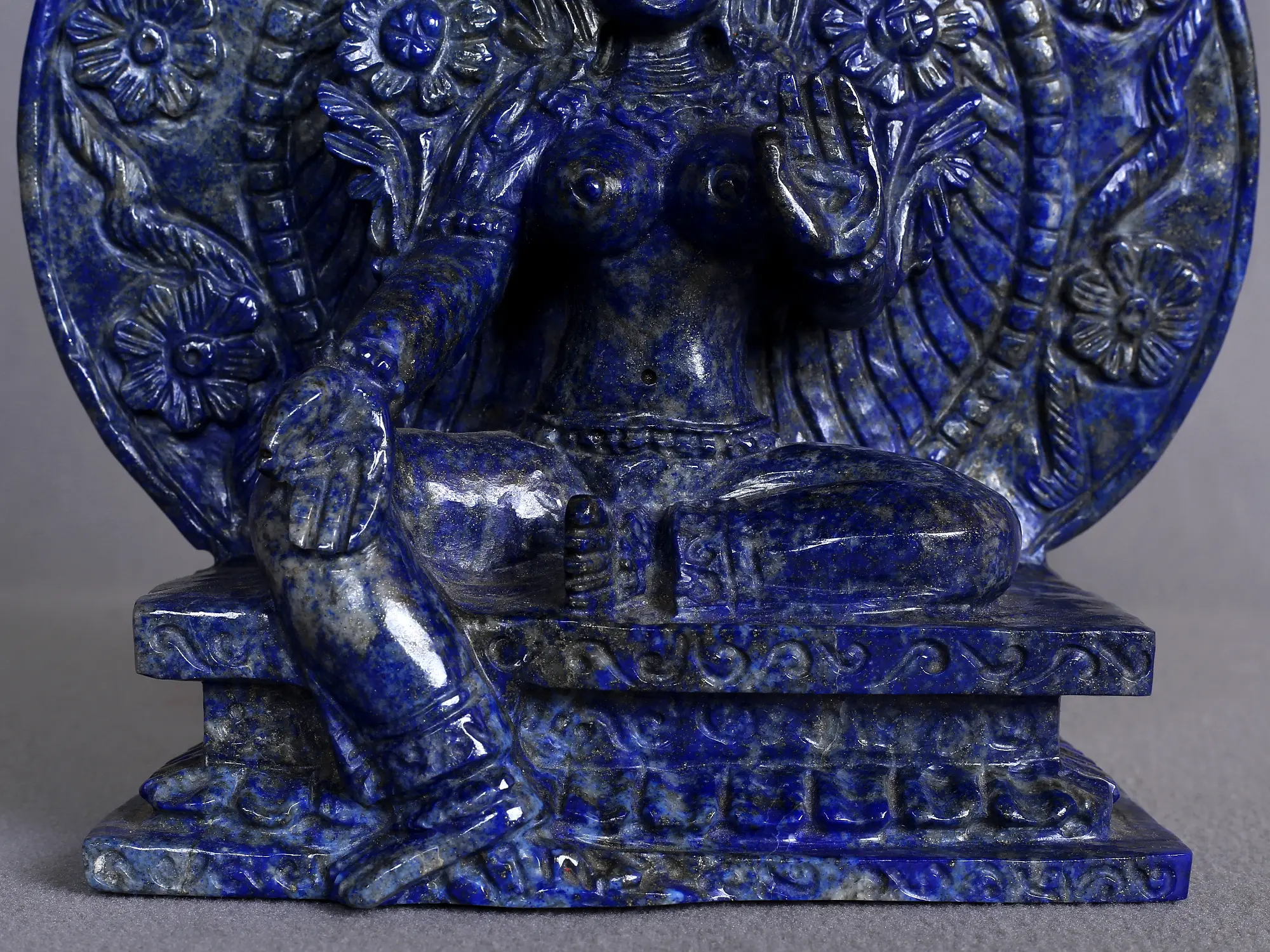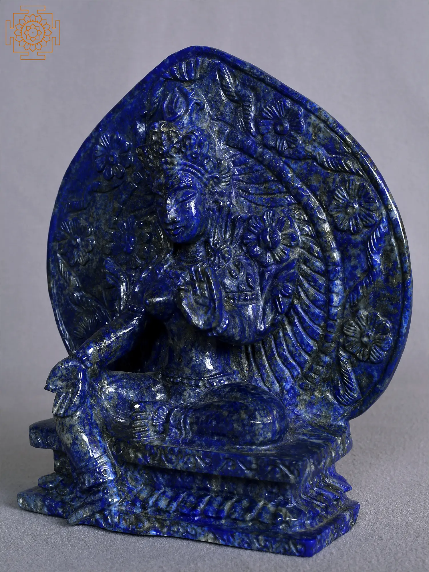 Also known as the “Stone of Heaven”, the ethereal lapis lazuli has been employed by the artist in making this Nepalese statue of Green Tara. An aureole patterned with blossomed flowers is attached to the throne of Green Tara who sits in the regal posture-Lalitasana. Lapis lazuli is legendary amongst societies and religions as a stone that heals and brings positive vibrations in the life of the keeper. Empowered by the potencies of the supremely benevolent Green Tara, this lapis lazuli statue is a powerful device to bring auspiciousness to your life.