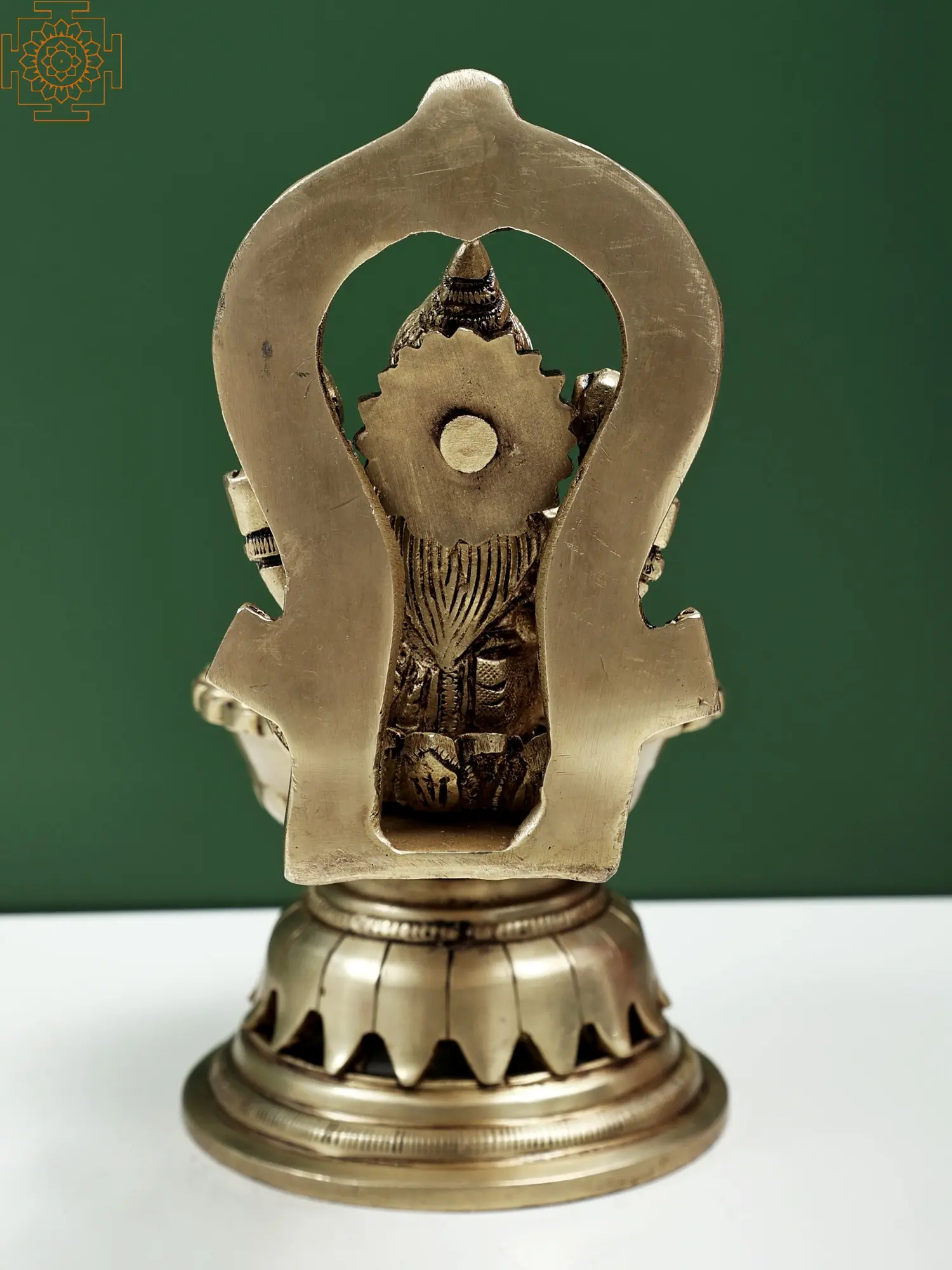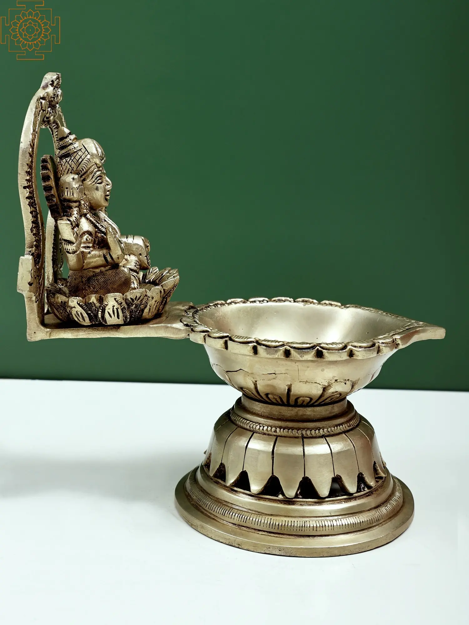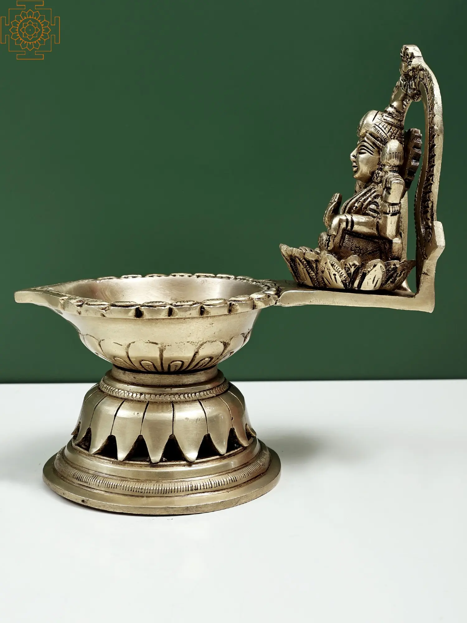 Lakshmi-Deepam, the ritual lamp with an icon of goddess Lakshmi is a sacred and auspicious component of the worship of the goddess of wealth and fortune. This Lakshmi deepam is crafted in pure brass, with the diya placed on a beautifully delineated inverted lotus. The throne of goddess Lakshmi is attached to the diya, with a lovely Kirtimukha prabhavali and Padmasana (lotus seat) for the goddess, who appears in her four-armed form, infusing the composition with her fortuitous energies.