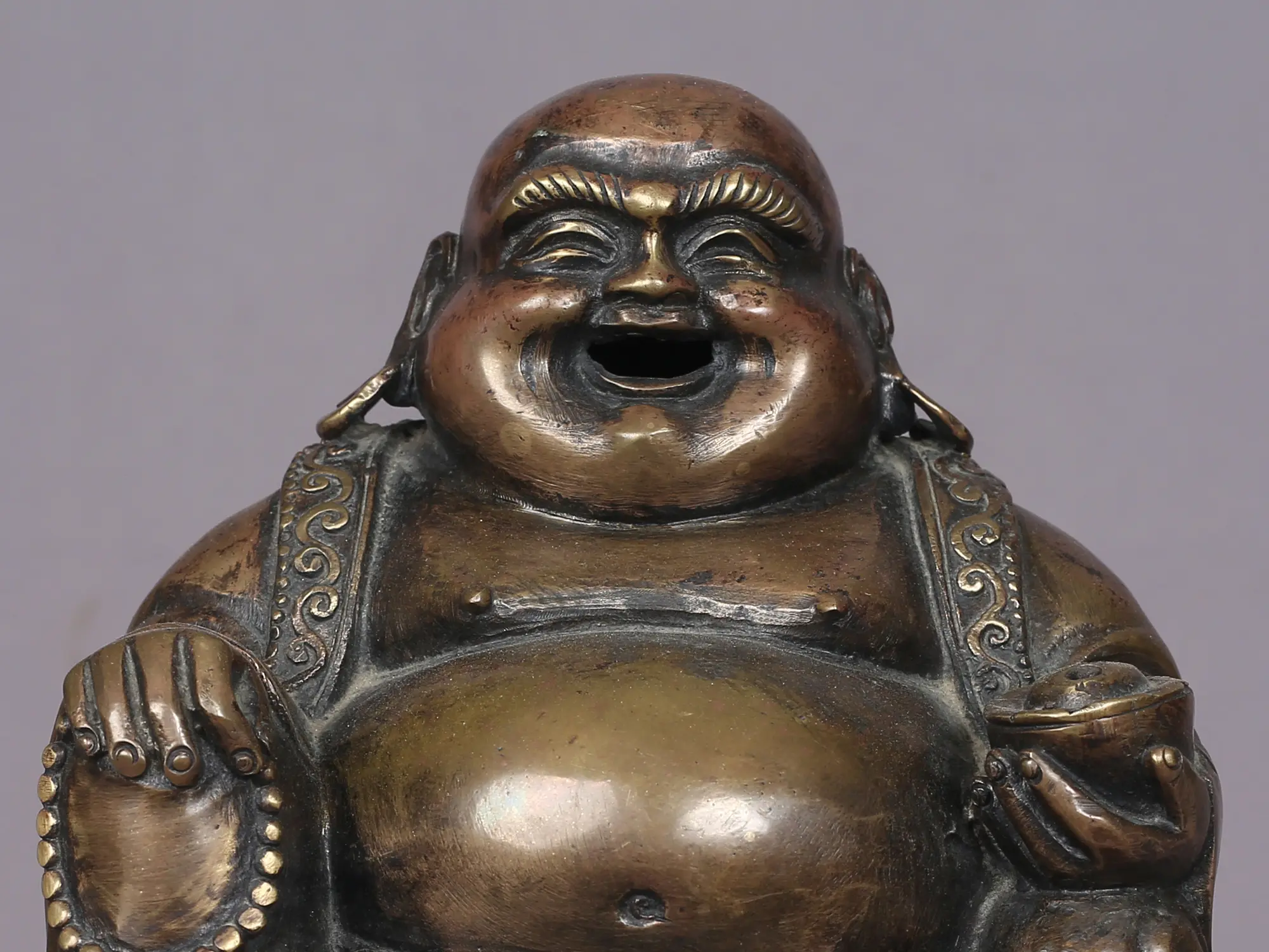 The Laughing Buddha is a powerful symbol of happiness, wealth, and good health. His jovial demeanor serves as a constant reminder to approach life with a positive outlook, embracing its challenges with grace and humor. He is often depicted holding a large bag, symbolizing the burdens of the world that he carries away, and a golden ingot or Ruyi scepter, signifying prosperity and good fortune. In this particular rendition, he is shown with a string of prayer beads, a testament to his spiritual devotion and the path to enlightenment. The rich, aged patina of the brass speaks to its authentic craftsmanship, often originating from regions steeped in spiritual artistry like Nepal. Each curve and contour of the statue has been sculpted to evoke a sense of serene joy and profound peace, making it a captivating centerpiece for any spiritual or decorative space. This piece is not merely an object but a conduit for positive energy, designed to bring harmony and good fortune into your life.