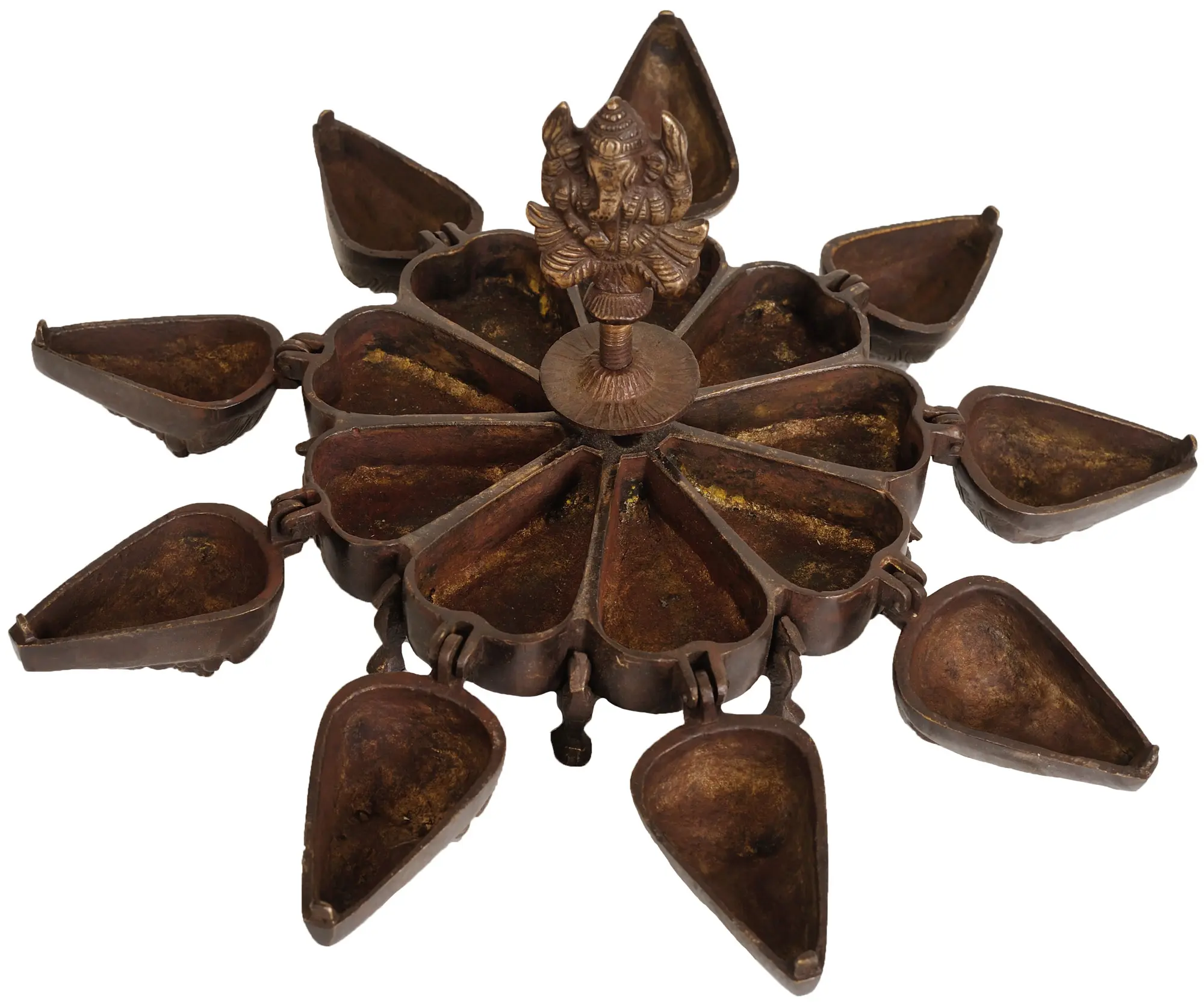 This handcrafted Kumkum Box with the sacred image of Lord Ganesha is a ceremonial artifact that combines religious iconography with ritualistic use. This box is made entirely of brass and has a Ganesha symbol in the center that is fastened into the box. It contains a total of nine compartments.  Loosening the Ganesha statue on top enables entry to each compartment as it blooms like a flower. It has been meticulously made. It may be used to maintain and keep ayurvedic powders, cosmetic items, spices, vermilion, and other powders safe. The antique brown patina-look box may also be a premium décor item.