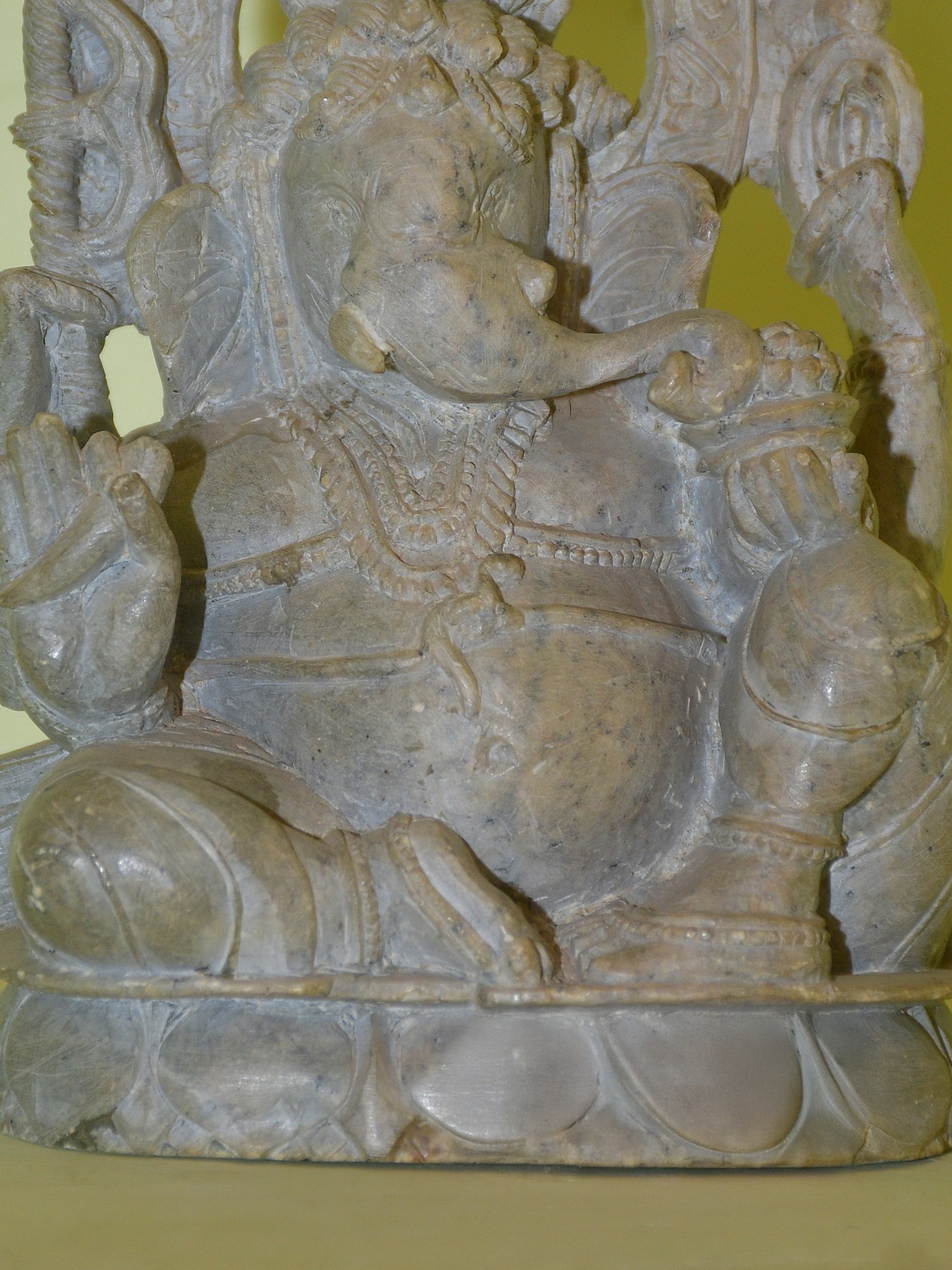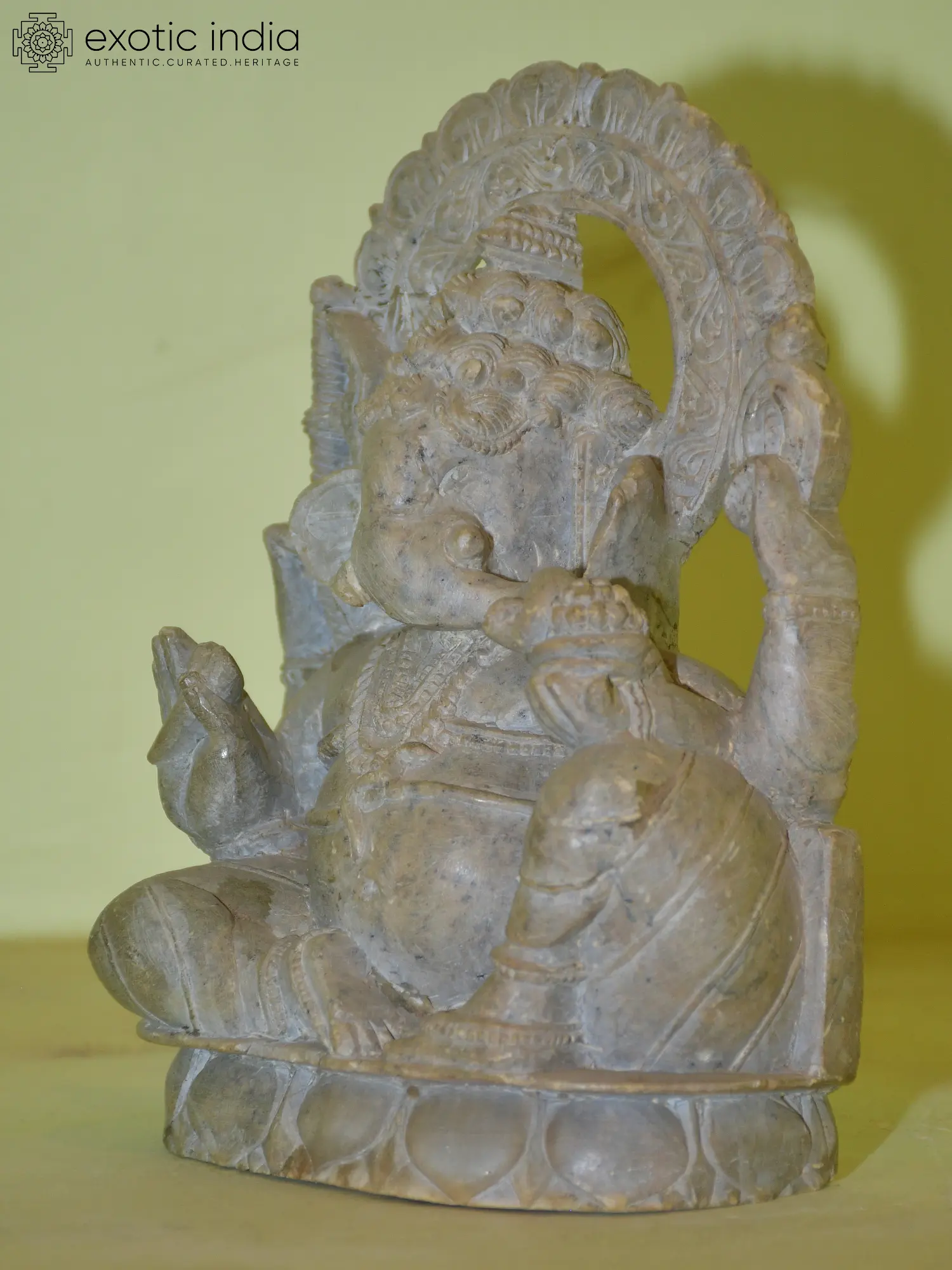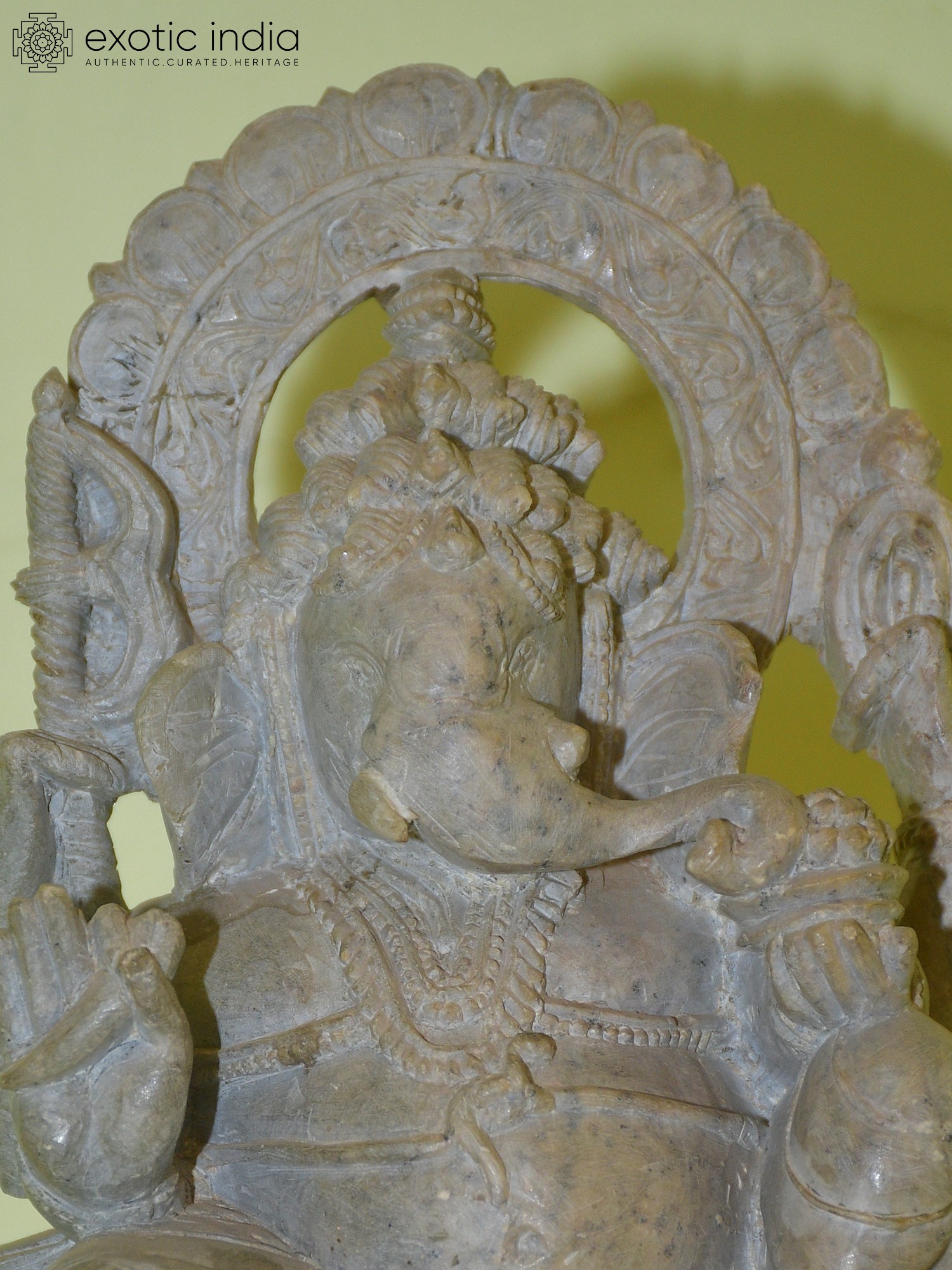This exquisite stone carving depicts Lord Ganesha, the beloved elephant-headed deity, seated regally upon an ornate throne. Crafted from fine red stone, this statue embodies the artistic heritage of Odisha, a region renowned for its masterful stone sculptures. The sheer artistry and devotional spirit poured into every curve and detail speak volumes of the artisan's skill, passed down through generations. The elephant head, symbolizing wisdom and intellect, is rendered with a gentle yet powerful expression. Ganesha’s large ears signify his ability to listen attentively, while his trunk, often shown curled, represents adaptability and a keen sense of direction. His single tusk, broken in battle or in the act of writing the Mahabharata, represents sacrifice and the overcoming of obstacles. This statue captures him in a benevolent posture, radiating an aura of peace and prosperity. ––––––––––
