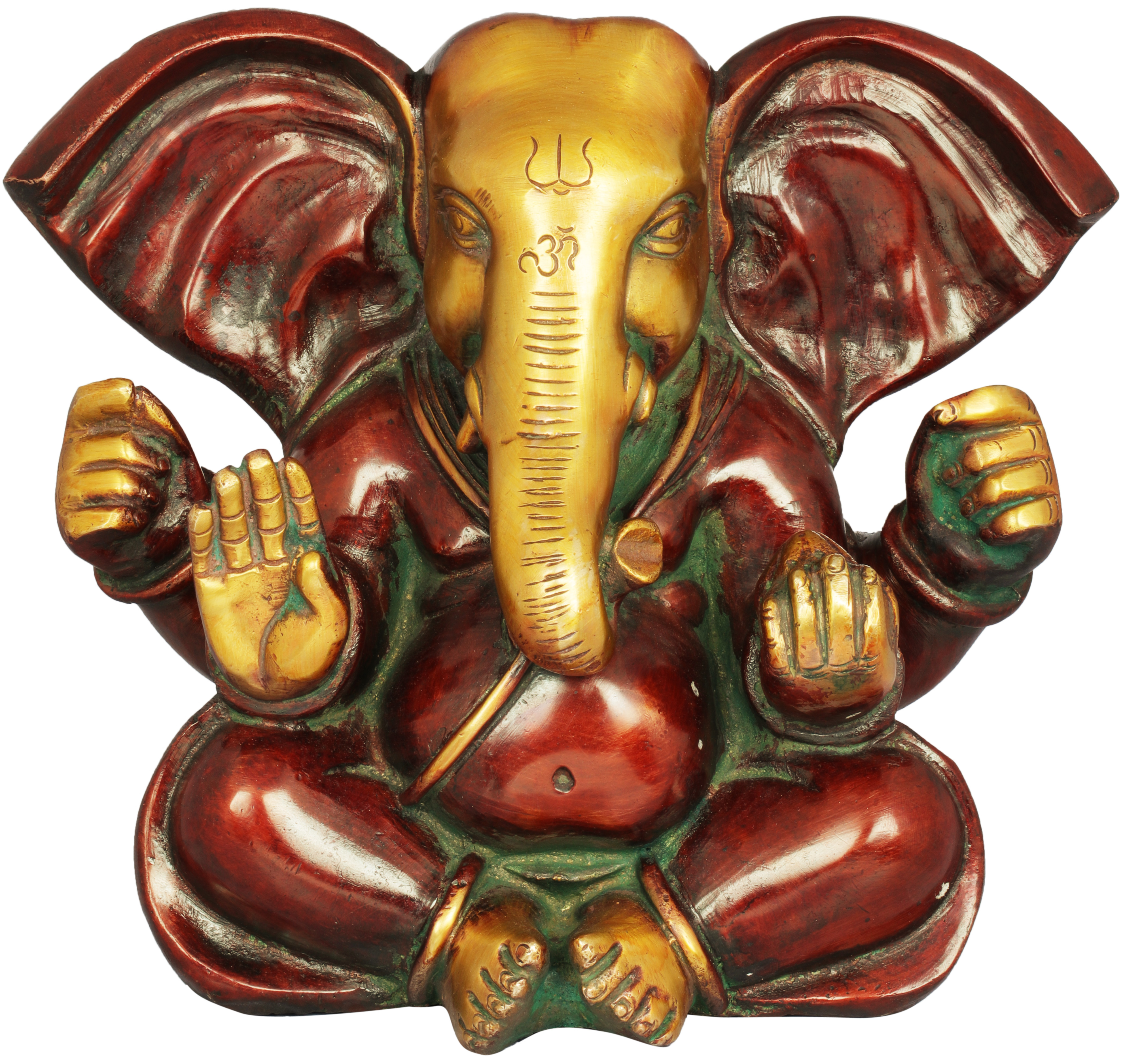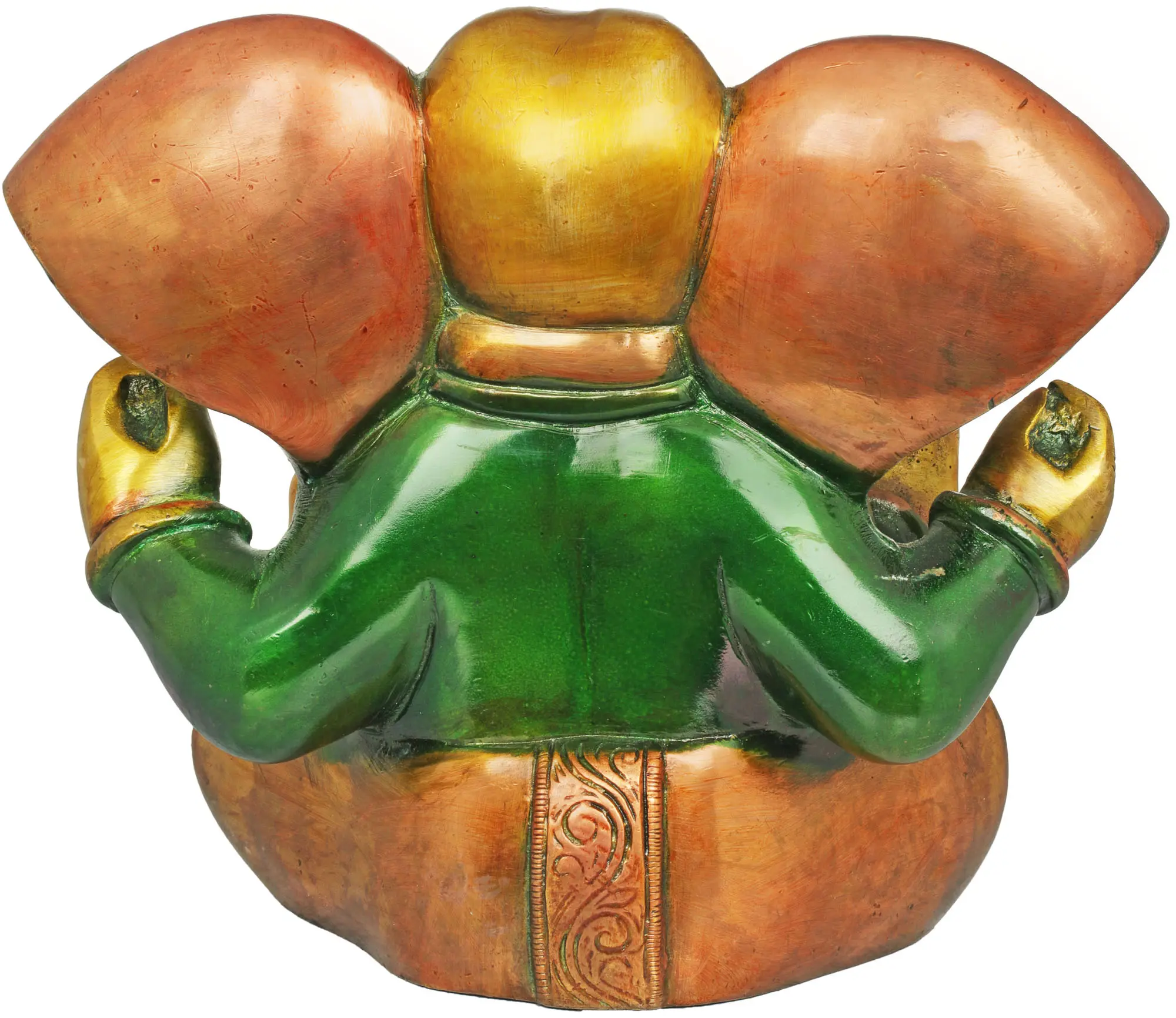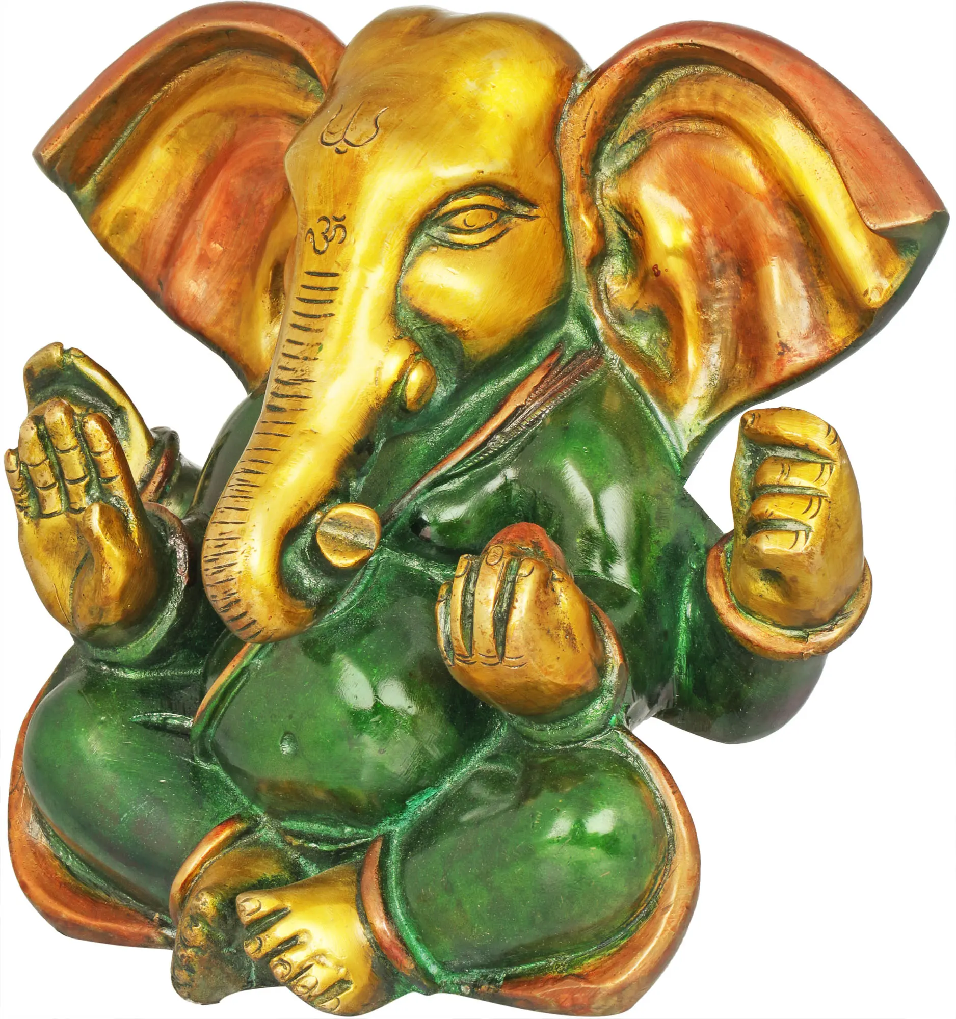 This captivating statue is cast in solid brass, a material revered for its durability and spiritual significance in Hindu traditions. The lustrous brass is brought to life with a striking combination of traditional gold and rich emerald green patinas, highlighting the divine form of the deity. Lord Ganesha's large, expressive ears, a prominent feature of this rendition, symbolize his ability to listen attentively to the prayers of his devotees. His gentle gaze and serene posture exude an aura of tranquility and divine grace. The subtle etchings on his trunk and the auspicious "Om" symbol on his forehead further enhance the spiritual resonance of this handcrafted masterpiece. Each detail, from the shape of his hands to the curve of his form, speaks to the artistry and devotion invested by the skilled artisans of India.