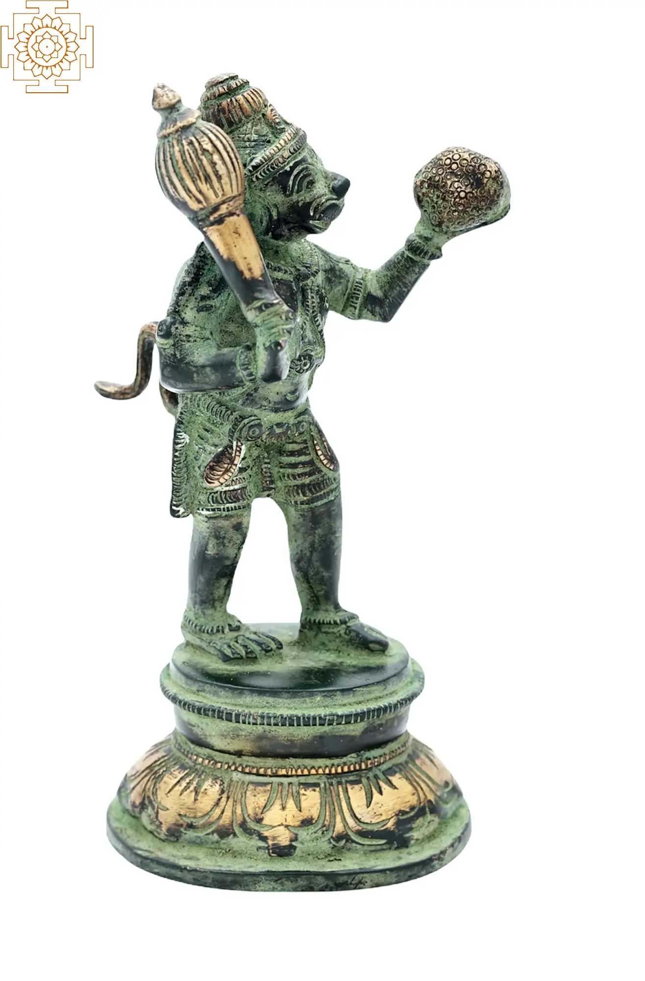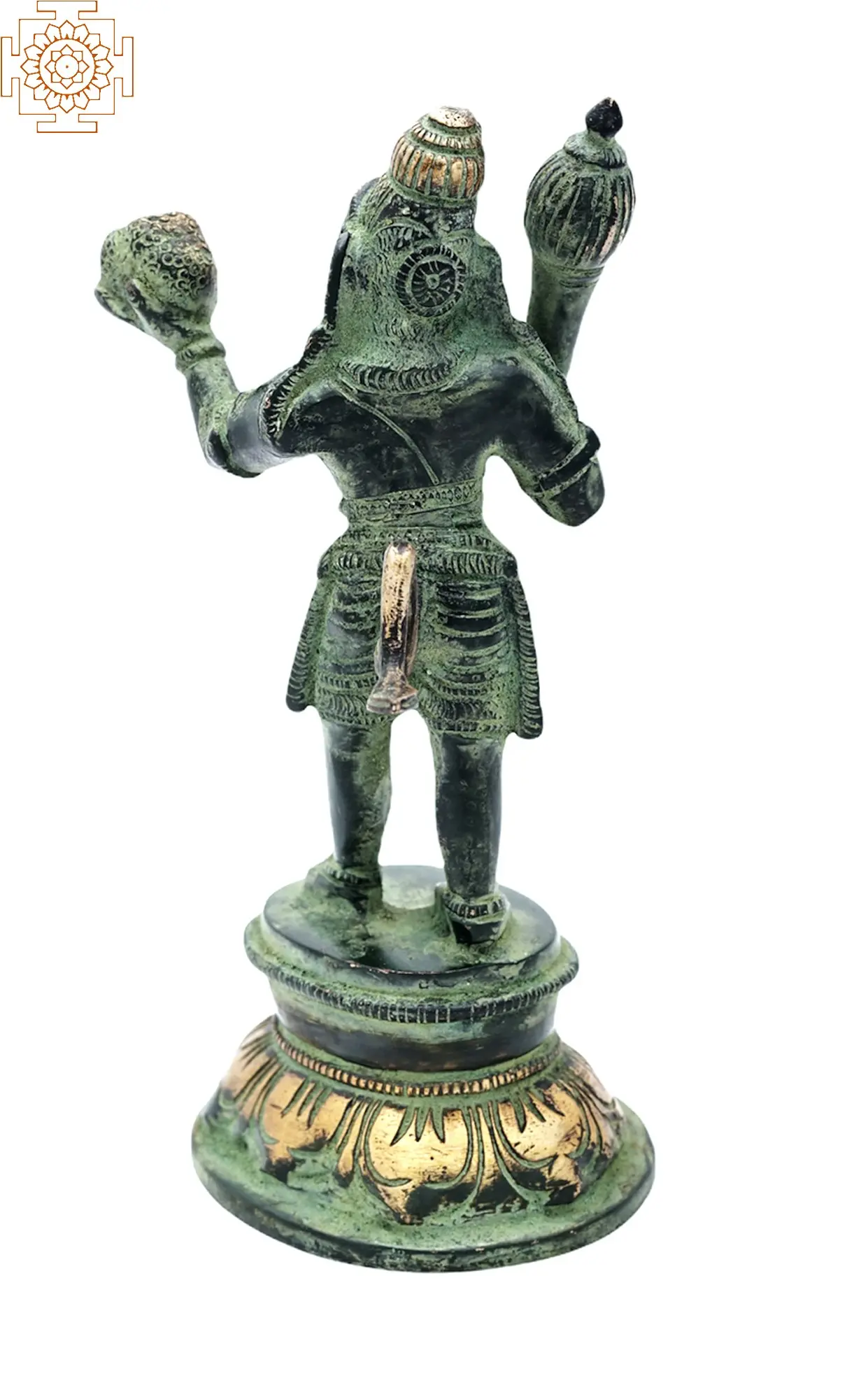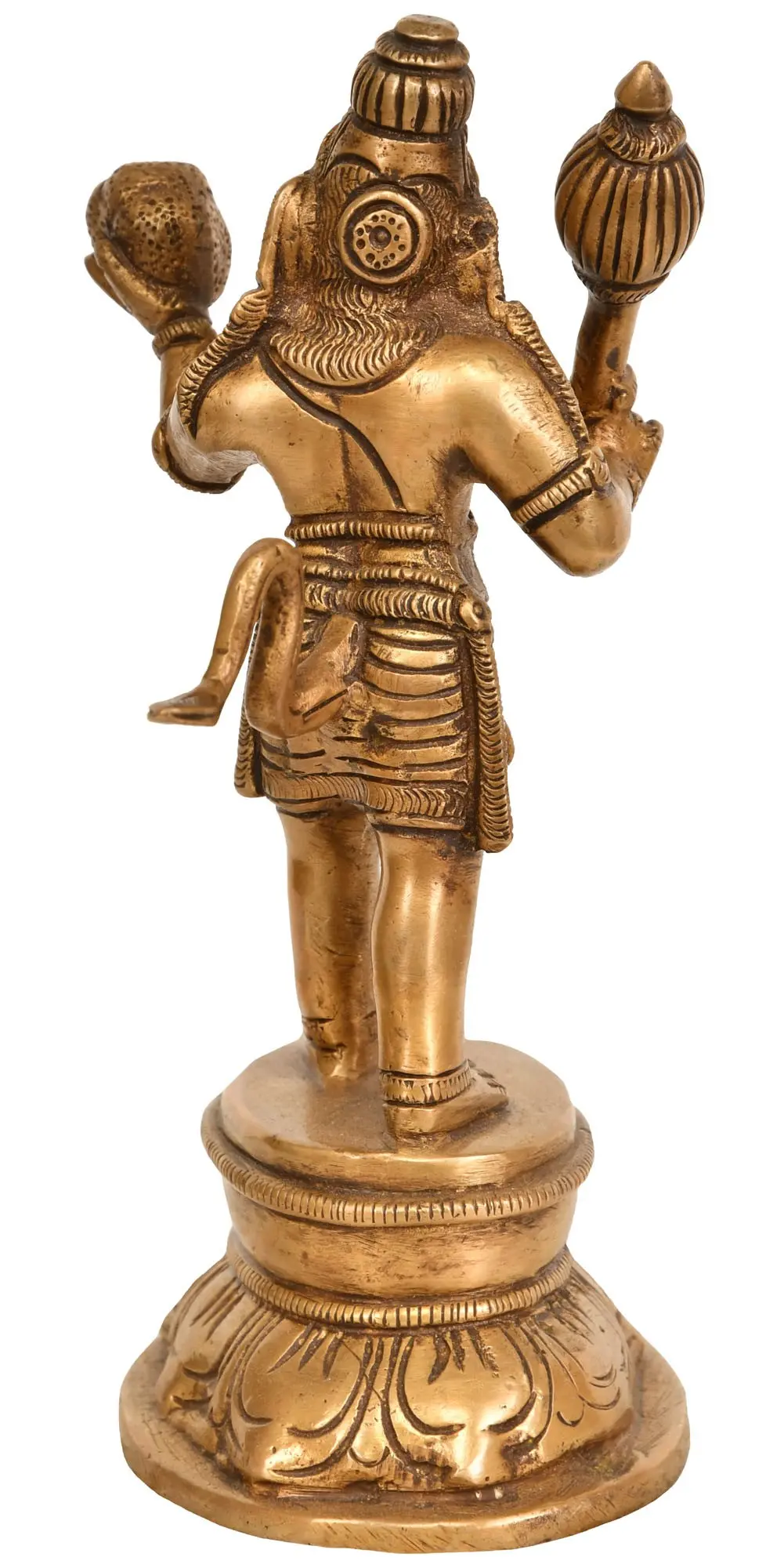 With Lord Hanuman holding his Gada and Sanjeevani - gracing your home or sacred space, invite the divine blessings of devotion, courage, and protection. Meditate upon the mighty Hanuman and feel his divine presence instilling strength and fearlessness within you. May his unwavering devotion inspire you to walk the path of righteousness, and may his healing grace bring peace and well-being to your life. The brass figurine is crafted in the traditional South Indian sculpture style, reflecting the rich cultural heritage of the region.
