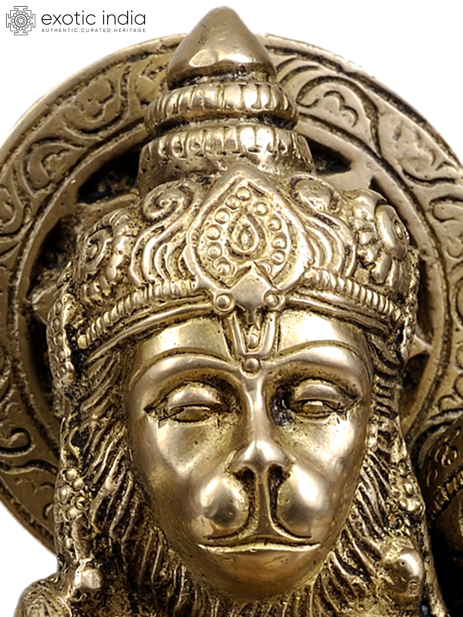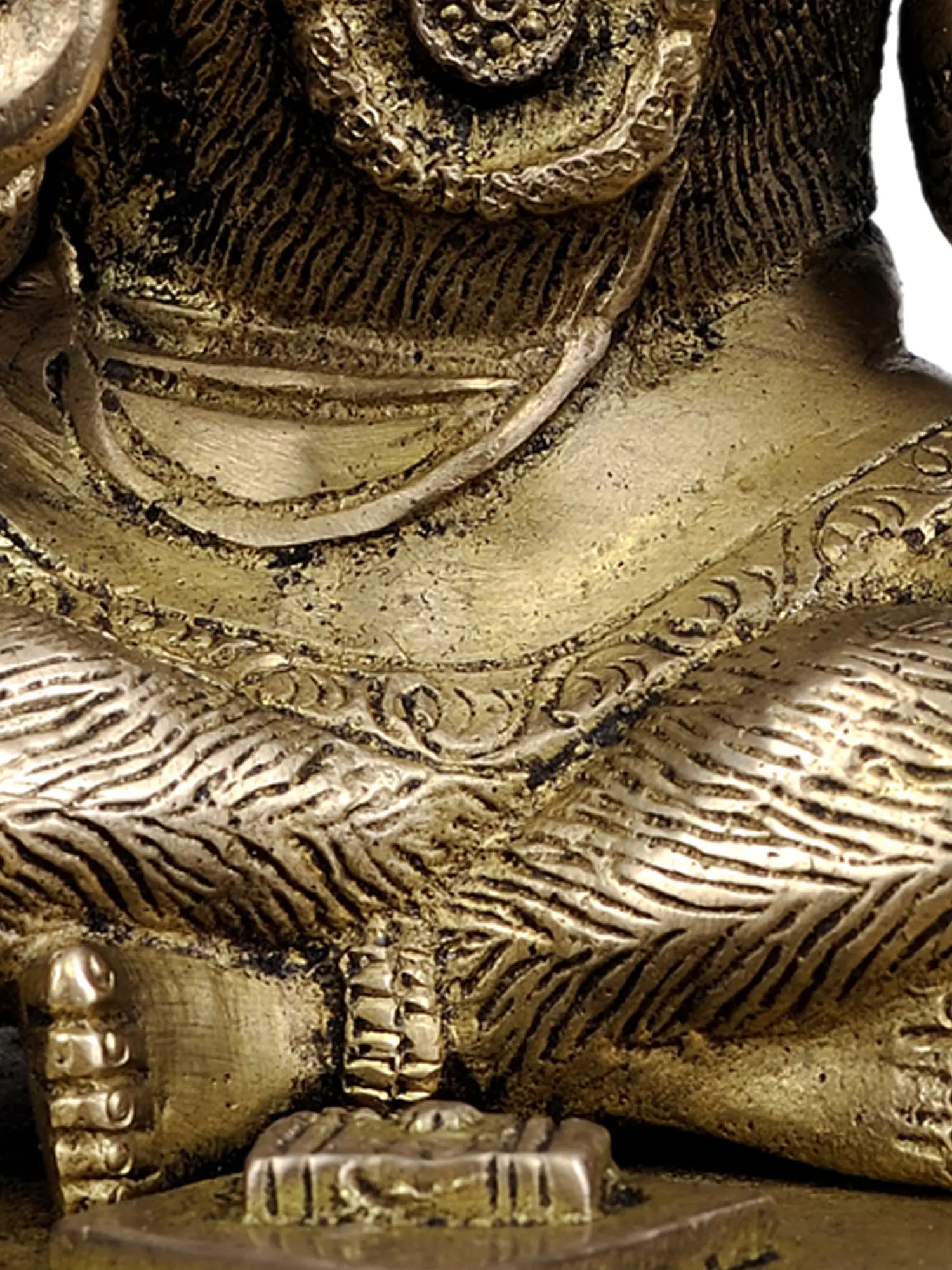 The depiction of Lord Hanuman bestowing the gesture of fearlessness and holding the Gada, intricately crafted in brass, symbolises strength and protection. Handmade in India, this sculpture captures Hanuman's valour and protective nature. The intricacies of this artwork invite contemplation on the strength and protective energy that Hanuman embodies, fostering an ambiance of security and might. Each detail within this sculpture encourages viewers to reflect on the protective power and unwavering strength of Lord Hanuman, creating an ambiance of assurance and protection.