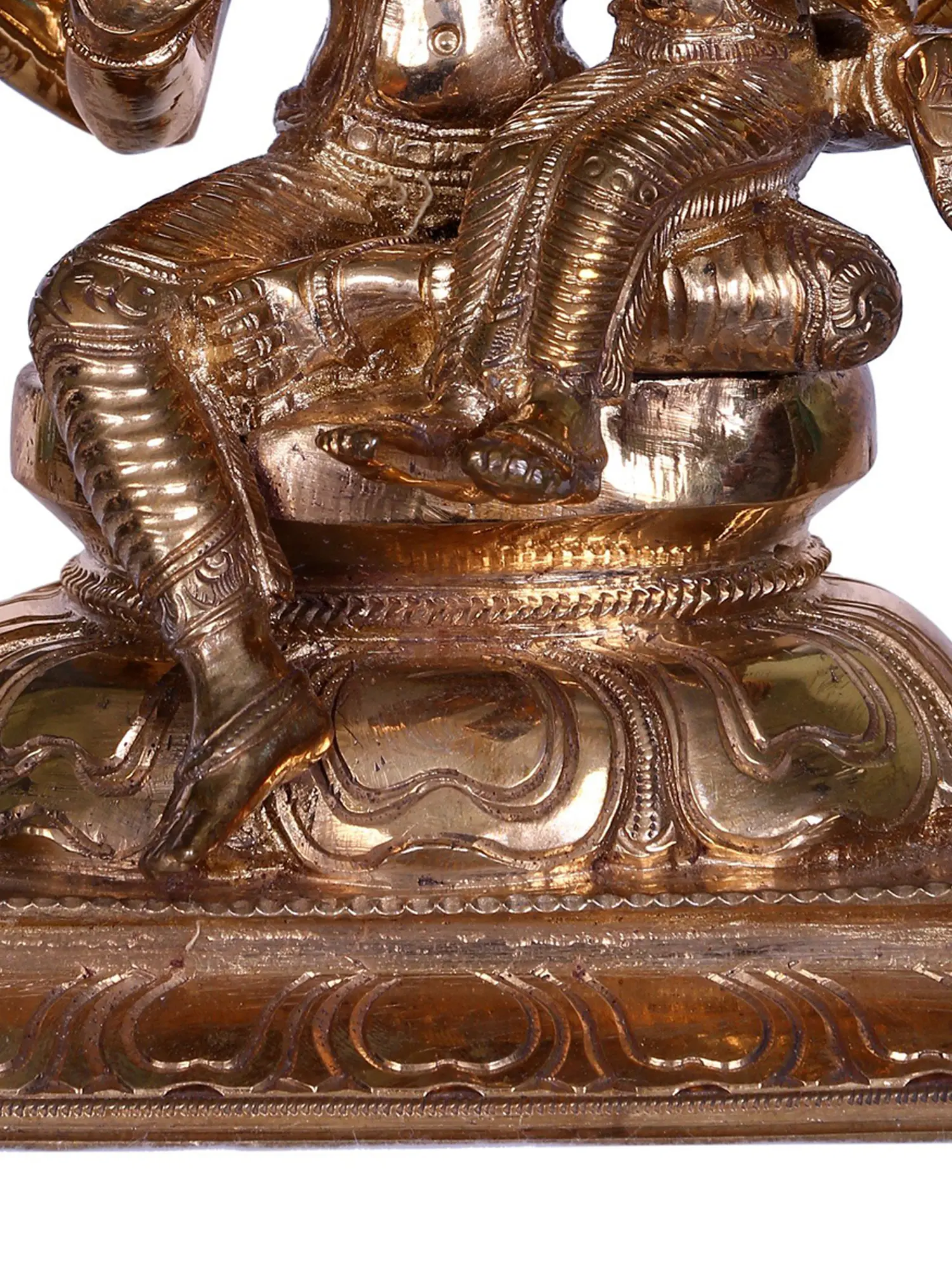 In this bronze artwork, Lord Narasimha, the fourth incarnation of Lord Vishnu who incarnated in the form of a half-man, half-lion to restore cosmic order. Here, He has been depicted with his consort Lakshmi, seated on his lap. In contrast to his Urja (terrible) aspect, where his face is contorted and enraged, he appears to be serene in this form. He carries his aspects of the Sudarshana Chakra and Panchajanya, and his idol is decorated with ornaments and garlands. His right hand is poised in “Abhaya Mudra”, showering the blessings of protection, strength, courage and fearlessness.