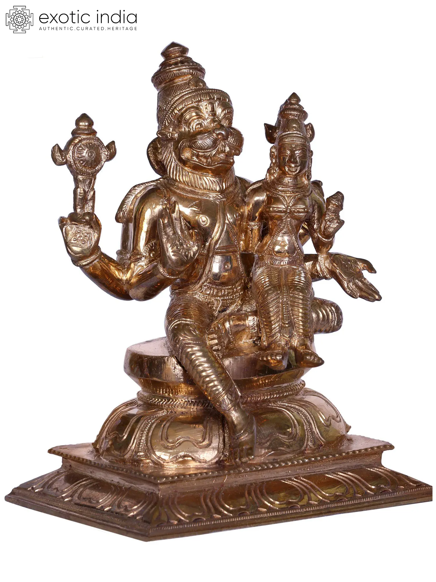 Goddess Lakshmi, also known as Padmapriya (the One who loves lotus), is the goddess of wealth, prosperity, and fortune. Lakshmi, the embodiment of purity and prosperity, is the consort of Lord Vishnu. She is worshipped for blessings related to material and spiritual abundance. When Lord Narasimha and Goddess Lakshmi are depicted together, it signifies a harmonious and auspicious union.