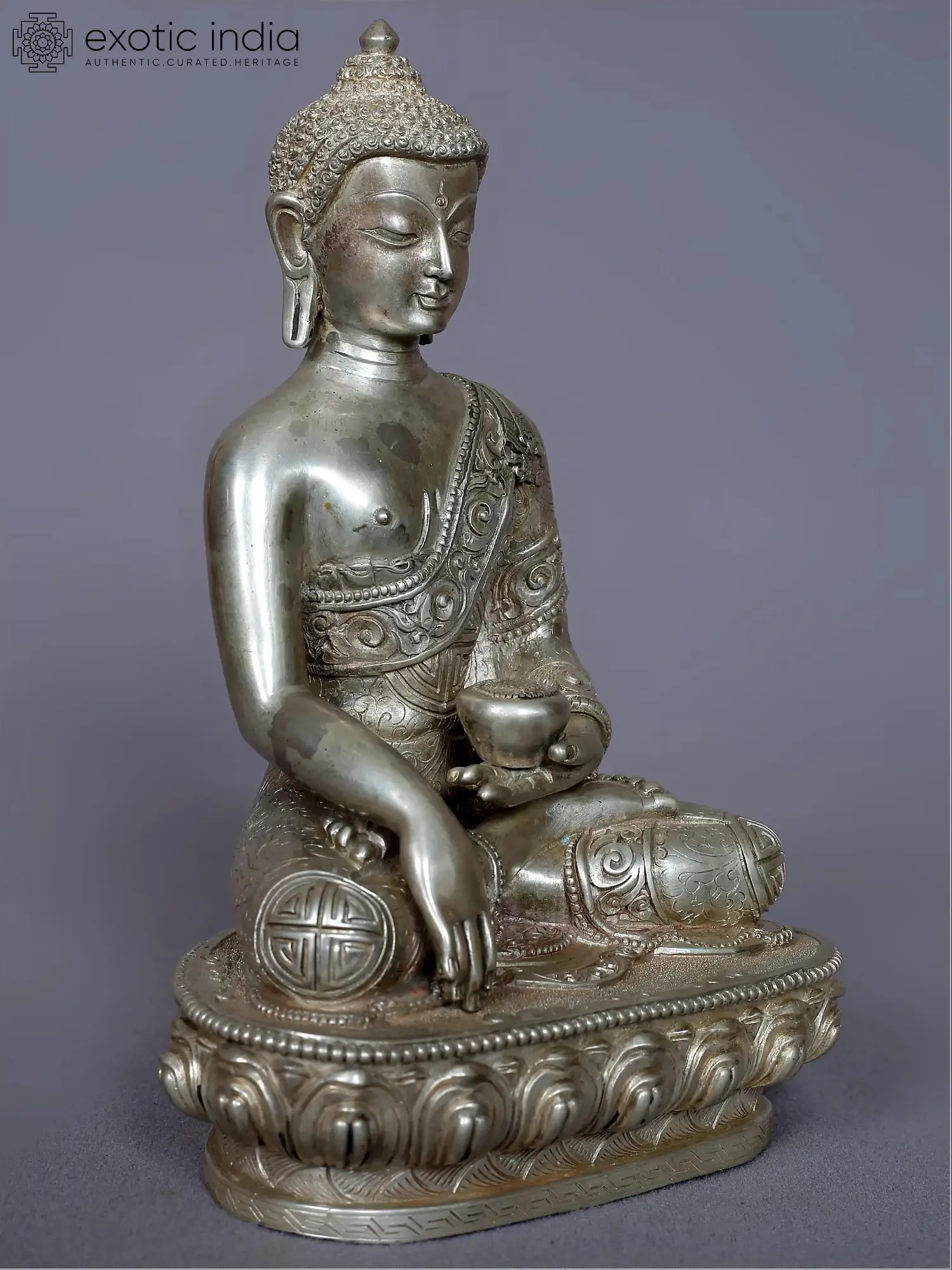 Casting a heavenly aura due to the use of pure silver in this Nepalese icon, Buddha has the calming energy of the full moon, soothing for the heart and mind. In a mediative state, Buddha is wrapped in stylistically decorated robes, carrying the monk’s bowl and with his hand in the Bhumisparsha mudra. Though not smiling, his face carries a pleasant quality that radiates around the statue, creating a positive ambiance. Looking inwardly, this silver Buddha invites the devotee to travel to the inner realms guided by this enlightened wisdom.