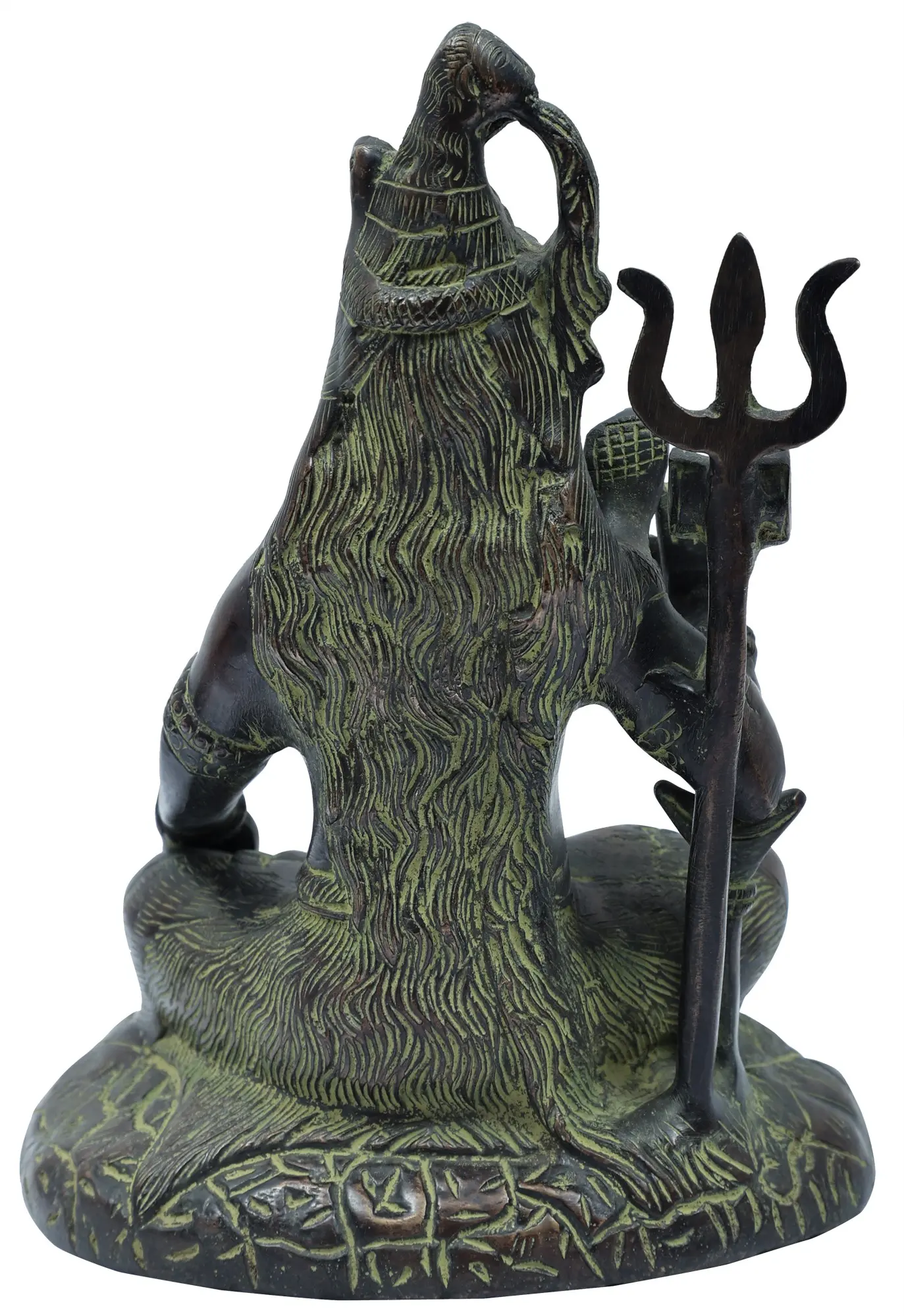 Each aspect of this brass idol is a testament to the skill of Indian artisans. The rich patina, achieved through a traditional process, lends an antique charm and highlights the intricate detailing of the sculpture. From the serene smile on Shiva's face to the subtle musculature of his form, every element is crafted with devotion and precision. The base of the idol, adorned with textures and a stylized depiction of a fierce creature, further enhances the visual appeal and symbolic depth. This piece is not merely a decorative item but a conduit of spiritual energy and a celebration of ancient Indian artistry.