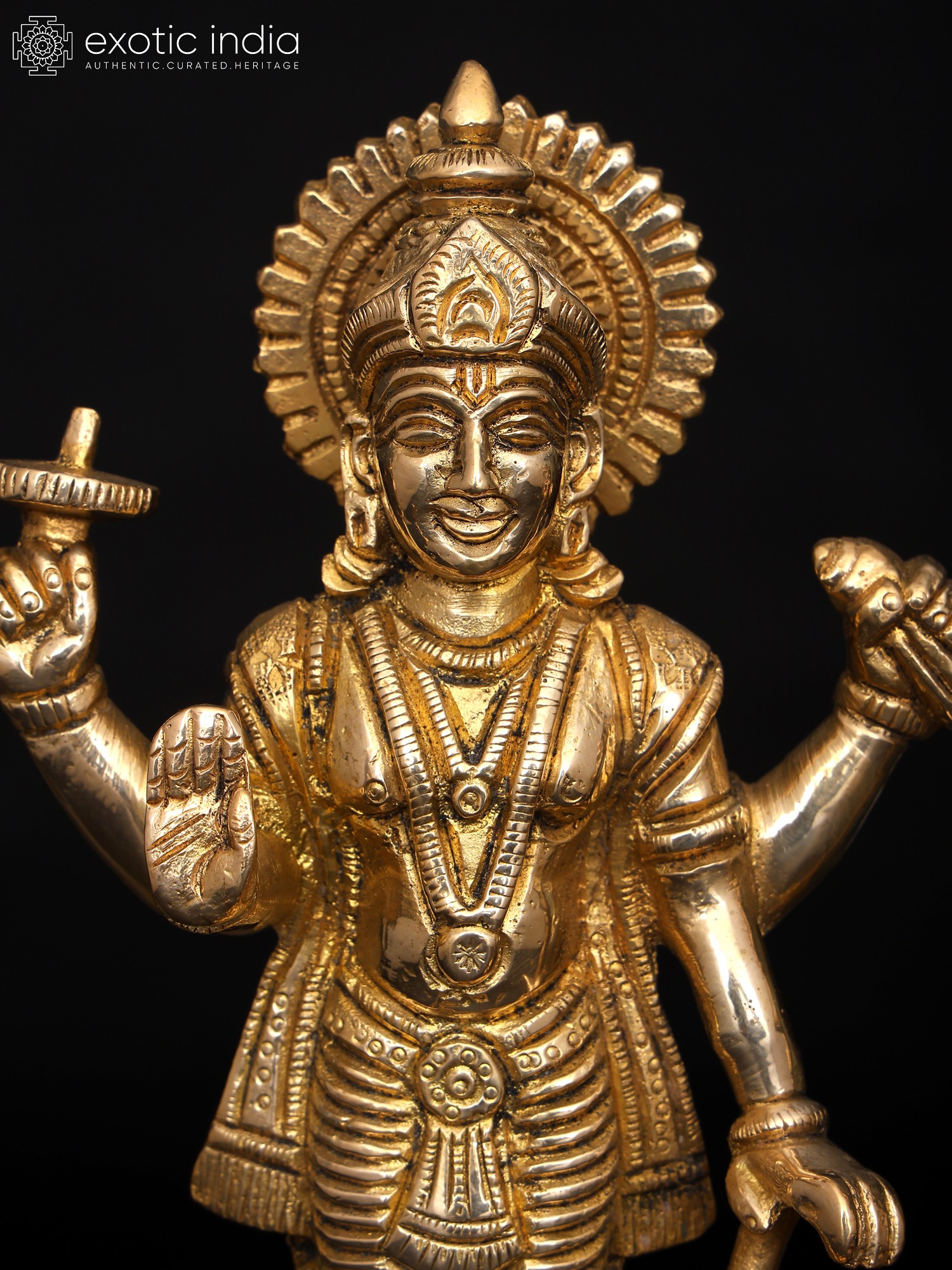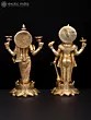This exquisite brass statue captures the divine union of Lord Vishnu, the preserver of the universe, and Goddess Lakshmi, the embodiment of wealth, prosperity, and auspiciousness. Standing serenely upon intricately crafted lotus blossoms, these deities represent a profound balance in the Hindu pantheon, signifying the interconnectedness of creation, sustenance, and abundance. The polished brass gleams with a timeless allure, reflecting the sacred energy and divine grace they emanate. Lord Vishnu, often depicted with four arms, holds symbols of his cosmic power: the Sudarshana Chakra (discus), the Panchajanya Shankha (conch), the Kaumodaki Gada (mace), and the Padma (lotus). He is the supreme being who incarnates in various avatars to restore cosmic order and protect righteousness. His presence is a source of strength, guidance, and protection for all beings. In Hindu cosmology, Vishnu's cosmic sleep on the serpent Shesha Naga is a period of rest that allows the universe to be maintained, highlighting his essential role in the cycle of existence. ––––––––––––––––––––