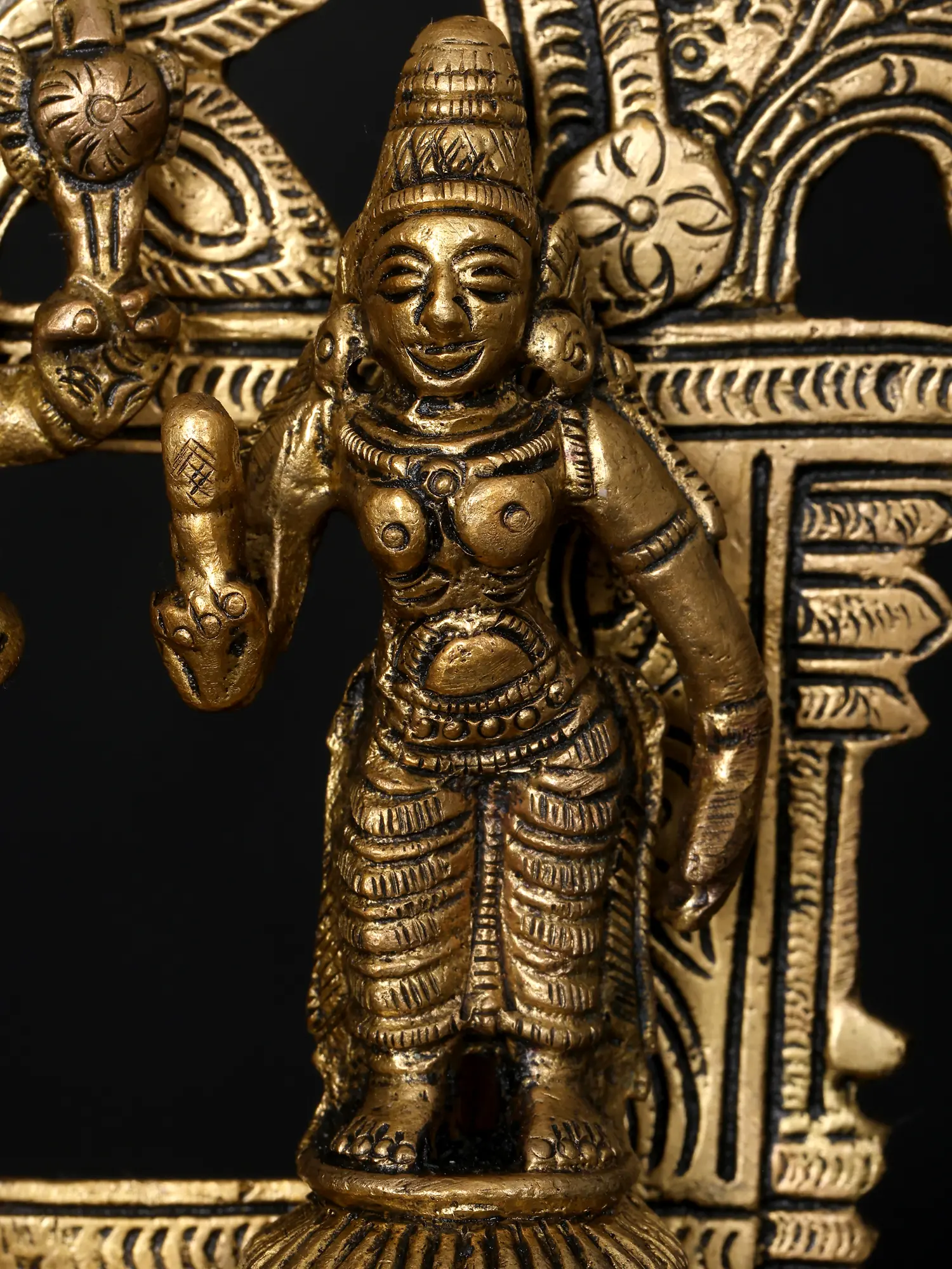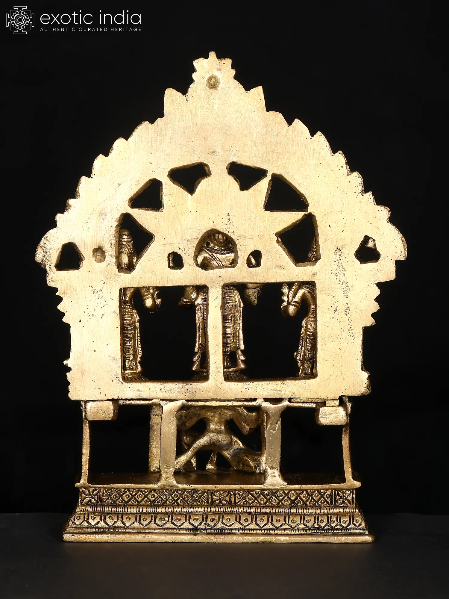The sculpture is elevated by the commanding presence of the Garuda pedestal. Garuda, the divine eagle-like mount of Lord Vishnu, is a powerful symbol of speed, strength, and loyalty. He is known for his unwavering devotion to Vishnu and his role in defeating evil forces. The Garuda's dynamic posture and keen gaze in this sculpture convey a sense of readiness and vigilant protection, reflecting Vishnu's swift intervention in times of need. The entire composition is framed by an ornate arch, intricately carved with traditional motifs, further enhancing the divine aura of the deities. The medium of brass adds a significant dimension to this masterpiece. Brass, an alloy of copper and zinc, has been a favored material for religious idols and decorative art in India for centuries. Its durability, malleability, and ability to take on intricate details make it ideal for capturing the finest nuances of divine forms. The skilled artisans have employed age-old techniques to bring this piece to life, imbuing it with a spiritual resonance that transcends the material. The warm, golden hue of the brass symbolizes auspiciousness and purity, making this sculpture a captivating addition to any sacred space or a cherished piece of art. This handmade creation is not merely an object but a conduit to the divine, a reminder of the eternal principles of dharma, prosperity, and earthly sustenance.