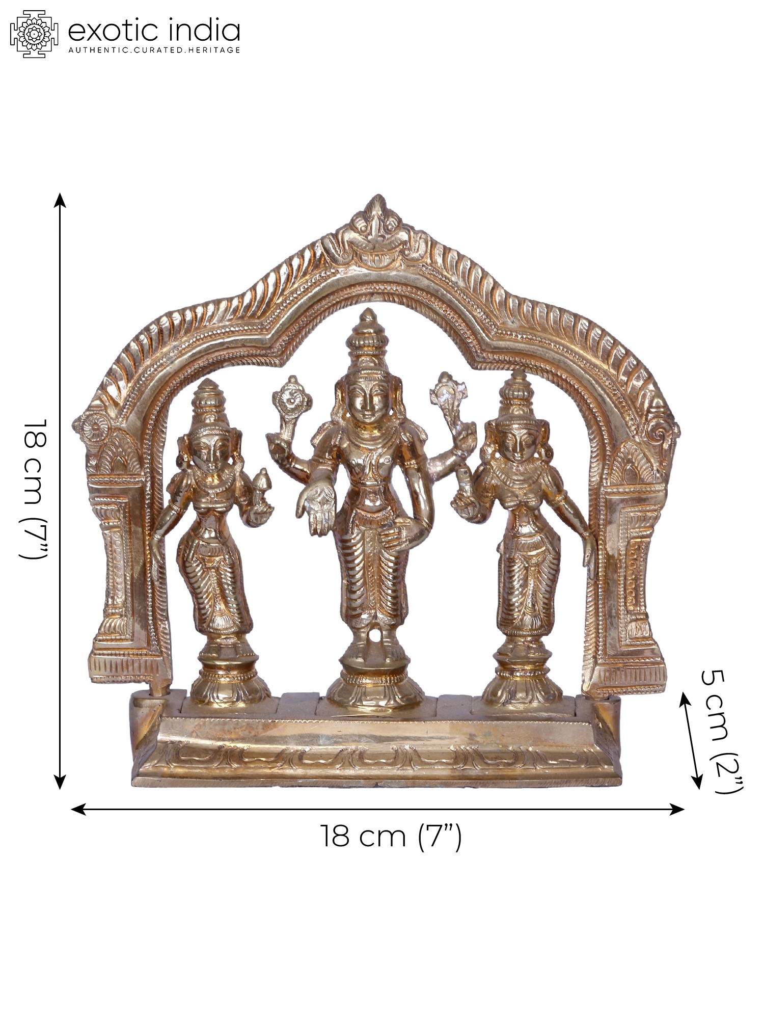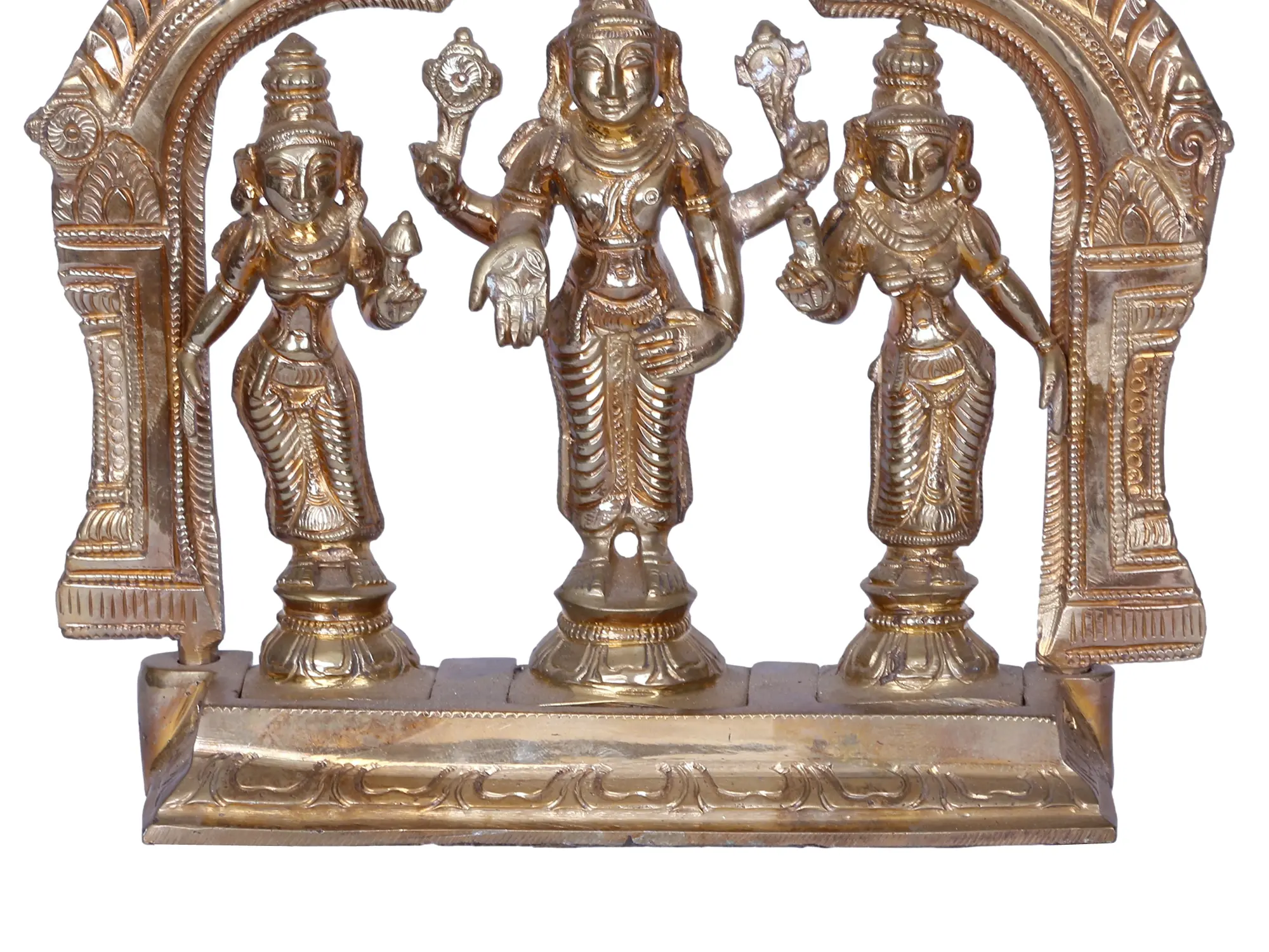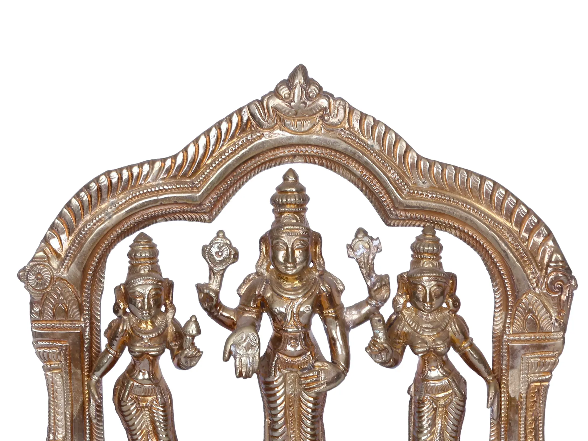 In the ethereal realm beneath the celestial “Kirtimukha throne”, Lord Vishnu, the preserver and sustainer of the Universe, stands adorned in divine majesty, flanked by his celestial consorts, Sridevi and Bhudevi. Their presence evokes an eternal dance of cosmic harmony. Sridevi and Bhudevi, delicate as lotuses, cradle the essence of creation. Lord Vishnu, with upper hands wielding a goad and noose, signifies divine control over cosmic forces. His right hand extends in “Varada Mudra”, an eternal bestowal of blessings, while the left, poised to receive, symbolises humanity’s surrender to the cosmic dance. Crafted in bronze, this celestial trio encapsulates the cosmic balance, where creation, preservation, and dissolution unite in the eternal cosmic tapestry.