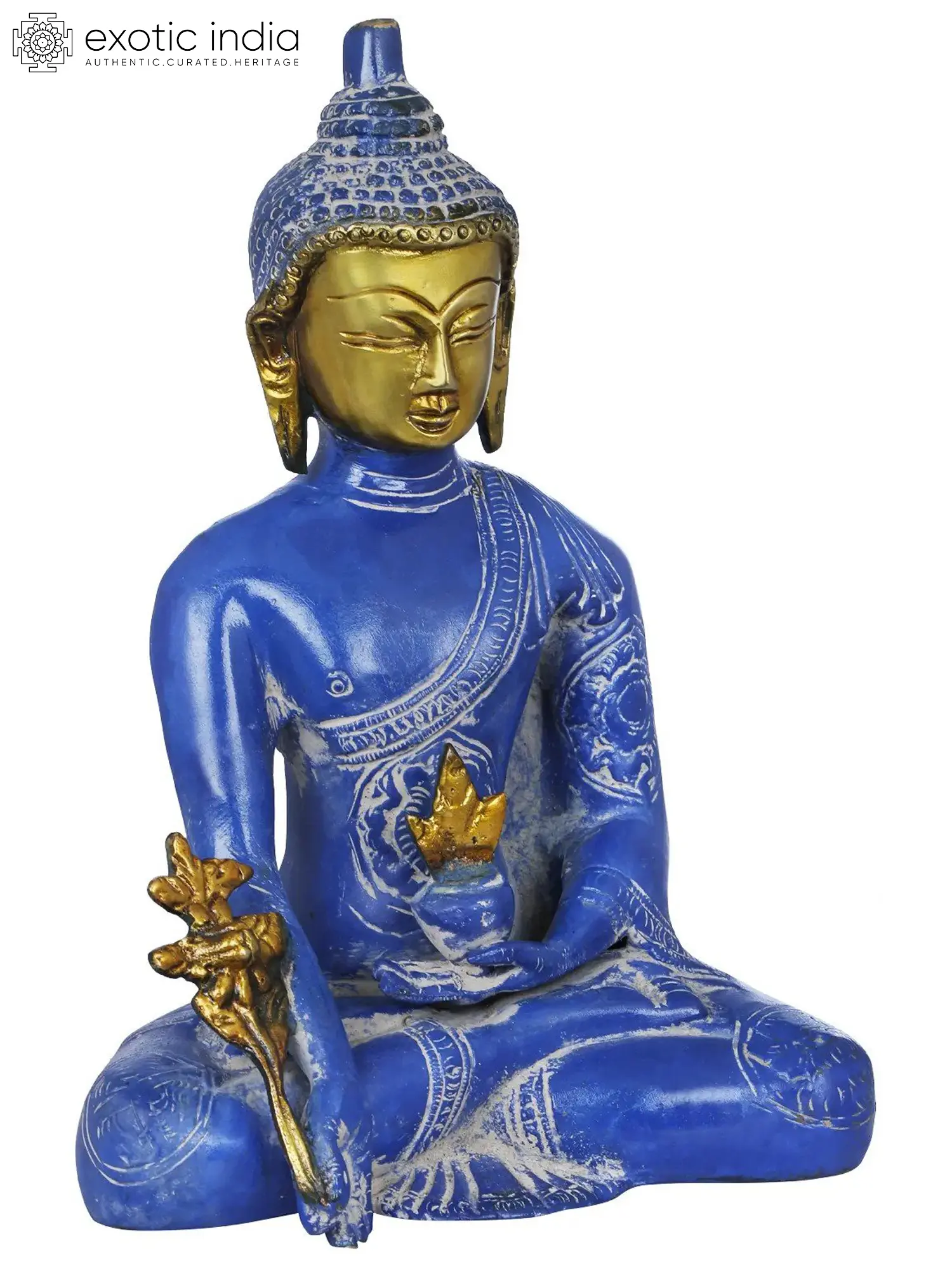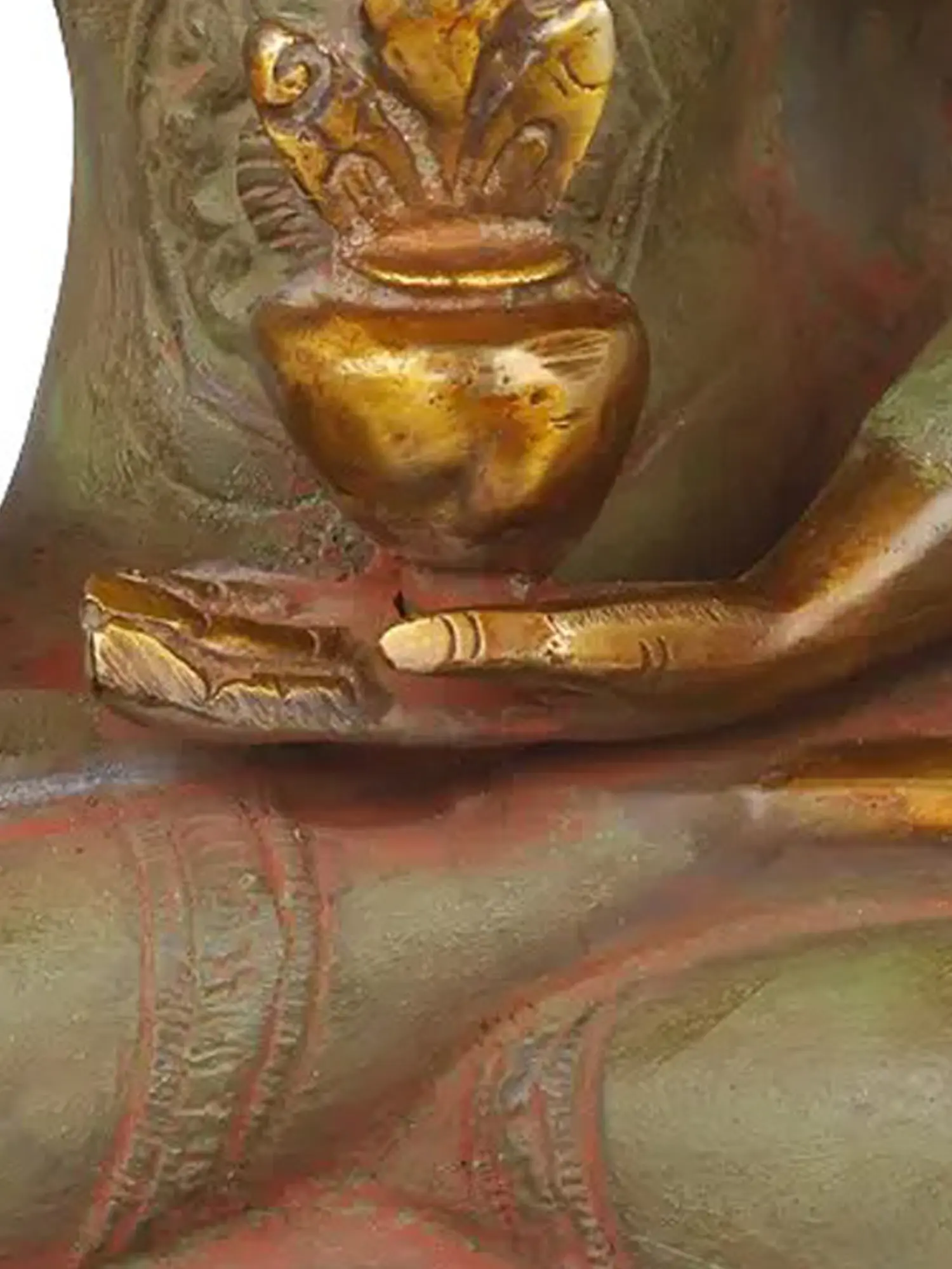 In the artistry of brass, the Medicine Buddha emerges as a profound embodiment of healing and compassion in the Tibetan Buddhist tradition. The intricately crafted statue showcases the deity's serene expression and the symbolic healing bowl, radiating a sense of spiritual tranquility. The golden warmth of brass enhances the sacred aura, symbolizing enlightenment and the alleviation of suffering. This representation beckons contemplation on the transformative power of compassion and the journey toward spiritual well-being. Beyond a mere work of art, the brass statue becomes a conduit for the healing wisdom embodied by the Medicine Buddha, inviting a connection to the profound teachings of Tibetan Buddhism.