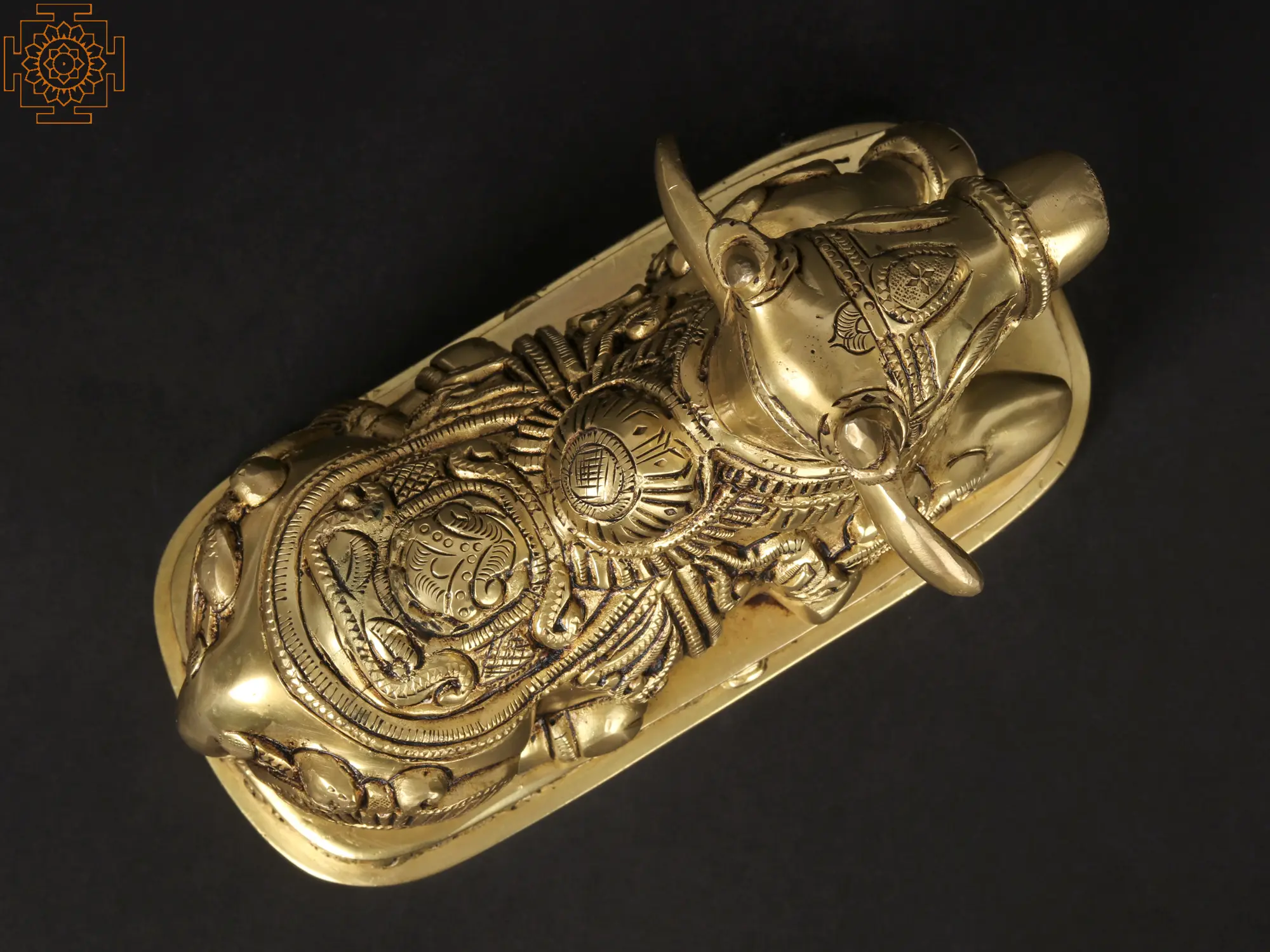 This exquisite brass rendition of Nandideva, the sacred bull and revered vahana, or mount, of Lord Shiva, is a testament to divine grace and unwavering devotion. Crafted with meticulous attention to detail, the sculpture captures the serene yet powerful essence of this celestial being. Nandideva is not merely a transport for the great Shiva; he is the embodiment of dharma, righteousness, and the unyielding strength that supports the cosmic dance of creation and destruction. His presence signifies purity, loyalty, and the disciplined mind, qualities essential for spiritual progress. The rich, warm hue of the brass enhances the divine aura of the sculpture, reflecting the timeless traditions of Indian artistry. Each curve and contour of Nandideva's form is rendered with remarkable precision, from the gentle turn of his head, seemingly ever-vigilant in his service, to the majestic humps and the intricately decorated saddle adorning his back. The ornate patterns speak to the grandeur of the divine realms and the sacred duty Nandi undertakes as Shiva's constant companion.