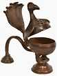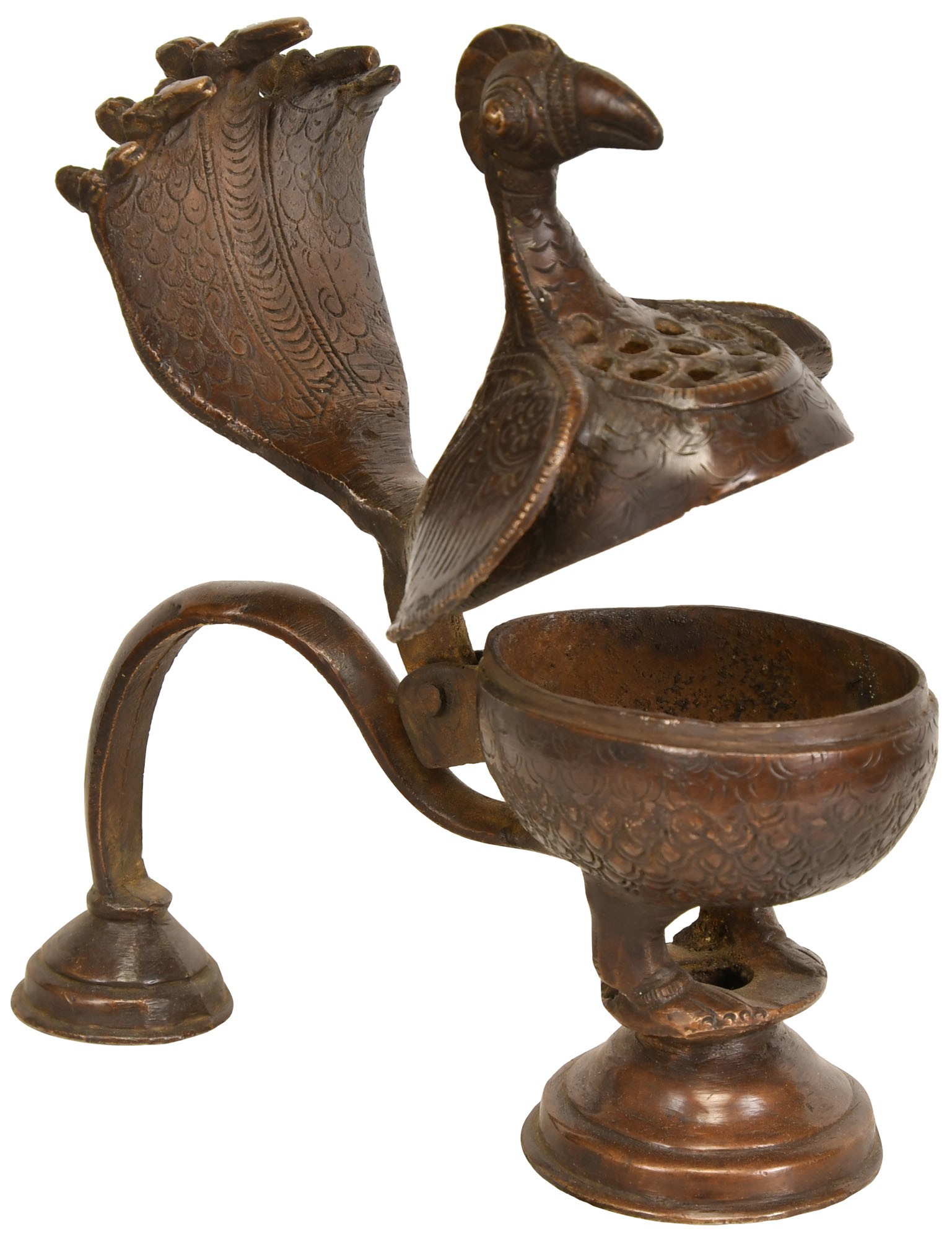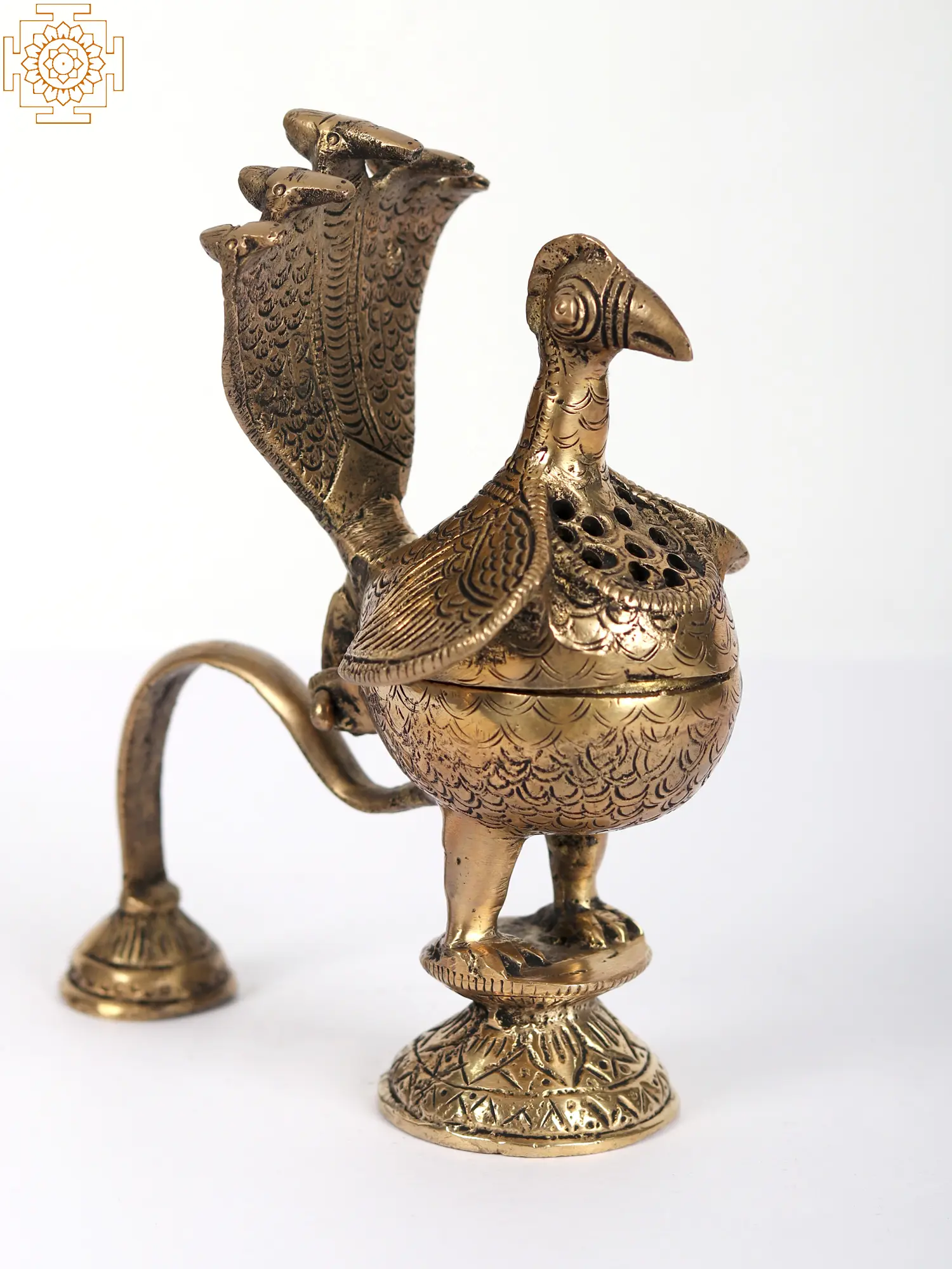 This metal incense burner is a classic practical item used for Dhuma Pana. This incense burner is made of durable metals such as brass and will last for centuries. It has an image of a peacock as the incense burner and a handle to hold it. The peacock has long been associated with wealth and majesty. The benefits of Dhuma Pana, or breathing smoke for health benefits, have been discussed in Charakh Samhita, the ancient Ayurvedic literature. Dhuma Pana is said to be effective in treating coughs, colds, and rhinitis, as well as making it easier to breathe. The peacock's body is pierced with holes, allowing the smoke to spread. The body is separated into two sections: the upper piece serves as a cover, while the lower portion serves as a container for burning incense. This incense burner is a functional object and a work of beauty that exudes tranquility.