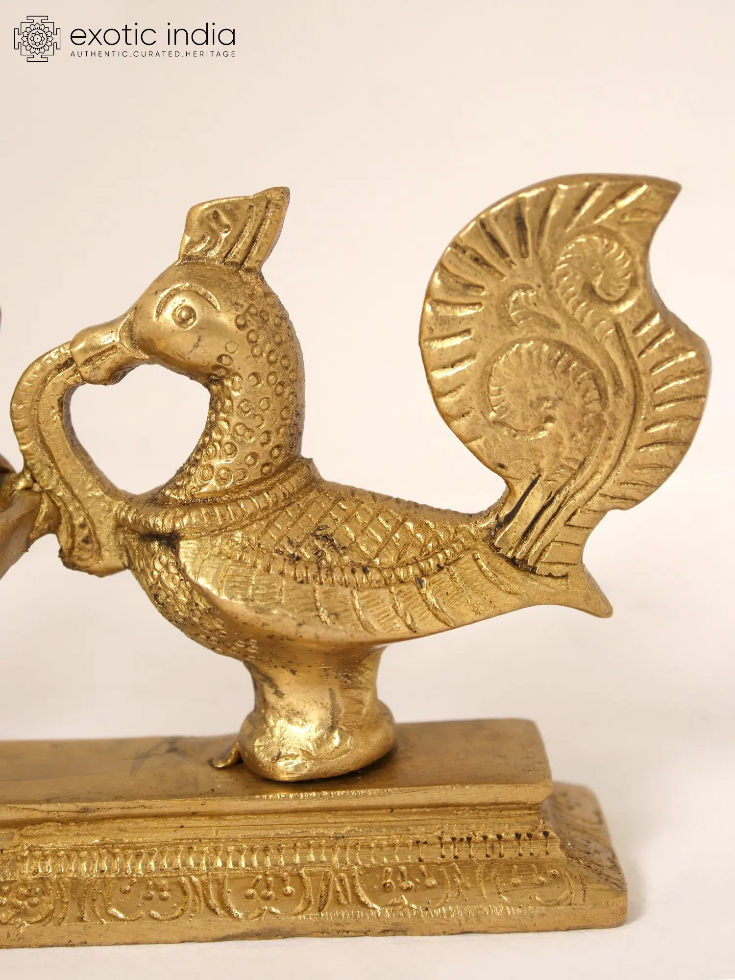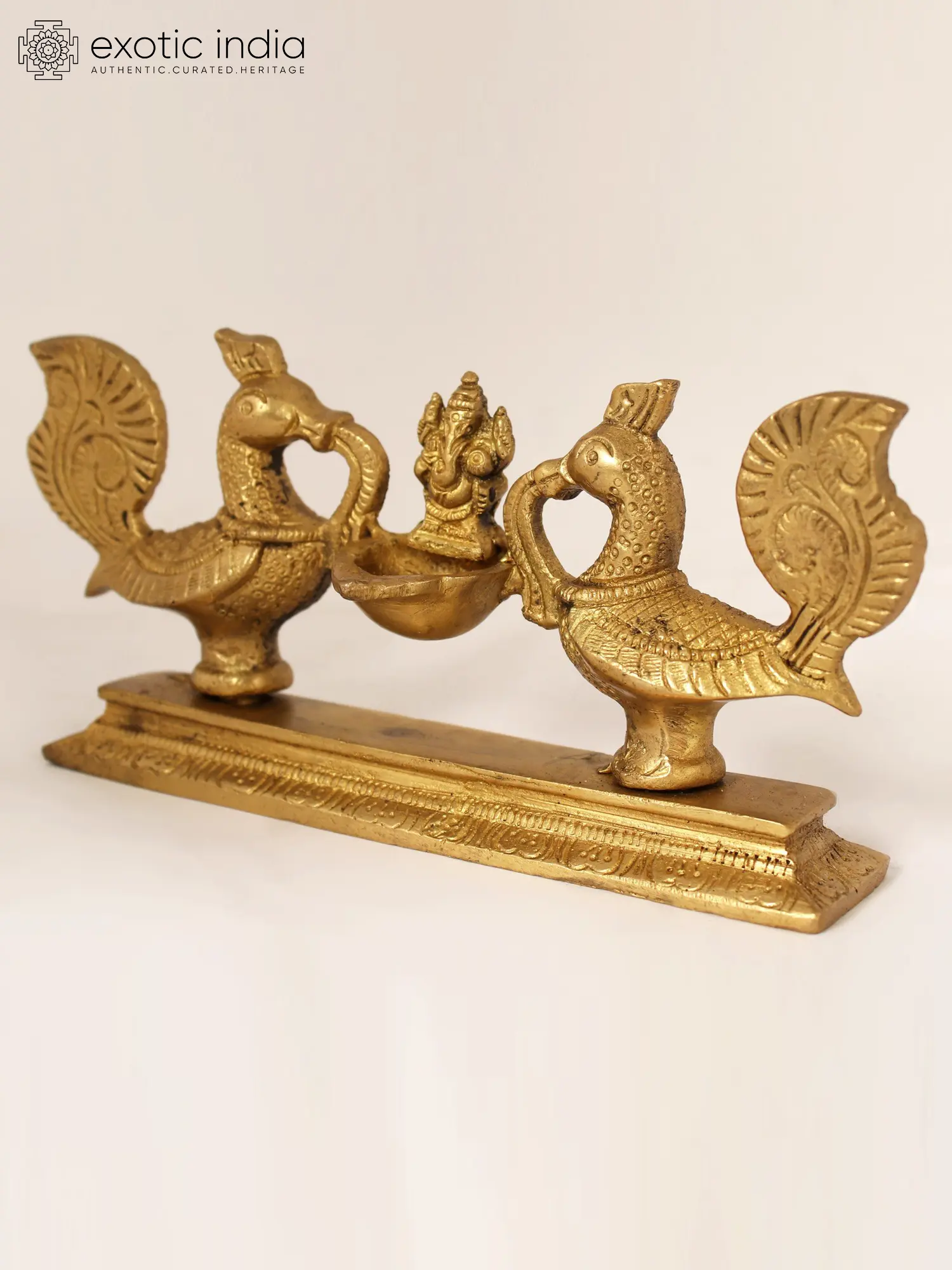 The Moreshwar or Mayureshwar form of Lord Ganesha is worshipped in the Western Indian state of Maharashtra. There is also a shrine dedicated to this form. The legends have its Lord Ganesha rode a Mayura or peacock to slay the demon, Sindhu. Since then, his Mayureshwar form is worshipped with him either sitting on a peacock or with two peacocks on both sides. This brass lamp with two peacocks holding a branch and a lamp suspended between them with a Ganesha crown is a homage to the Mayureshwar image of Lord Ganesha. The lamp is full of ritualistic symbolism. There is a depiction of growth in the branches of the tree and the peacock is a symbol of grace. Lord Ganesha is a patron of Shubh or auspiciousness. Lighting this lamp will initiate the incoming of positive vibes into a space.