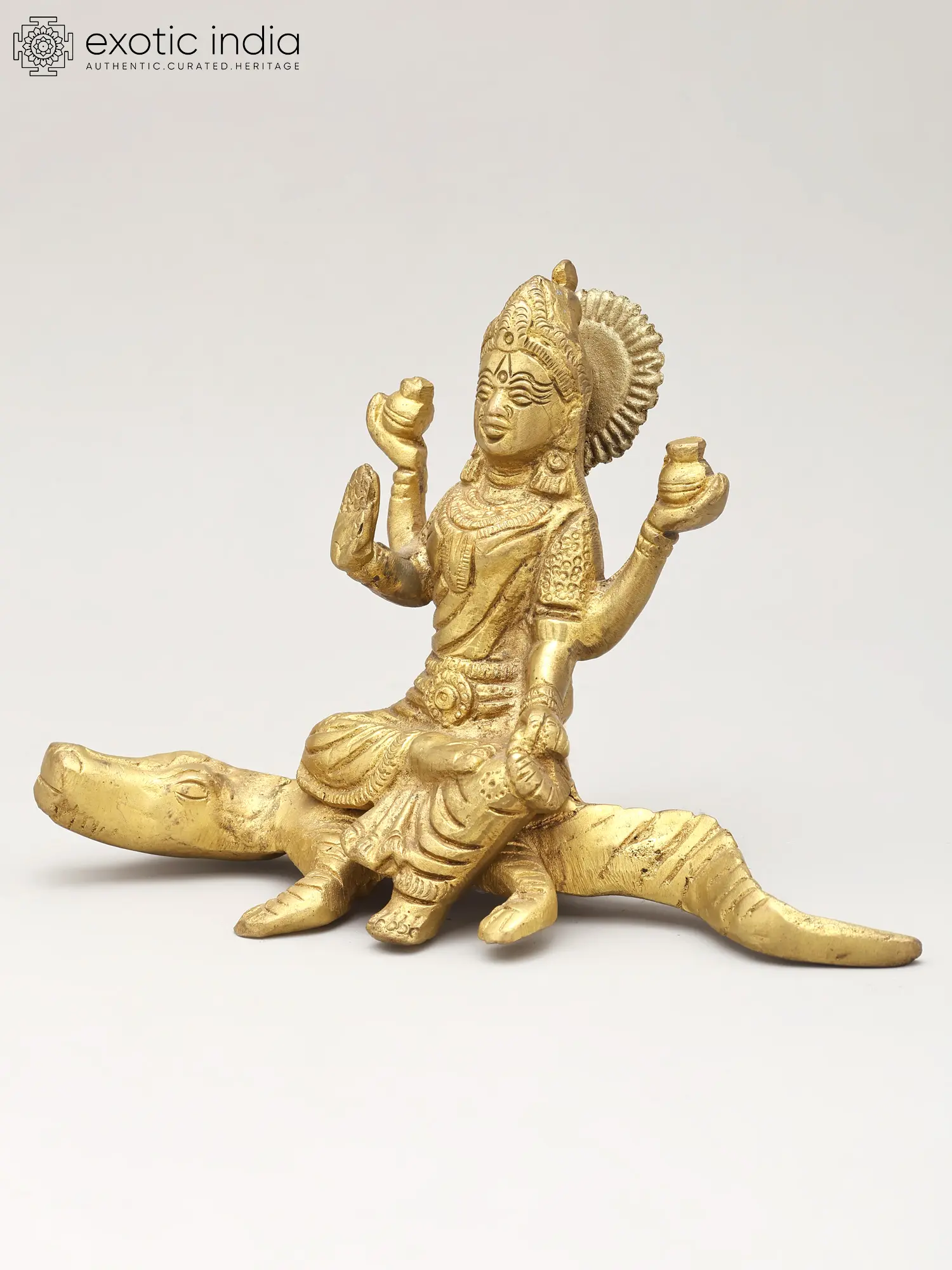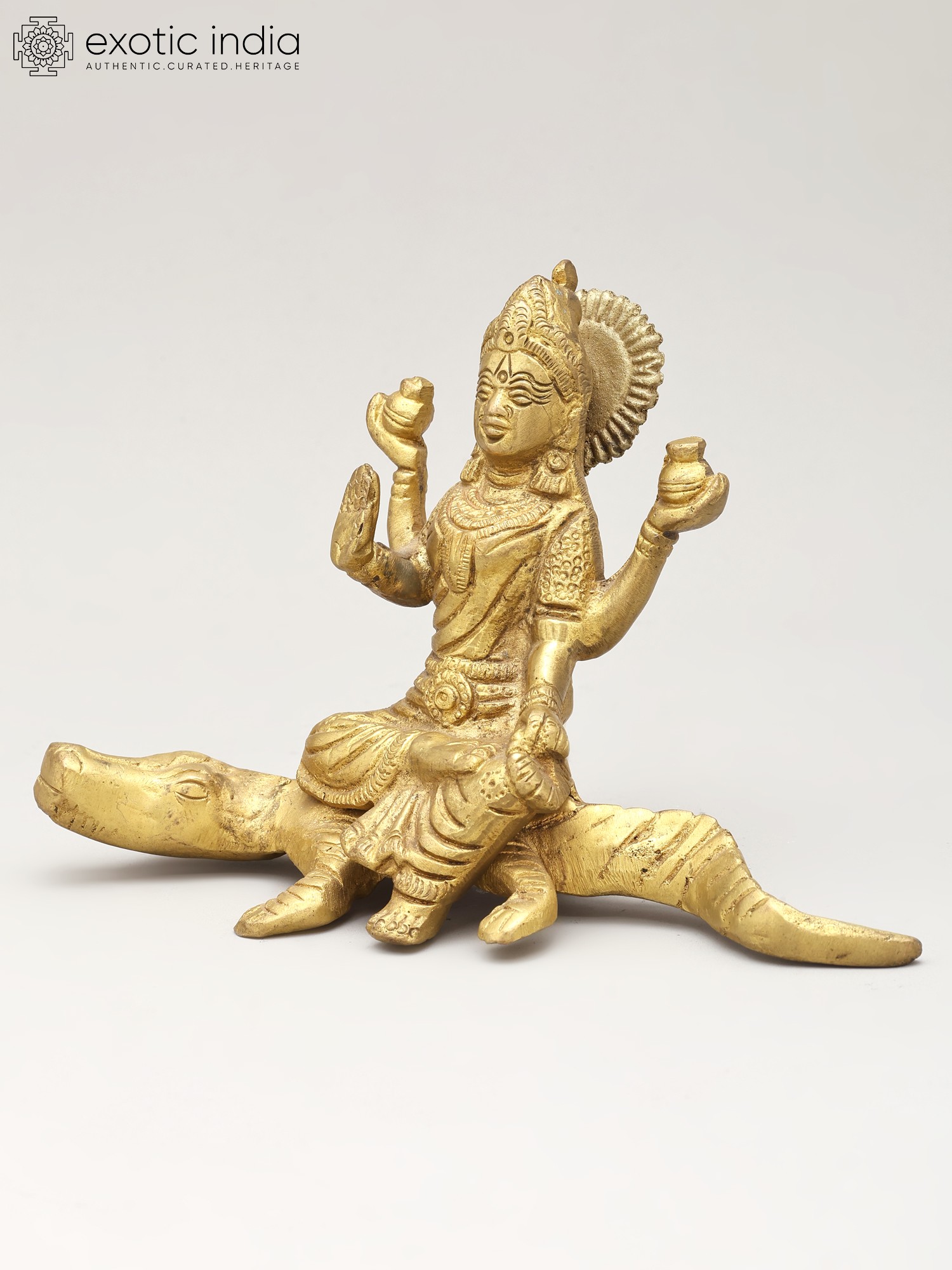 This sculpture vividly portrays Ganga, the personification of the sacred River Ganges, one of the most revered goddesses in Hinduism. Her association with the crocodile, or Makara, symbolizes her dominion over the powerful waters and the creatures within them. This imagery evokes purification, life-giving sustenance, and the cleansing power of her divine flow, connecting you to ancient narratives of cosmic order and spiritual renewal.