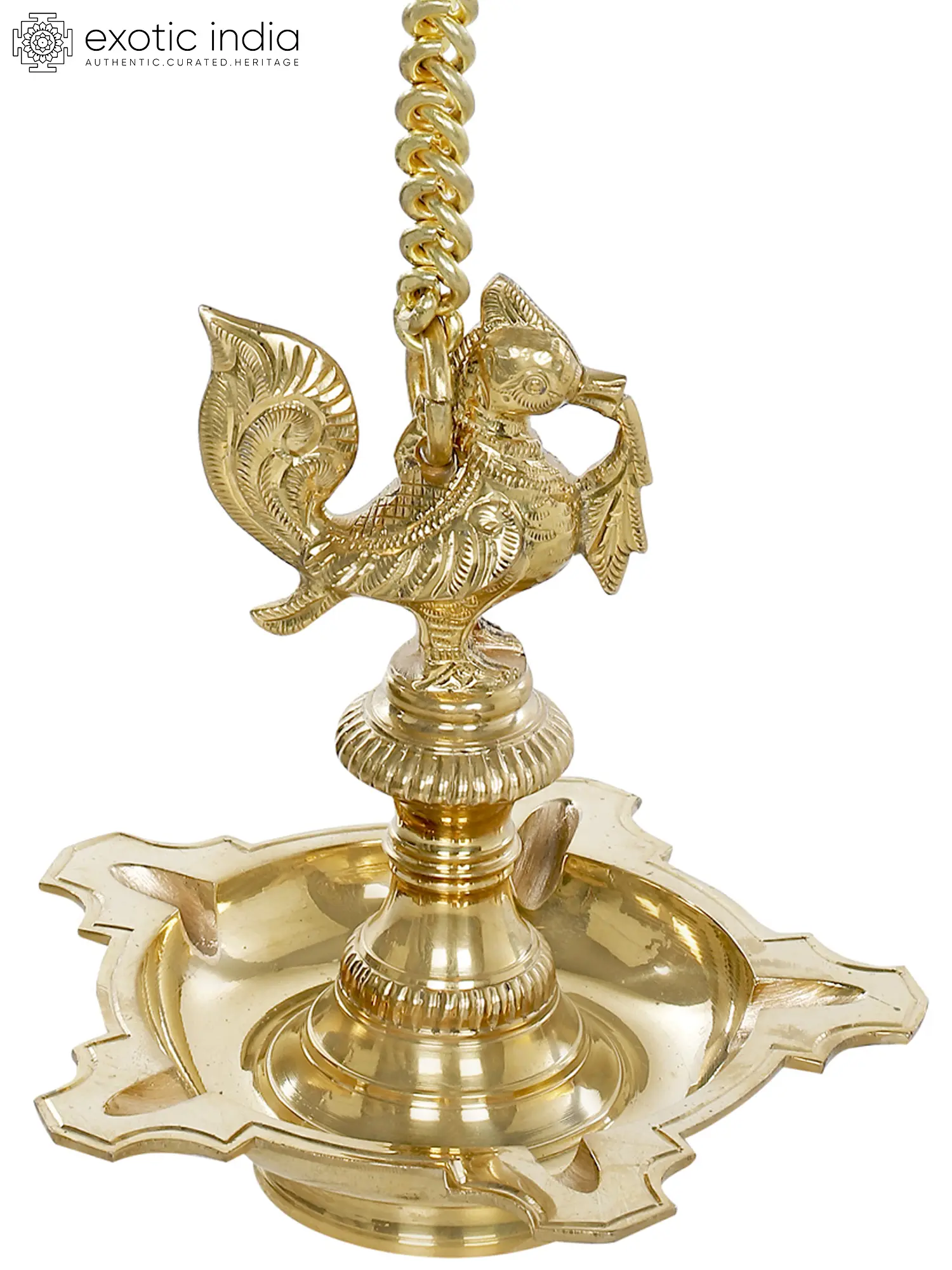 The Roof Hanging Peacock Lamp is a captivating work of art, handcrafted with care in Brass and made in India. This lamp is not just a source of light; it's a symbol of grandeur, spirituality, and exceptional craftsmanship. The peacock, with its beauty and grace, represents the dissolution of ego and vanity, integral concepts in the Indian tradition. As you light this lamp, you're not just illuminating your space; you're invoking divine grace and blessings. Hang this Roof Hanging Peacock Lamp in your home, and let its ethereal charm and spiritual significance enchant your surroundings.