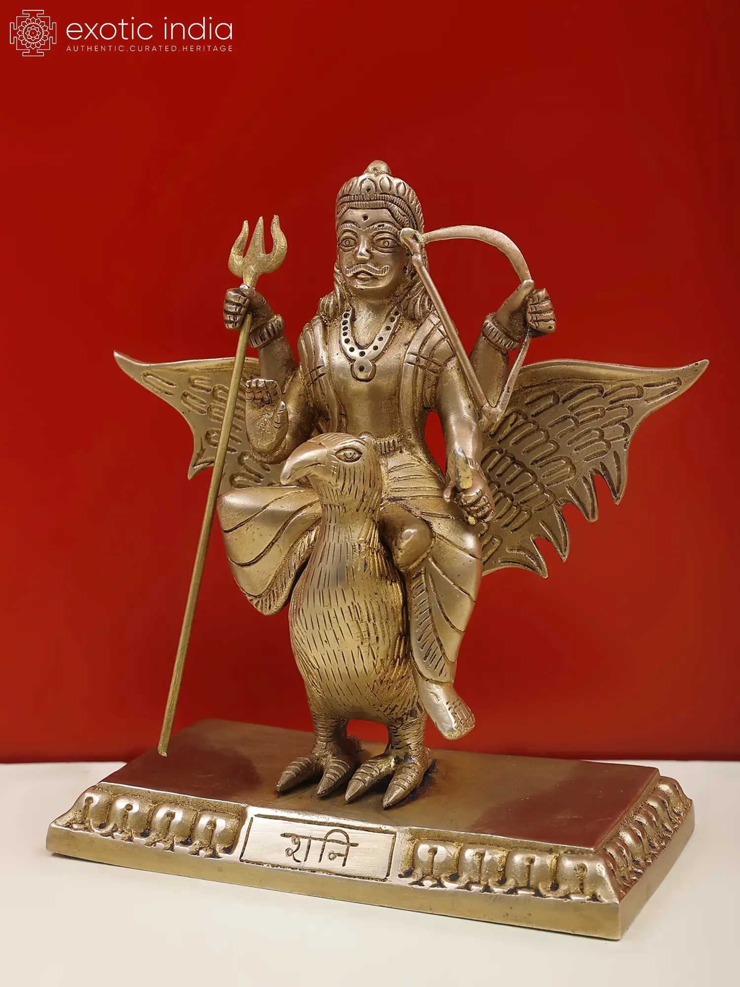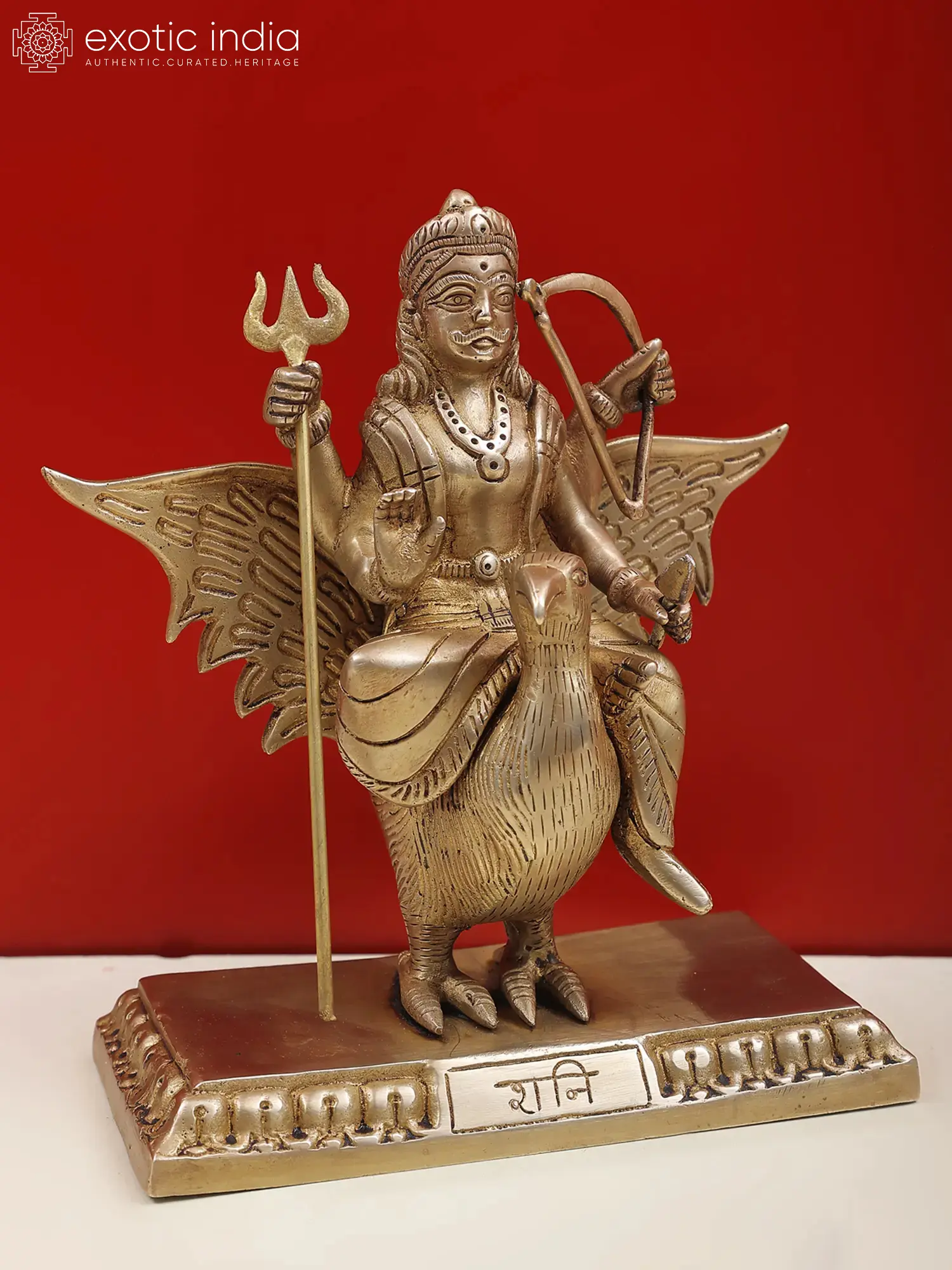This finely cast brass sculpture portrays Shani in his iconic form. He is seated majestically upon his vahana, the crow, a symbol of mystery, transformation, and the ability to navigate both the seen and unseen realms. The crow's keen eyesight and ability to find hidden things resonate with Shani's omniscience and his role in revealing truths. Shani is depicted with multiple arms, each holding significant iconography. In his hands, he typically wields a trident (Trishula), representing his power to destroy obstacles and illusions; a bow and arrow, symbolizing his aim and precision in delivering justice; and sometimes other celestial weapons. His presence on the crow signifies his dominion over the earthly plane and his ability to traverse vast distances, both physically and spiritually. The deity’s powerful stance and regal adornments underscore his divine authority and cosmic significance. In Hindu mythology, Shani is often described as the son of Surya (the Sun God) and Chhaya (Shadow). His story is one of struggle and immense spiritual discipline. He is said to have received his powers and position from Lord Shiva, who blessed him with the lordship of a planet and the ability to influence human lives through karma. His transit through astrological houses is closely observed, as it is believed to bring significant transformations, lessons, and tests to individuals, often referred to as 'Sade Sati' or 'Dhaiya'. This statue serves as a powerful reminder of these profound cosmic principles, inviting contemplation on the nature of destiny, duty, and the unfolding of karma.